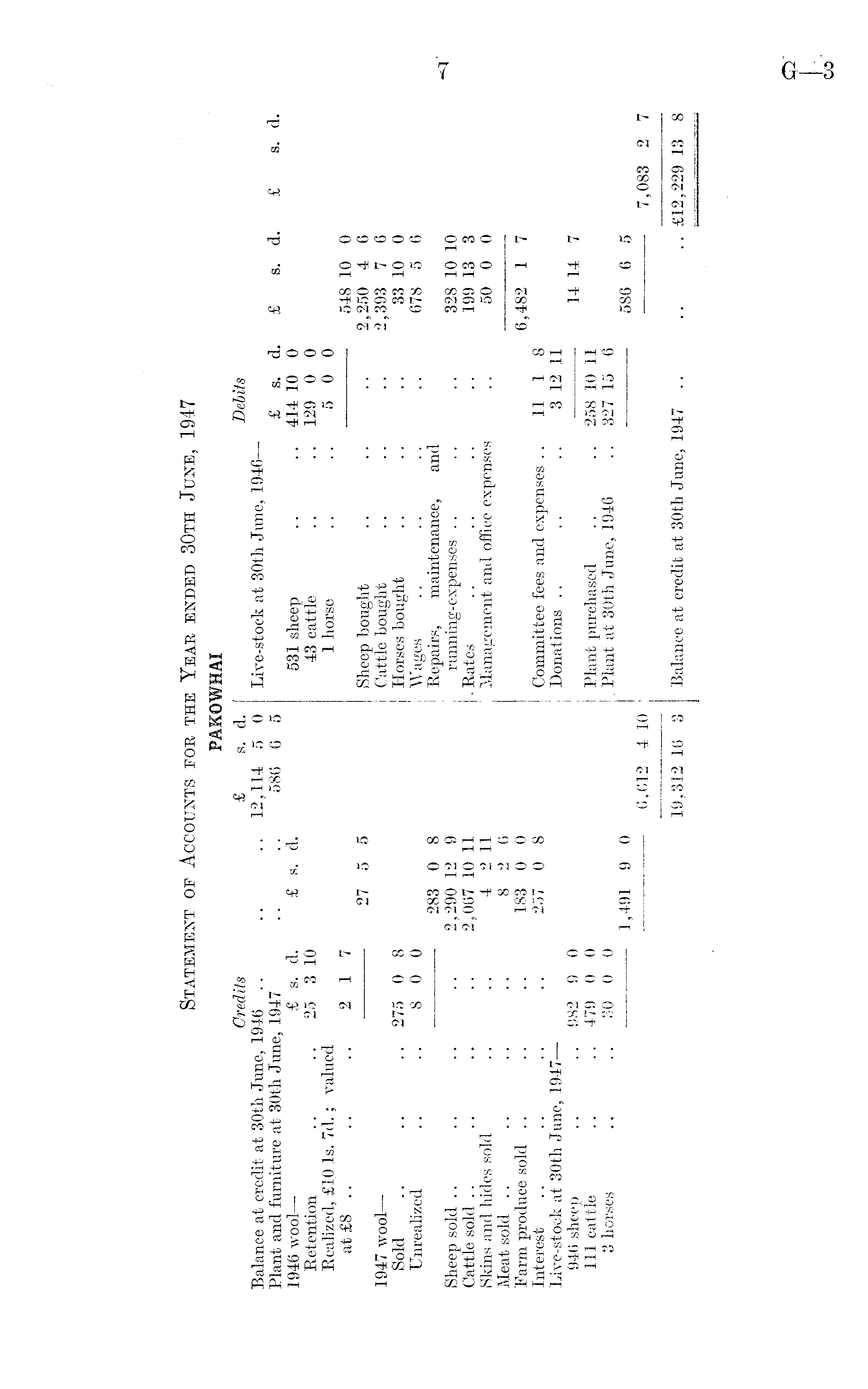 Statement op Accounts for the Year ended 30th June, 1947 PAKOWHAI Credits £ s. d. Debits Balance at credit at 30th June, 1946 .. .. .. 12,114 5 0 Live-stock at 30th June, 1946— Plant and furniture at 30th June, 1947 .. .. 586 6 5 £ s. d. £ s. d. £ s. d. 1946 wool— £ s. d. £ s. d. 531 sheep .. .. 414 10 0 Retention .... 25 3 10 43 cattle .. .. 129 0 0 Realized, £lO Is. 7d.; valued 1 horse .. .. 5 0 0 at £8 .... ..2 1 7 548 10 0 27 5 5 Sheep bought .. .. .. 2,250 4 6 1947 wool— Cattle bought .. .. 2,393 7 6 Sold .. .. .. 275 0 8 Horses bought .. .. .. 33 10 0 Unrealized .. .. 8 0 0 Wages .. .. .. .. 678 5 6 283 0 8 Repairs, maintenance, and Sheep sold .. .. .. .. 2,290 12 9 running-expenses .. .. .. 328 10 10 Cattle sold .. .. .. .. 2,067 10 11 .Rates .. .. .. .. 199 13 3 Skins and hides sold .. .. 4 2 11 Management and office expenses .. 50 0 0 Meat sold .. .. .. .. 8 2 6 Farm produce sold .. .. .. 183 0 0 6,482 1 7 Interest .. .. .. .. 257 0 8 Committee fees and expenses .. 11 1 8 Live-stock at 30th June, 1947— Donations .. .. .. 3 12 11 946 sheep .. .. 982 9 0 14 14 7 111 cattle .. .. 479 0 0 Plant purchased .. .. 258 10 11 3 horses .. 30 0 0 Plant at 30th- June, 1946 .. 327 15 6 — 1,491 9 0 586 6 5 6,612 4 10 7,083 2 7 19,312 16 3 Balance at credit at 30 th June, 1947 .. .. £12,229 13 8
