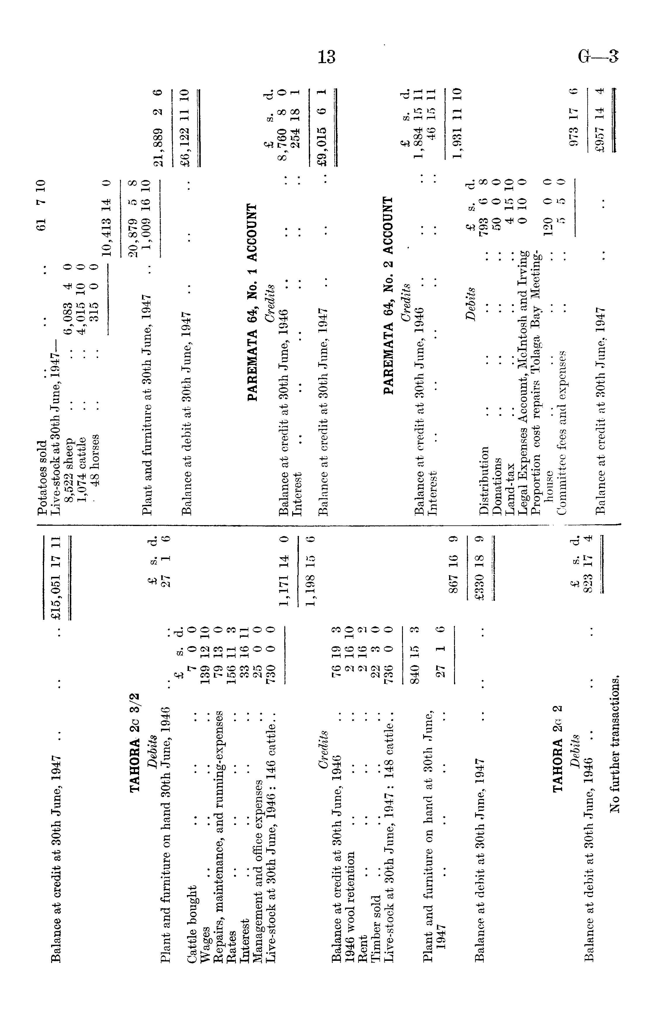 Potatoes sold .. .. .. 61 7 10 Balance at credit at 30th June, 194-7 .. .. .. £15,051 17 11 Live-stoek at 30th June, 1947— ■ 8,522 sheep .. .. 6,083 4 0 I,o74,cattle . . .. 4,015 10 0 • 48 horses .. .. 315 0 0 10,413 14 0 TAHORA 2c 3/2 20,879 5 8 Debits £s. d. Plant and furniture at 30th June, 1947 .. 1,009 16 10 q r Plant and furniture on hand 30th June, 1946 .. .. 27 1 6 ' Cattle bought .. .. *0 Balance at debit at 30th June, 1947 .. .. .. £6,122 11 10 Wages .. .! 139 12 10 ====. Repairs, maintenance, and running-expenses 79 13 0 Rates .. .. .. .. 156 11 3 Management and office expenses " 11 " " PAREMATA 64, No. 1 ACCOUNT Live-stock at 30th June, 1946: 146 cattle.. 730 0 0 Credits £ s. d. 1,171 14 0 Balance at credit at 30th June, 1946 .. .. .. 8,760 8 0 lnterest .. .. .. .. .. • • 254 18 1 1,198 15 6 Credits Balance at credit at 30th June, 1947 .. .. .. £9,015 6 1 Balance at credit at 30th June, 1946 .. 76 19 3 ==■ 1946 wool retention .. .. .. 2 16 10 Rent .. .. .. .. 2 16 2 Timber sold .. .. .. .. 22 3 0 Live-stock at 30th June, 1947: 148 cattle.. 736 0 0 PAREMATA 64, No. 2 ACCOUNT ——— Credits • £ s. d. Balance at credit at 30th June, 1946 .. .. .. 1,884 15 11 Plant and furniture on hand at 30th June, Interest .. 46 15 11 867 16 9 1>931 n 10 — T)pJ)Q,f,R £ s. d. Balance at debit at 30th June, 1947 .. .. .. £330 18 9 Distribution .. .. 793 6 8 £) ona tions .. .. .. .. 50 0 0 Land-tax .. .. .. .. 4 15 10 Legal Expenses Account, Mcintosh and Irving 0 10 0 Proportion cost repairs Tolaga Bay Meeting--9 o house .. .. .. .. 120 0 0 TAHORA 2g 2 Committee fees and expenses .. .. 5 5 0 Debits £ s. d. 973 17 6 Balance at debit at 30th June, 1946 .. .. .. 823 17 4 Balance at credit at 30th June, 1947 ~ . • £957 14 4 No further transactions. >
