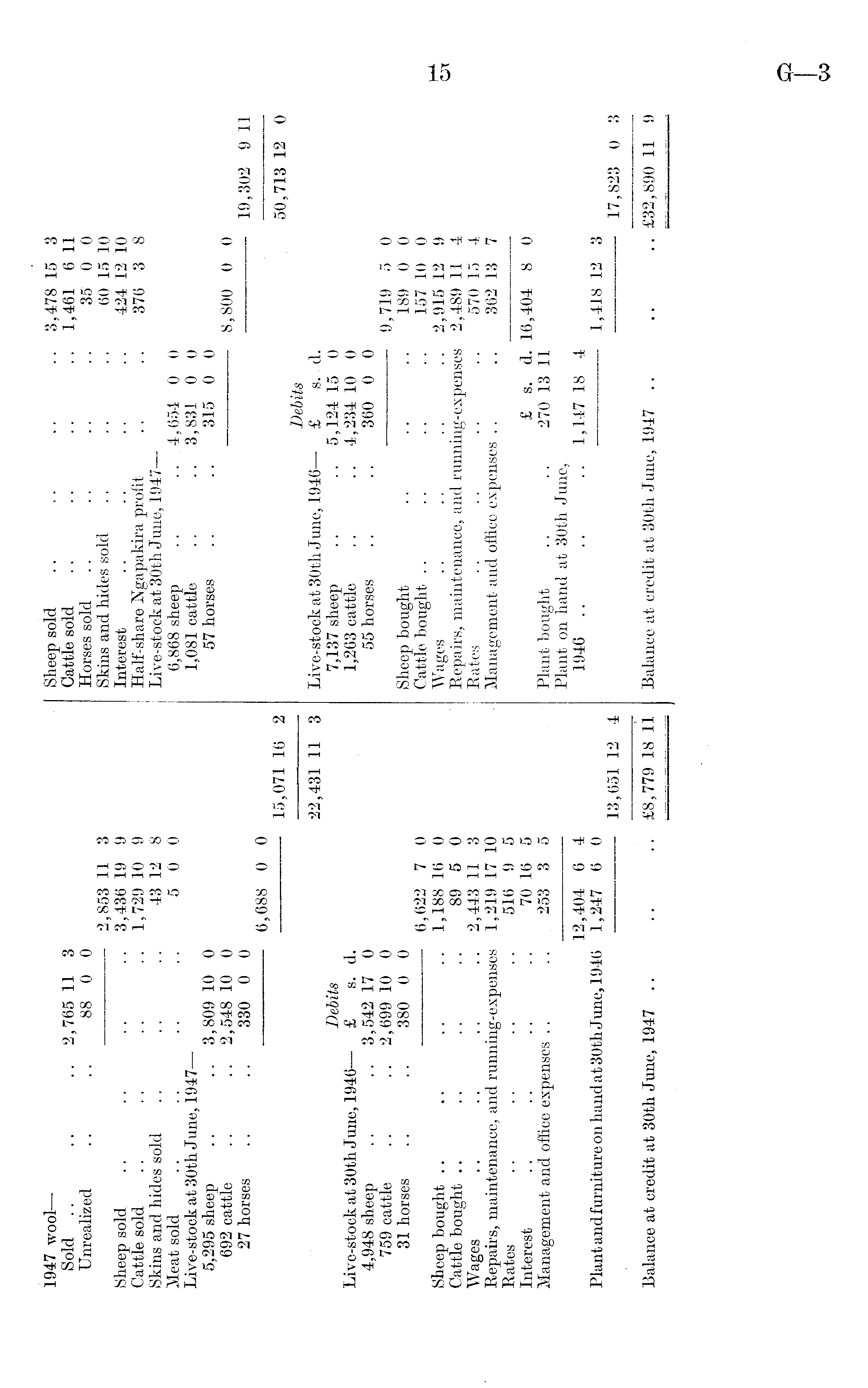 1947 wooi— Sheep soid .. .. .. .. 3,478 15 3 Sold .. .. .. 2,765 11 3 Cattle sold .. .. .. .. 1,461 6 11 Unrealized .. .. 88 0 0 Horses sold .. .. .. .. 35 0 0 2,853 11 3 Skins and hides sold .. .. .. 60 15 10 Sheep sold .. .. .. .. 3,436 19 9 Interest .. .. .. .. 424 12 10 Cattle sold .. .. .. .. 1,729 10 9 Half-share Ngapakira profit .. .. 376 3 8 Skins and hides sold .. .. .. 43 12 8 Live-stock at 30th June, 1947— Meat sold .. .. .. .. 5 0 0 6,868 sheep .. .. 4,654 0 0 Live-stock at 30th June, 1947— 1,081 cattle .. .. 3,831 0 0 5,295 sheep .. .. 3,809 10 0 57 horses .. .. 315 0 0 692 cattle .. .. 2,548 10 0 8,800 0 0 27 horses .. .. 330 0 0 19,302 9 11 6,688 0 0 r 15,071 16 2 50,713 12 0 Debits 22,431 11 3 Live-stock at 30th June, 1946— £ s. d. Debits 7,137 sheep .. .. 5,124 15 0 Live-stock at 30th June, 1946— £ s. d. 1,263 cattle .. .. 4,234 10 0 4,948 sheep .. .. 3,542 17 0 55 horses .. .. 360 0 0 759 cattle .. .. 2,699 10 0 9,719 5 0 31 horses .. .. 380 0 0 Sheep bought .. .. .. 189 0 0 6,622 7 0 Cattle bought .. .. .. .. 157 10 0 Sheep bought .. .. .. .. 1,188 16 0 Wages .. .. .. .. 2,915 12 9 Cattle bought .. .. .. .. 89 5 0 Repairs, maintenance, and running-expenses 2,489 11 4 Wages .. .. .. .. 2,443 11 3 Rates .. .. .. .. 570 15 4 Repairs, maintenance, and running-expenses 1,219 17 10 ■ Management and office expenses .. .. 362 13 7 Rates ........ 516 9 5 Interest ........ 70 16 5 £ s. d. 16,404 8 0 Management and office expenses .. .. 253 3 5 Plant bought .. .. 270 13 11 Plant on hand at 30th June, . 12,404 6 4 1946 .. .. .. 1,14718 4 Plant and furniture on hand at 30th June, 1946 1,247 6 0 1,418 12 3 13,651 12 4 - 17,823 0 3 Balance at credit at 30th June, 1947 ~ .. .. £8,779 18 11 Balance at credit at 30th June, 1947 .. .. .. £32,890 11 9