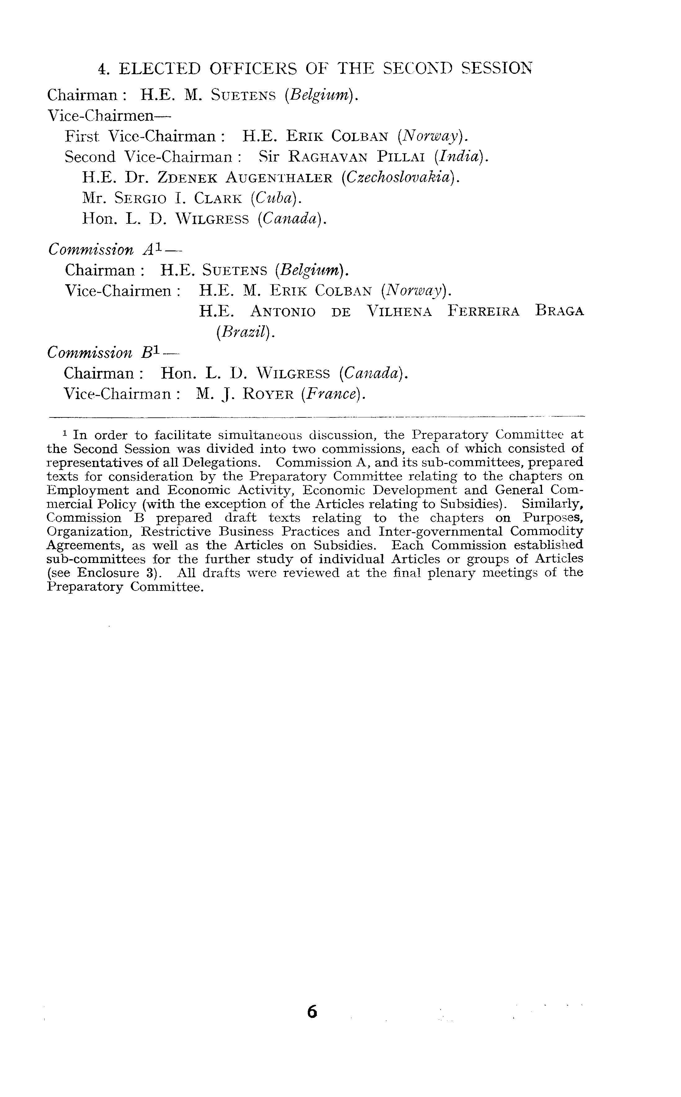 4. ELECTED OFFICERS OF THE SECOND SESSION Chairman : H.E. M. Suetens (Belgium). Vice-Chairmen — First Vice-Chairman : H.E. Erik Colban (Norway). Second Vice-Chairman : Sir Raghavan Pillai (India). H.E. Dr. Zdenek Augenthaler (Czechoslovakia). Mr. Sergio I. Clark (Cuba). Hon. L. D. Wilgress (Canada). Commission A 1 Chairman : H.E. Suetens (Belgium). Vice-Chairmen : H.E. M. Erik Colban (Norway). H.E. Antonio de Vilhena Ferreira Braga (Brazil). Commission B 1 Chairman: Hon. L. D. Wilgress (Canada). Vice-Chairman : M. J. Royer (France).
