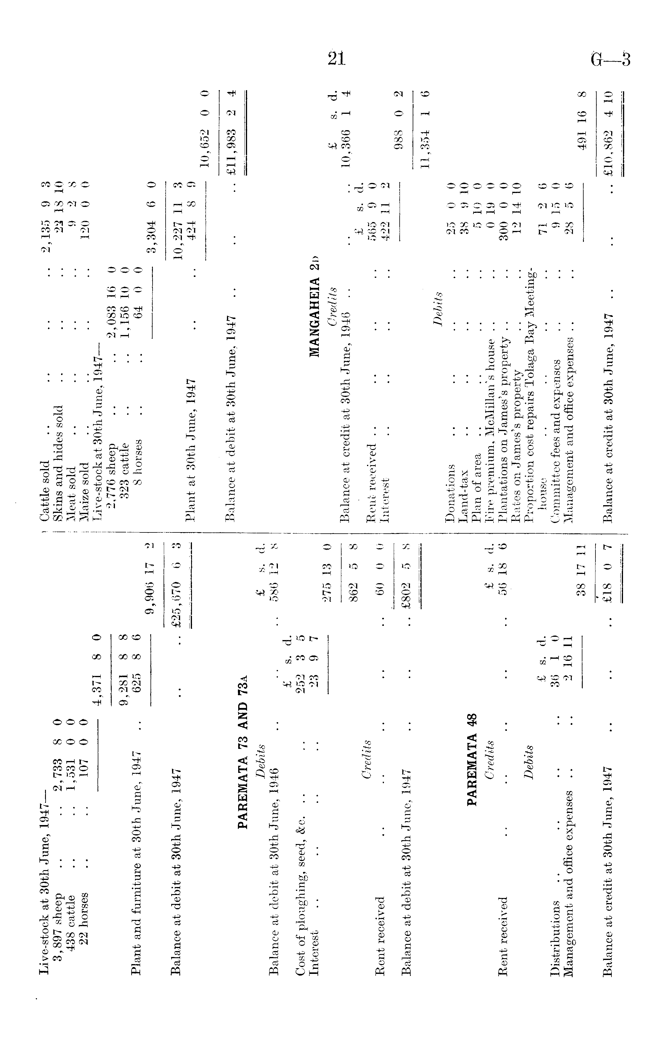 Live-stock at 30th June, 1947— Cattle sold .. .. .. .. 2,135 9 3 3,897 sheep .. .. 2,733 8 0 Skins and hides sold .. .. .. 22 18 10 438 cattle .. .. 1,531 0 0 Meat sold .. .. .. .. 9 2 8 22 horses .. .. 107 0 0 Maize sold .. . . .. .. 120 0 0 4,371 8 0 Live-stock at 30th June, 1947— 2,776 sheep .. .. 2,083 16 0 9,281 8 8 323 cattle .. .. 1,156 10 0 Plant and furniture at 30th June, 1947 .. 625 8 6 8 horses .. .. 64 0 0 9,906 17 2 3,304 6 0 Balance at debit at 30th June, 1947 .. .. £25,670 6 3 10,227 11 3 — l ■ Plant at 30th June, 1947 .. .. 424 8 9 10,652 0 0 Balance at debit at 30th June, 1947 .. .. .. £11,983 2 4 PAREMATA 73 AND 73a __ Debits £ s. d. Balance at debit at 30th June, 1946 .. .. .. 586 12 8 £ s. d. Cost of ploughing, seed, &c. .. .. 252 3 5 Interest 23 9 7 MANGAHEIA 2d 275 13 0 Credits £ s. d. ~ Balance at credit at 30th June, 1946 .. .. .. 10,366 1 4 obz 00. £ s. d. _ , . , Credits Rent received .. .. .. .. 565 9 0 Rent received .. .. .. .. .. 60 0 0 Interest . . .. .. .. 422 11 2 : QOQ rv o Balance at debit at 30th June, 1947 .. .. .. £BO2 5 8 ===== 11,354 1 6 Debits Donations .. .. .. .. 25 0 0 T. A A r-1 A Land-tax .. .. .. .. 38 9 10 PAREMATA 48 Plan of area _ _ _ _ 5 10 0 Credits £ s. d. Fire premium, McMillan's house .. .. 0 19 0 Rent received .. .. .. .. .. 56 18 6 Plantations on James's property .. . . 300 0 0 Rates on James's property .. .. 12 14 10 Debits Proportion cost repairs Tolaga Bay Meeting- £ s. d. house .. .. .. .. 7126 Distributions .. .. .. .. 36 1 0 Committee fees and expenses .. .. 9 15 0 Management and office expenses .. .. 2 16 11 Management and office expenses .. .. 28 5 6 3B 17 11 491 16 8 Balance at credit at 30th June, 1947 .. .. .. £lB 0 7 Balance at credit at 30th June, 1947 .. .. .. £10,862 4 10