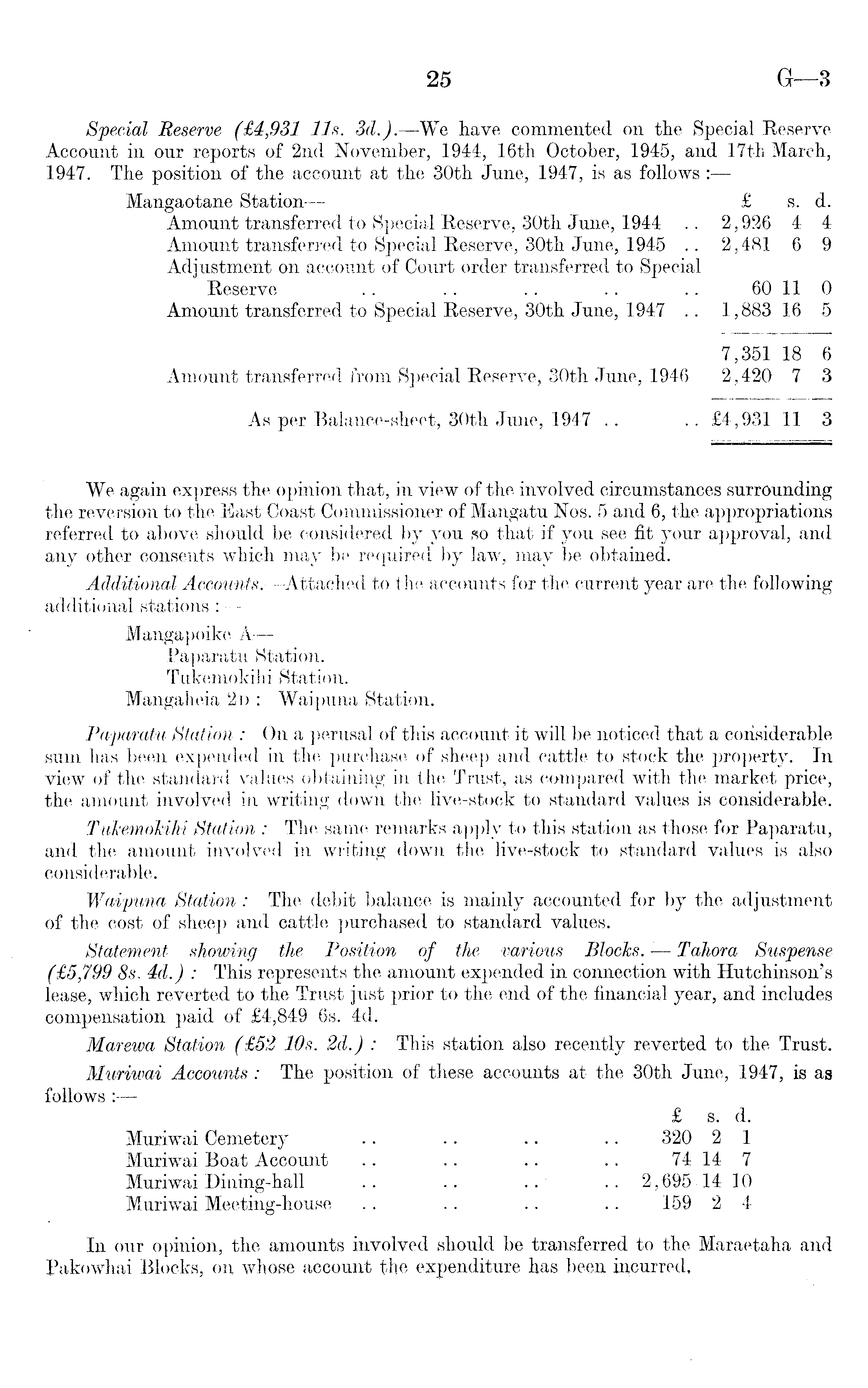 Special Reserve (£4,931 lis. 3d.). —We have commented on the Special Reserve Account in our reports of 2nd November, 1944, 16th October, 1945, and 17th March, 1947. The position of the account at the 30th June, 1947, is as follows : Mangaotane Station- — £ s. d. Amount transferred to Special Reserve, 30th June, 1944 .. 2,926 4 4 Amount transferred to Special Reserve, 30th June, 1945 .. 2,481 6 9 Adjustment on account of Court order transferred to Special Reserve .. .. .. .. .. 60 11 0 Amount transferred to Special Reserve, 30th June, 1947 .. 1,883 16 5 7,351 18 6 Amount transferred from Special Reserve, 30th June, 1946 2,420 7 3 As per Balance-sheet, 30th June, 1947 .. .. £4,931 11 3 We again express the opinion that, in view of the involved circumstances surrounding the reversion to the East Coast Commissioner of Mangatu Nos. 5 and 6, the appropriations referred to above should be considered by you so that if you see fit your approval, and any other consents which may be required by law, may be obtained. Additional Accounts.—Attached to the accounts for the current year are the following additional stations : Mangapoike A— Paparatu Station. Tukemokihi Station. Mangaheia 2d : Waipuna Station. Paparatu Station : On a perusal of this account it will be noticed that a considerable sum has been expended in the purchase of sheep and cattle to stock the property. In view of the standard values obtaining in the Trust, as compared with the market price, the amount involved in writing down the live-stock to standard values is considerable. Tukemokihi Station : The same remarks apply to this station as those for Paparatu, and the amount involved in writing down the live-stock to standard values is also considerable. Waipuna Station : The debit balance is mainly accounted for by the adjustment of the cost of sheep and cattle purchased to standard values. Statement showing the Position of the various Blocks. Tahora Suspense (£5,799 Bs. 4d.) : This represents the amount expended in connection with Hutchinson's lease, which reverted to the Trust just prior to the end of the financial year, and includes compensation paid of £4,849 6s. 4d. Marewa Station (£52 10s. 2d.) : This station also recently reverted to the Trust. Muriwai Accounts : The position of these accounts at the 30th June, 1947, is as follows : £ s. d. Muriwai Cemetery .. .. .. .. 320 2 1 Muriwai Boat Account .. .. .. .. 74 14 7 Muriwai Dining-hall .. .. .. .. 2,695 14 10 Muriwai Meeting-house .. .. .. .. 159 2 4 In our opinion, the amounts involved should be transferred to the Maraetaha and Pakowhai Blocks, on whose account the expenditure has been incurred.