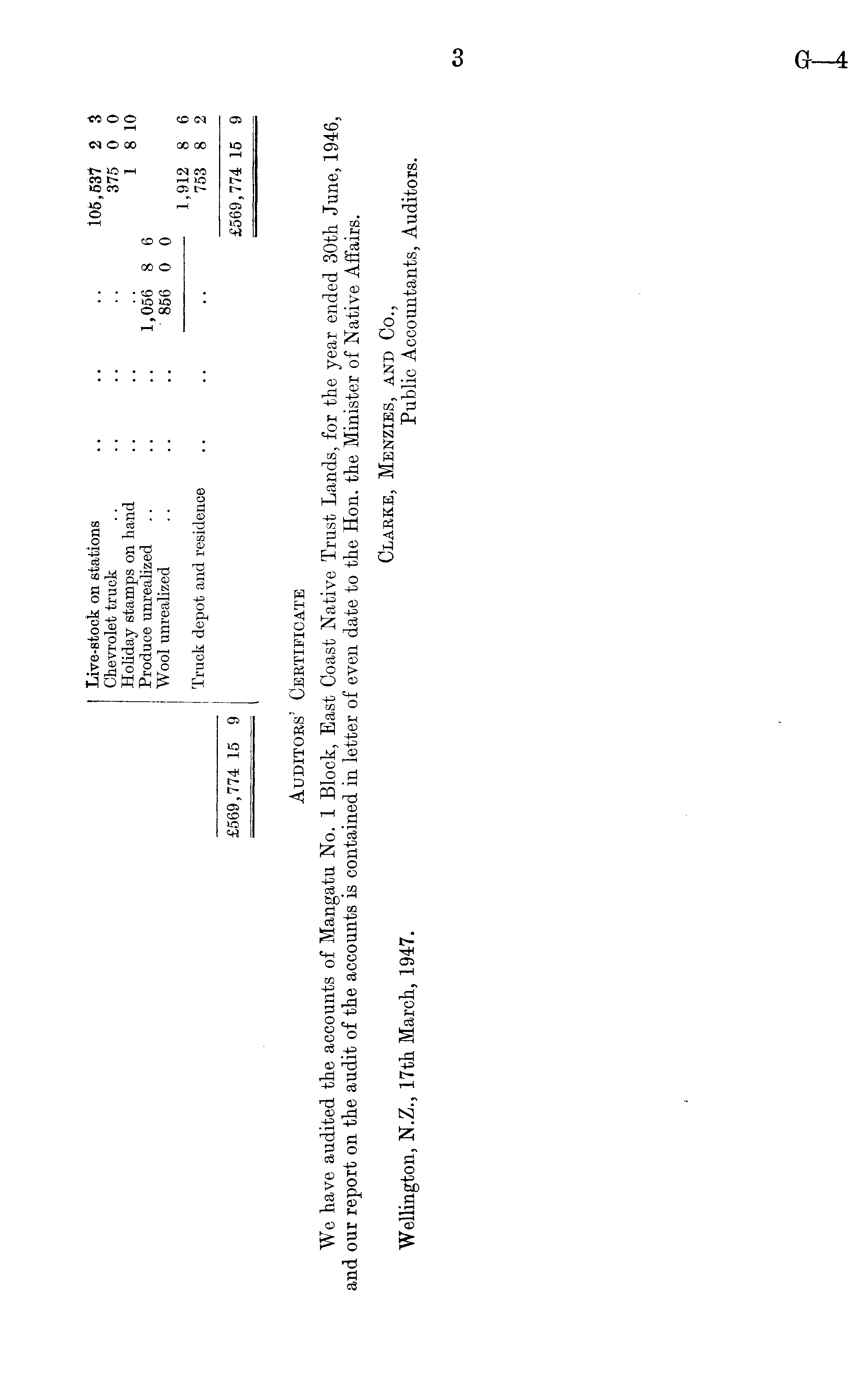 Live-stock on stations .. .. .. 105,53? 2 3 Chevrolet truck .. .. .. .. 375 0 0 Holiday stamps on hand .. .. .. 1 8 10 Produce unrealized .. .. .. 1,056 8 6 Wool unrealized .. .. .. 856 0 0 1,912 8 6 Truck depot and residence .. .. .. 753 8 2 £569,774 15 9 £569,774 15 9 Auditors' Certificate We have audited the accounts of Mangatu No. 1 Block, East Coast Native Trust Lands, for the year ended 30th June, 1946, and our report on the audit of the accounts is contained in letter of even date to the Hon. the Minister of Native Affairs. Clarke, Menzies, and Co., Wellington, N.Z., 17th March, 1947. Public Accountants, Auditors.