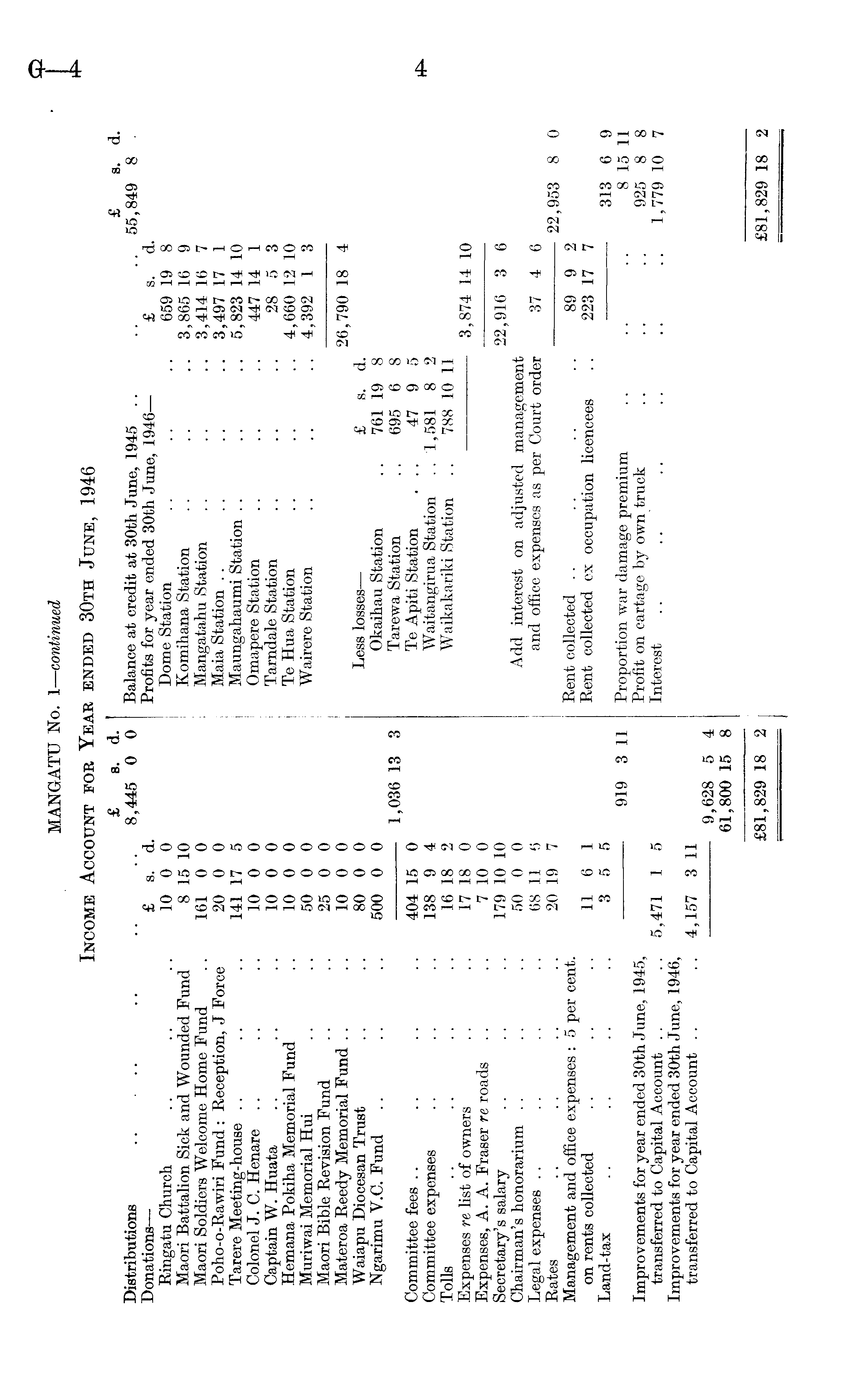 MANGATU No. I— continued Income Account for Year ended 30th June, 1946 £ b. d. | £ s. d. Distributions .. .. .. 8,445 0 0 Balance at credit at 30th June, 1945 .. .. .. 55,849 8 Donations— £ s. d. Profits for year ended 30th June, 1946— £ s. d. Ringatu Church .. .. .. 10 0 0 Dome Station . . . . .. 659 19 8 Maori Battalion Sick and Wounded Fund 8 15 10 j Komihana Station .. .. .. 3,865 16 9 Maori Soldiers Welcome Home Fund .. 161 0 0 i Mangatahu Station .. .. .. 3,414 16 7 Poho-o-Rawiri Fund : Reception, J Force 20 0 0 Maia Station .. .. .. .. 3,497 17 1 Tarere Meeting-house .. .. .. 141 17 5 Maungahaumi Station .. .. .. 5,823 14 10 Colonel J. C. Henare .. .. .. 10 0 0 Omapere Station .. .. .. 447 14 1 Captain W. Huata .. .. .. 10 0 0 Tarndale Station .. .. .. 28 5 3 Hemana Pokiha Memorial Fund .. 10 0 0 Te Hua Station .. .. .. 4,660 12 10 Muriwai Memorial Hui .. .. 50 0 0 Wairere Station .. .. .. 4,392 1 3 Maori Bible Revision Fund . . .. 25 0 0 Materoa Reedy Memorial Fund .. .. 10 0 0 26,790 18 4 Waiapu Diocesan Trust . . .. 80 0 0 Less losses— £ s. d. Ngarimu Y.C. Fund .. .. .. 500 0 0 Okaihau Station .. 761 19 8 1,036 13 3 Tarewa Station .. 695 6 8 Committee fees .. .. .. .. 404 15 0 Te Apiti Station ... 47 9 5 Committee expenses .. .. .. 138 9 4 Waitangirua Station .. 1,581 8 2 Tolls .. .. .. .. 16 18 2 Waikakariki Station .. 788 10 11 Expenses re list of owners .. .. 17 18 0 3,874 14 10 Expenses, A. A. Fraser re roads .. .. 7 10 0 Secretary's salary .. .. .. 179 10 10 22,916 3 6 Chairman's honorarium . . . . .. 50 0 0 Add interest on adjusted management Legal expenses .. .. . . .. 68 11 6 and office expenses as per Court order 37 4 6 Rates .. .. .. .. 20 19 7 22,953 8 0 Management and office expenses: 5 per cent. Rent collected . . . . .. .. 89 9 2 on rents collected .. .. . . 116 1 Rent collected ex occupation licencees .. 223 17 7 Land-tax . . .. .. .. 3 5 5 313 6 9 919 3 11 Proportion war damage premium .. .. .. 8 15 11 Improvements for year ended 30th June, 1945, Profit on cartage by own truck .. .. .. 925 8 8 transferred to Capital Account .. .. 5,471 1 5 Interest .. .. .. .. .. .. 1,779 10 7 Improvements for year ended 30th June, 1946, transferred to Capital Account .. .. 4,157 3 11 9,628 5 4 61,800 15 8 £81,829 18 2 j £81,829 18 2