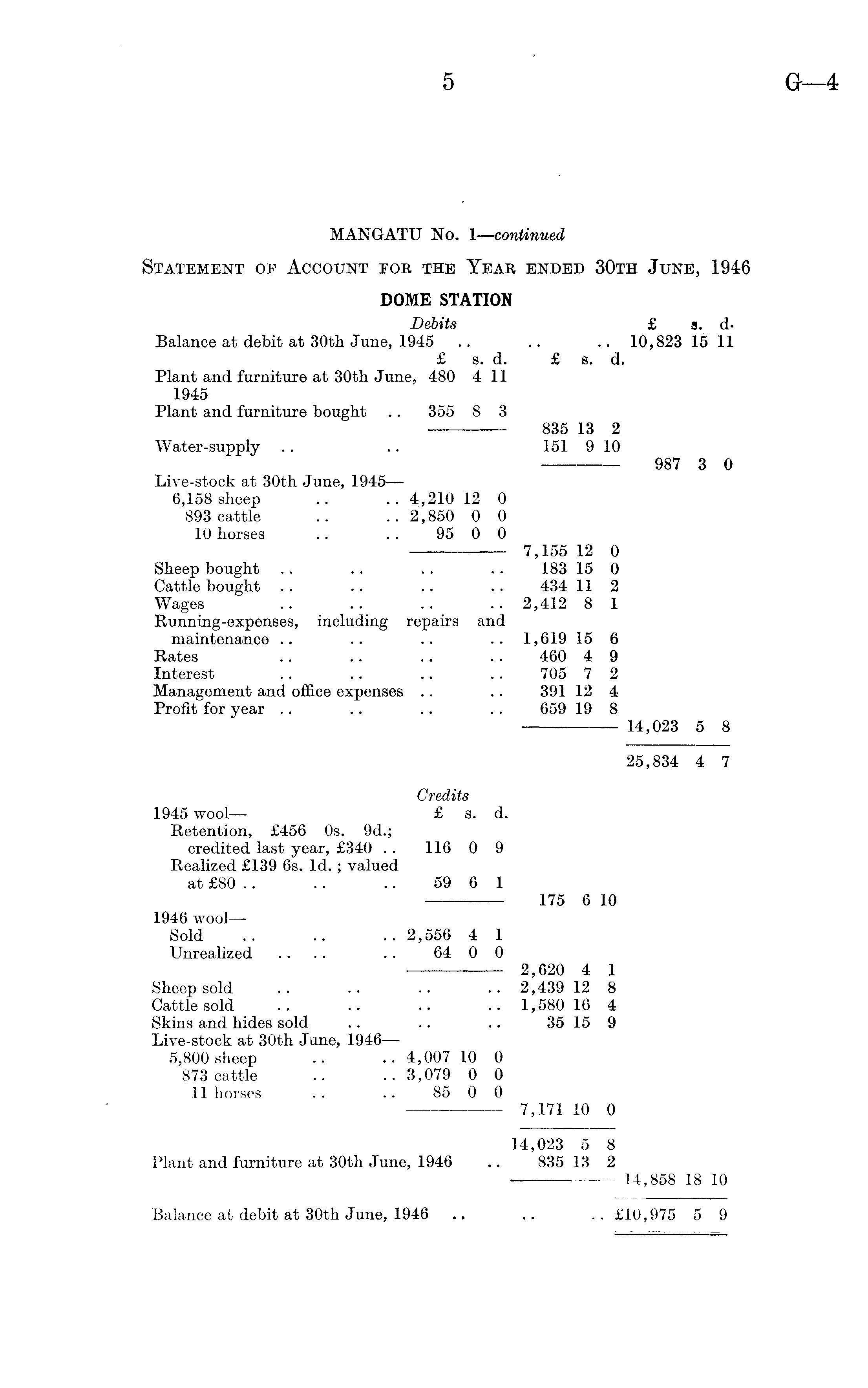 MANGATU No. I—continued Statement of Account foe the Year ended 30th June, 1946 DOME STATION Debits £ s. dBalance at debit at 30th June, 1945 .. .. .. 10,823 15 11 £ s. d. £ s. d. Plant and furniture at 30th June, 480 4 11 1945 Plant and furniture bought .. 355 8 3 835 13 2 Water-supply .. .. 151 910 987 3 0 Live-stock at 30th June, 1945 — 6,158 sheep .. .. 4,210 12 0 893 cattle .. .. 2,850 0 0 10 horses .. .. 95 0 0 7,155 12 0 Sheep bought .. .. .. .. 183 15 0 Cattle bought .. .. .. .. 434 11 2 Wages .. .. .. .. 2,412 8 1 Running-expenses, including repairs and maintenance .. .. .. .. 1,619 15 6 Rates .. .. .. .. 460 4 9 Interest .. .. .. .. 705 7 2 Management and office expenses .. .. 391 12 4 Profit for year .. .. .. .. 659 19 8 14,023 5 8 25,834 4 7 Credits 1945 wool — £ s. d. Retention, £456 os. 9d.; credited last year, £340 .. 116 0 9 Realized £139 6s. Id.; valued at £BO .. .. .. 59 6 1 175 6 10 1946 wool — Sold .. .. .. 2,556 4 1 Unrealized .... .. 64 0 0 2,620 4 1 Sheep sold .. .. .. .. 2,439 12 8 Cattle sold .. .. .. .. 1,580 16 4 Skins and hides sold .. .. .. 35 15 9 Live-stock at 30th June, 1946 — 5,800 sheep .. .. 4,007 10 0 873 cattle .. .. 3,079 0 0 11 horses .. .. 85 0 0 7,171 10 0 14,023 5 8 Plant and furniture at 30th June, 1946 .. 835 13 2 14,858 18 10 Balance at debit at 30th June, 1946 .. .. .. £10,975 5 9