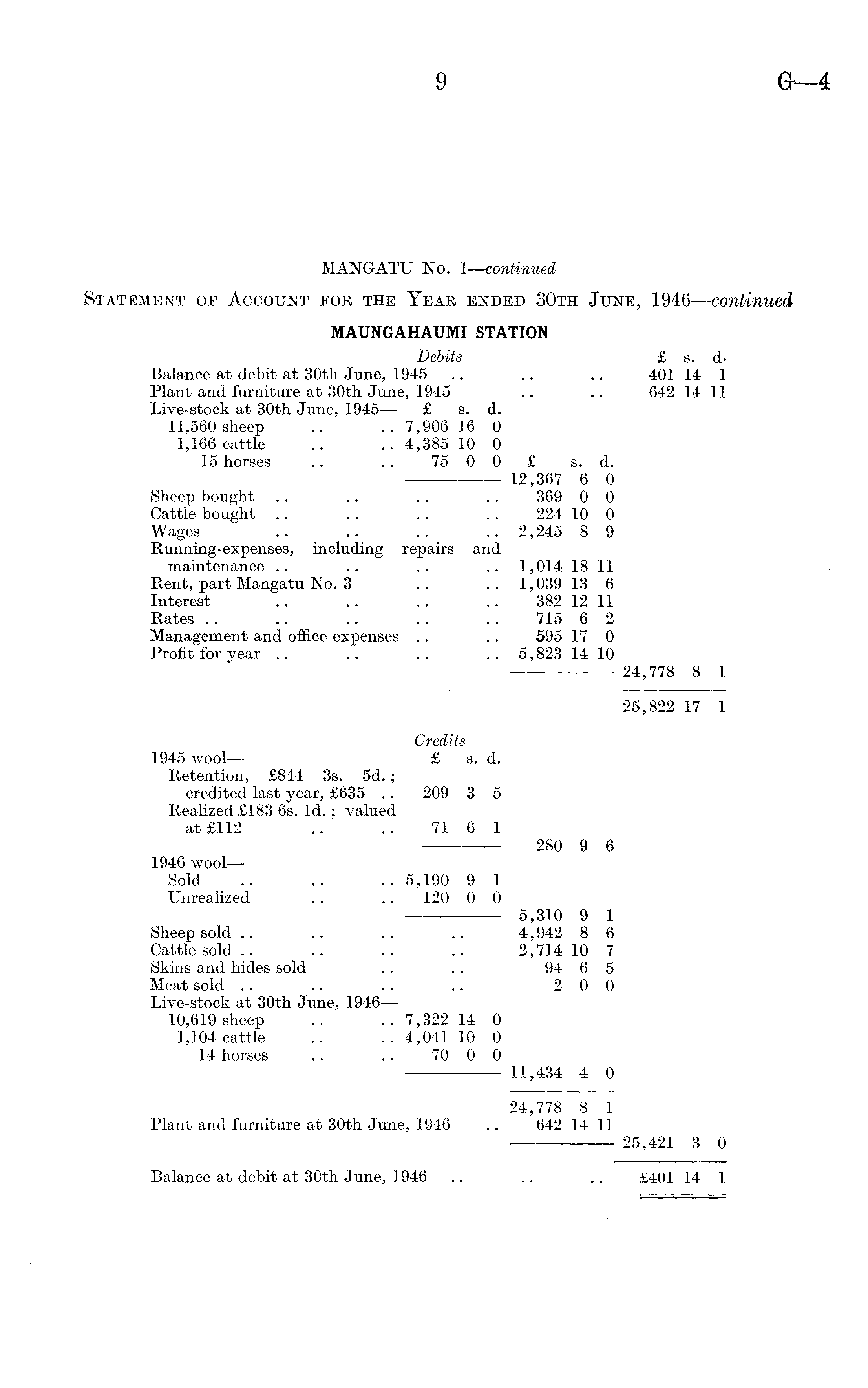MANGATU No. I—continued Statement of Account for the Year ended 30th June, 1946 —continued MAUNGAHAUMI STATION Debits £ s. d. Balance at debit at 30th June, 1945 .. .. .. 401 14 1 Plant and furniture at 30th June, 1945 .. .. 642 14 11 Live-stock at 30th June, 1945 £ s. d. 11,560 sheep .. .. 7,906 16 0 1,166 cattle .. .. 4,385 10 0 15 horses .. .. 75 0 0 £ s. d. , 12,367 6 0 Sheep bought .. .. .. .. 369 0 0 Cattle bought .. .. .. .. 224 10 0 Wages .. .. .. .. 2,245 8 9 Running-expenses, including repairs and maintenance .. .. .. .. 1,014 18 11 Rent, part Mangatu No. 3 .. .. 1,039 13 6 Interest .. .. .. .. 382 12 11 Rates .. .. .. .. .. 715 6 2 Management and office expenses .. .. 595 17 0 Profit for year .. .. .. .. 5,823 14 10 24,778 8 1 25,822 17 1 Credits 1945 wool— £ s. d. Retention, £844 3s. 5d.; credited last year, £635 .. 209 3 5 Realized £lB3 6s. Id.; valued at £ll2 .. .. 71 6 1 2BO 9 6 1946 wool— Sold .. .. .. 5,190 9 1 Unrealized .. .. 120 0 0 5,310 9 1 Sheep sold .. .. .. .. 4,942 8 6 Cattle sold.. .. .. .. 2,714 10 7 Skins and hides sold .. .. 94 6 5 Meat sold .. .. .. .. 2 0 0 Live-stock at 30th June, 1946 10,619 sheep .. .. 7,322 14 0 1,104 cattle .. .. 4,041 10 0 14 horses .. .. 70 0 0 11,434 4 0 24,778 8 1 Plant and furniture at 30th June, 1946 .. 642 14 11 25,421 3 0 Balance at debit at 30th June, 1946 .. .. .. £4Ol 14 1
