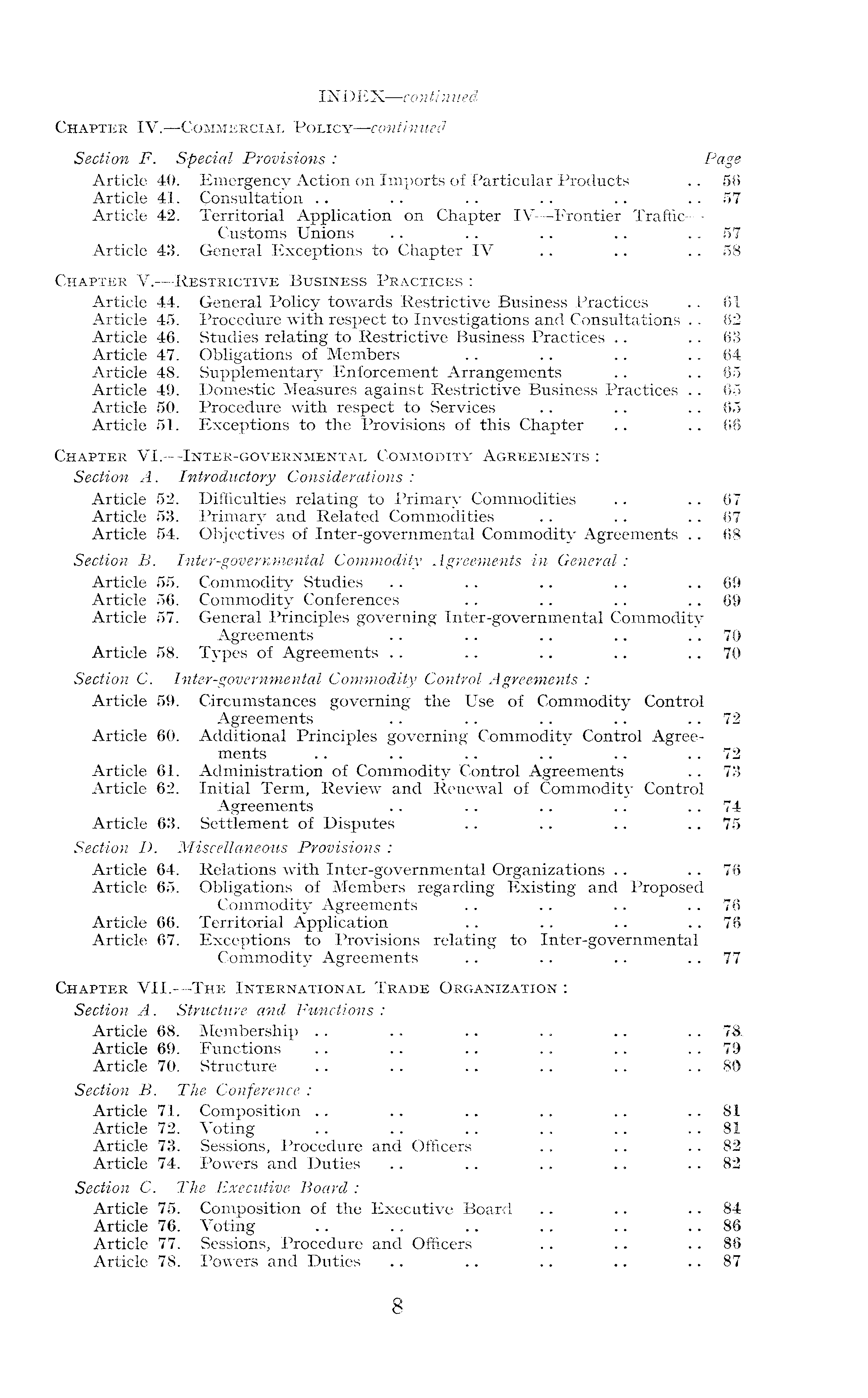 INDEX —continued Chapter IV. —Commercial Policy—continued Section F. Special Provisions : Page Article 40. Emergency Action on Imports of Particular Products .. 56 Article 41. Consultation .. .. .. .. .. 57 Article 42. Territorial Application on Chapter IV —Frontier Traffic— Customs Unions . . .. .. .. 57 Article 43. General Exceptions to Chapter IV .. .. 58 Chapter V.—Restrictive Business Practices : Article 44. General Policy towards Restrictive Business Practices .. 61 Article 45. Procedure with respect to Investigations and Consultations .. 62 Article 46. Studies relating to Restrictive Business Practices .. 63 Article 47. Obligations of Members .. .. .. 64 Article 48. Supplementary Enforcement Arrangements .. 65 Article 49. Domestic Measures against Restrictive Business Practices .. 65 Article 50. Procedure with respect to Services .. .. 65 Article 51. Exceptions to the Provisions of this Chapter .. 66 Chapter VI .-Inter-governmental Commodity Agreements : Section A. Introductory Considerations : Article 52, Difficulties relating to Primary Commodities .. .. 67 Article 53. Primary and Related Commodities .. .. 67 Article 54. Objectives of Inter-governmental Commodity Agreements .. 68 Section B. Inter-governmental Commodity Agreements in General: Article 55. Commodity Studies .. .. .. .. 69 Article 56. Commodity Conferences .. .. .. 69 Article 57. General Principles governing Inter-governmental Commodity Agreements . . .. .. .. 70 Article 58. Types of Agreements .. .. .. .. 70 Section C. Inter-governmental Commodity Control Agreements : Article 59. Circumstances governing the Use of Commodity Control Agreements .. .. .. .. 72 Article 60. Additional Principles governing Commodity Control Agreements .. .. .. .. .. 72 Article 61. Administration of Commodity Control Agreements .. 73 Article 62. Initial Term, Review and Renewal of Commodity Control Agreements .. .. .. .. 74 Article 63. Settlement of Disputes .. .. .. 75 Section D. Miscellaneous Provisions : Article 64. Relations with Inter-governmental Organizations .. .. 76 Article 65. Obligations of Members regarding Existing and Proposed Commodity Agreements .. .. .. 76 Article 66. Territorial Application . . .. .. 76 Article 67. Exceptions to Provisions relating to Inter-governmental Commodity Agreements .. .. .. 77 Chapter Vll.—The International Trade Organization : Section A. Structure and Functions : Article 68. Membership .. .. .. .. .. 78 Article 69. Functions . . .. . . . . .. 79 Article 70. Structure .. .. .. .. .. 80 Section B. The Conference : Article 71. Composition . . .. .. .. .. ..81 Article 72. Voting .. .. .. .. .. 81 Article 73. Sessions, Procedure and Officers .. .. 82 Article 74. Powers and Duties .. . . .. .. 82 Section C. The Executive Board : Article 75. Composition of the Executive Board .. .. 84 Article 76. Voting . . .. .. .. .. 86 Article 77. Sessions, Procedure and Officers .. .. 86 Article 78. Powers and Duties .. .. .. .. 87
