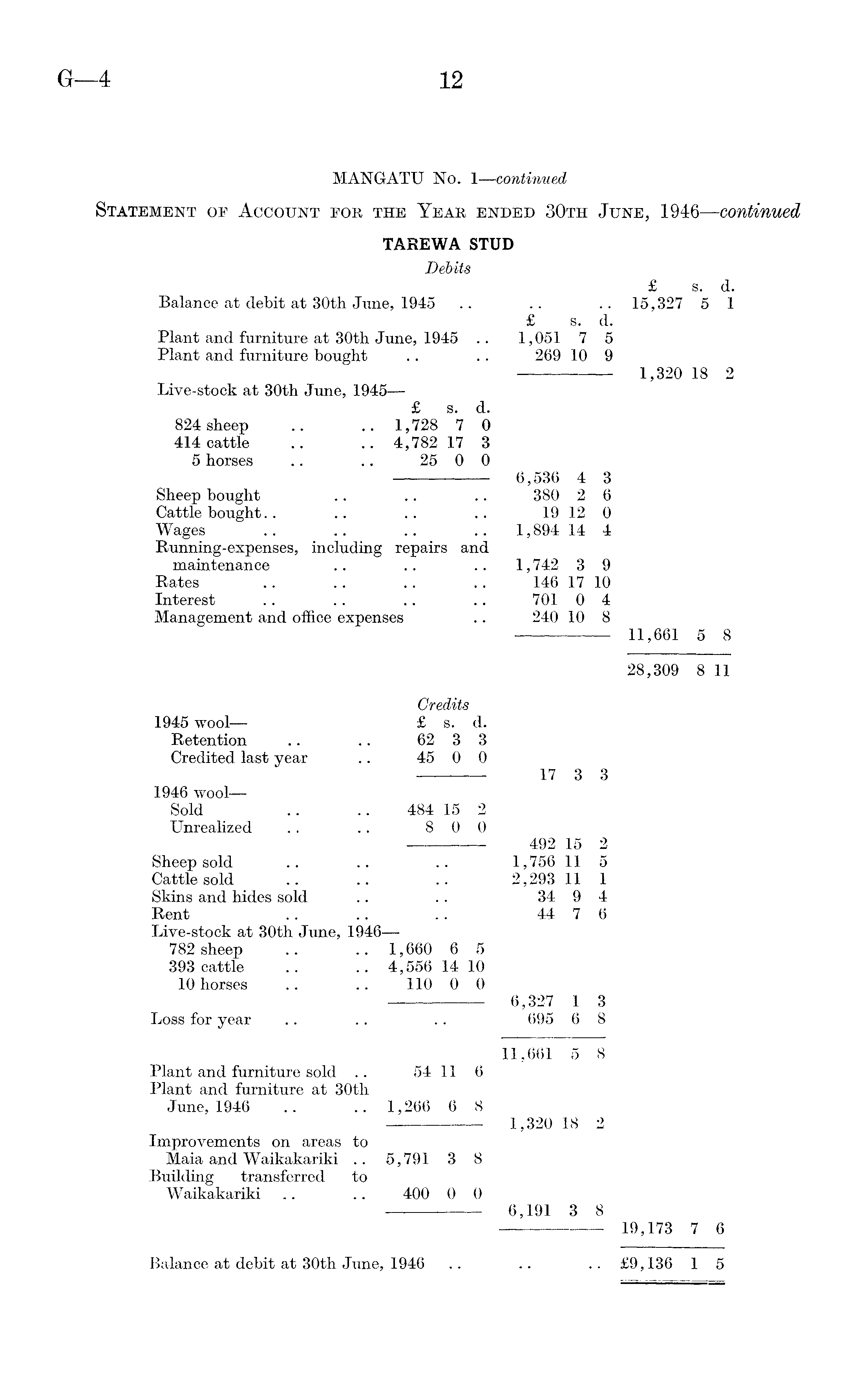 MANGATU No. I—continued Statement of Account for the Year ended 30th June, 1946 —continued TAREWA STUD Debits £ s. d. Balance at debit at 30th June, 1945 .. .. .. 15,327 5 1 £ s. d. Plant and furniture at 30th June, 1945 .. 1,051 7 5 Plant and furniture bought .. .. 269 10 9 1,320 18 2 Live-stock at 30th June, 1945 £ s. d. 824 sheep .. .. 1,728 7 0 414 cattle .. .. 4,782 17 3 5 horses .. .. 25 0 0 — 6,536 4 3 Sheep bought .. .. .. 380 2 6 Cattle bought.. .. .. .. 19 12 0 Wages .. .. .. .. 1,894 14 4 Running-expenses, including repairs and maintenance .. .. .. 1,742 3 9 Rates .. .. .. .. 146 17 10 Interest .. .. .. .. 701 0 4 Management and office expenses .. 240 10 8 11,661 5 8 28,309 8 11 Credits 1945 wool — £ s. d. Retention .. .. 62 3 3 Credited last year .. 45 0 0 l7 3 3 1946 wool — Sold .. .. 484 15 2 Unrealized .. .. 8 0 0 492 15 2 Sheep sold .. .. .. 1,756 11 5 Cattle sold .. .. .. 2,293 11 1 Skins and hides sold .. .. 34 9 4 Rent .. .. .. 44 7 6 Live-stock at 30th June, 1946 — 782 sheep .. .. 1,660 6 5 393 cattle .. .. 4,556 14 10 10 horses .. .. 110 0 0 6,327 1 3 Loss for year .. .. .. 695 6 8 11,661 5 8 Plant and furniture sold .. 54 11 6 Plant and furniture at 30th June, 1-946 .. .. 1,266 6 8 1,320 18 2 Improvements on areas to Maia and Waikakariki .. 5,791 3 8 Building transferred to Waikakariki .. .. 400 0 0 6,191 3 8 19,173 7 6 Balance at debit at 30th June, 1946 .. .. .. £9,136 1 5