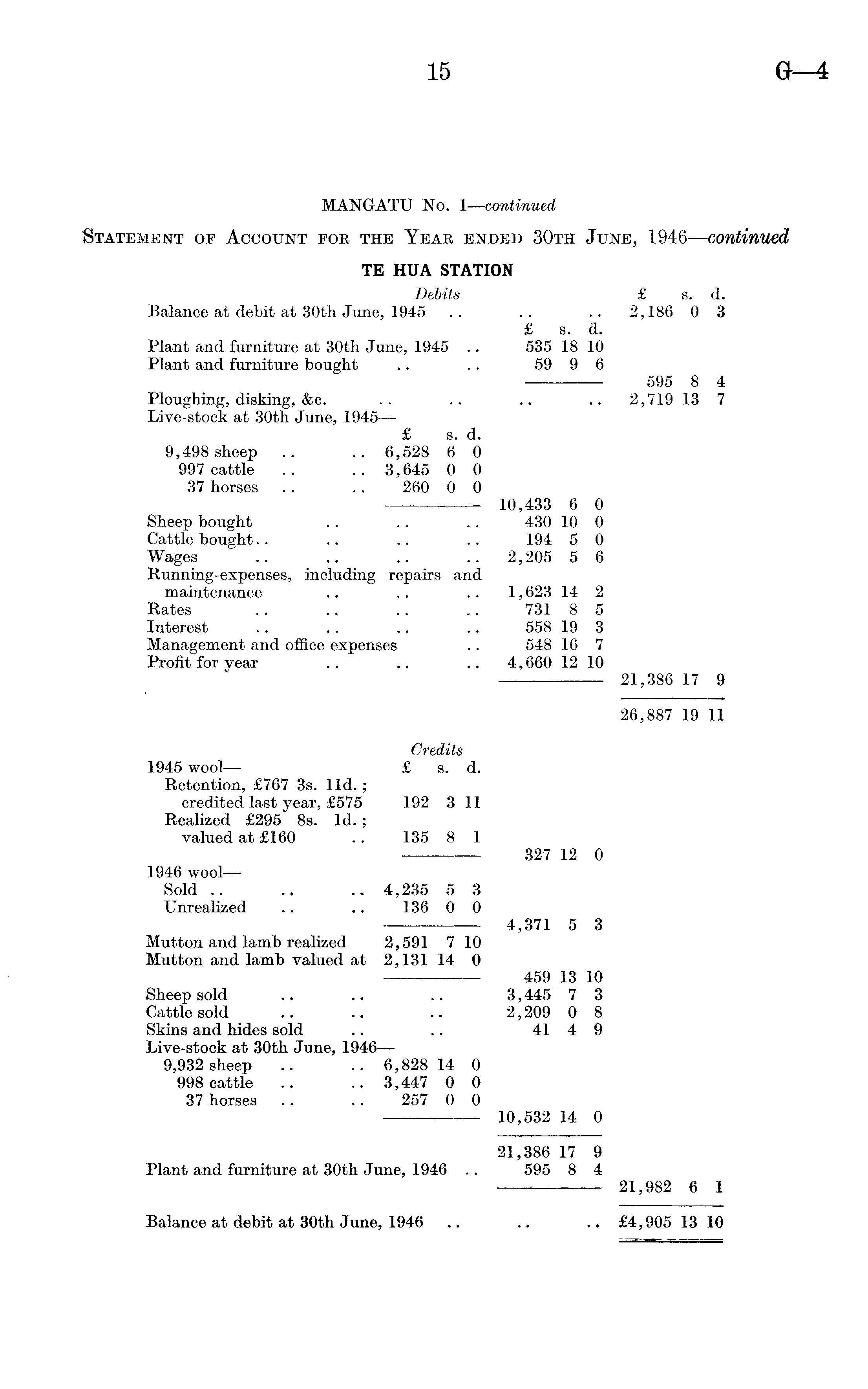 MANGATU No. I—continued Statement op Account for the Year ended 30th June, 1946 —continued TE HUA STATION Debits £ s. d. Balance at debit at 30th June, 1945 .. .. .. 2,186 0 3 £ s. a. Plant and furniture at 30th June, 1945 .. 535 18 10 Plant and furniture bought .. .. 59 9 6 595 8 4 Ploughing, disking, &c. .. .. .. .. 2,719 13 7 Live-stock at 30th June, 1945 — £ s. d. 9,498 sheep .. .. 6,528 6 0 997 cattle .. .. 3,645 0 0 37 horses .. .. 260 0 0 10,433 6 0 Sheep bought .. .. .. 430 10 0 Cattle bought.. .. .. .. 194 5 0 Wages .. .. .. .. 2,205 5 6 Running-expenses, including repairs and maintenance .. .. .. 1,623 14 2 Rates .. .. .. .. 731 8 5 Interest .. .. .. .. 558 19 3 Management and office expenses .. 548 16 7 Profit for year .. .. .. 4,660 12 10 21,386 17 9 26,887 19 11 Credits 1945 wool— £ s. d. Retention, £767 3s. lid.; credited last year, £575 192 3 11 Realized £295 Bs. Id.; valued at £l6O .. 135 8 1 327 12 0 1946 wool — Sold .. .. .. 4,235 5 3 Unrealized .. .. 136 0 0 4,371 5 3 Mutton and lamb realized 2,591 7 10 Mutton and lamb valued at 2,131 14 0 459 13 10 Sheep sold .. .. .. 3,445 7 3 Cattle sold .. .. .. 2,209 0 8 Skins and hides sold .. .. 41 4 9 Live-stock at 30th June, 1946 9,932 sheep .. .. 6,828 14 0 998 cattle .. .. 3,447 0 0 37 horses .. .. 257 0 0 10,532 14 0 21,386 17 9 Plant and furniture at 30th June, 1946 .. 595 8 4 21,982 6 1 Balance at debit at 30th June, 1946 .. .. .. £4,905 13 10