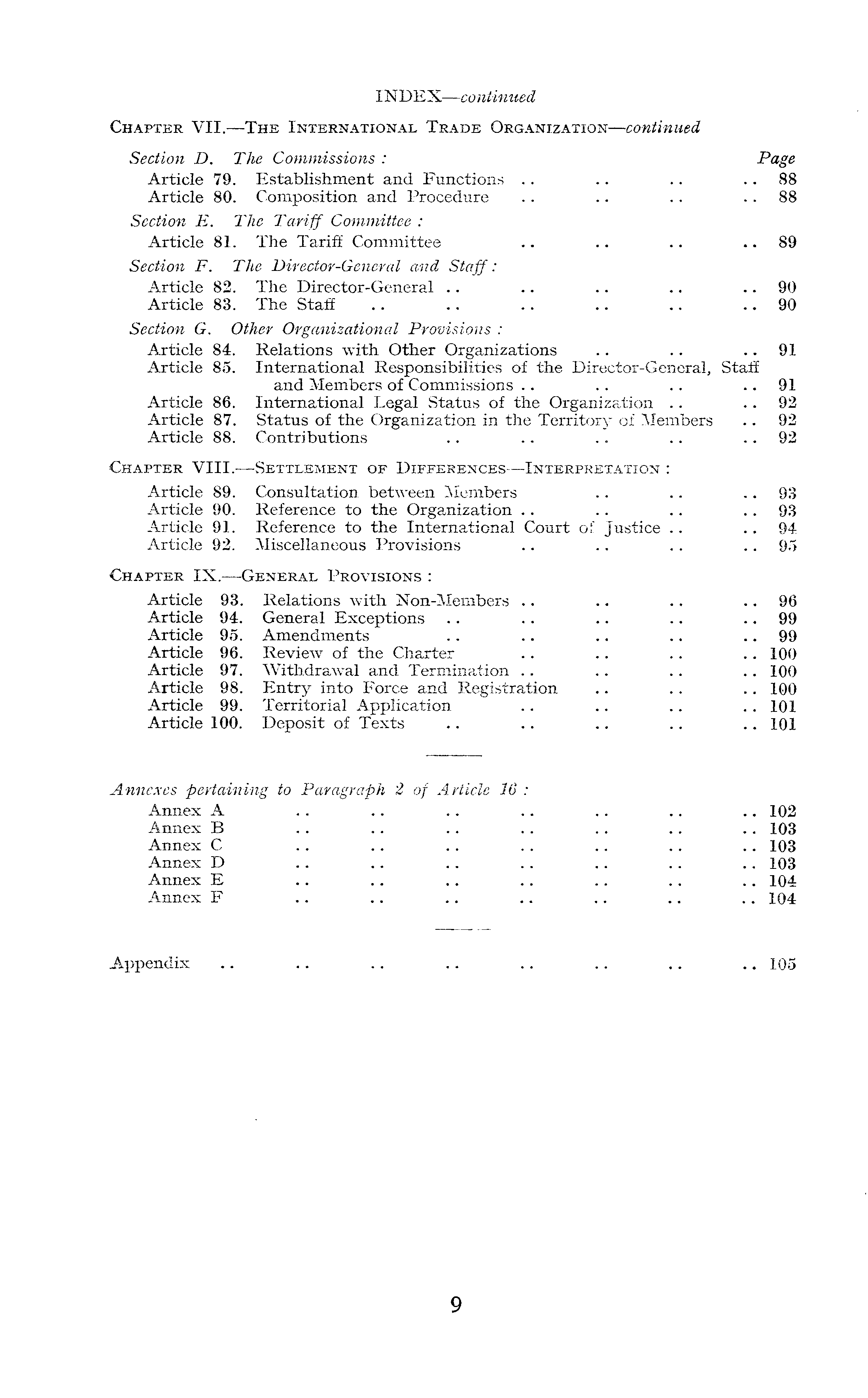 INDEX—continued Chapter Vll.—The International Trade Organization—continued Section D. The Commissions : Page Article 79. Establishment and Functions .. .. .. 88 Article 80. Composition and Procedure .. .. .. 88 Section E. The Tariff Committee : Article 81. The Tariff Committee .. .. .. ..89 Section F. The Director-General and Staff: Article 82. The Director-General .. .. .. .. .. 90 Article 83. The Staff .. .. .. .. .. .. 90 Section G. Other Organizational Provisions : Article 84. Relations with Other Organizations .. .. 91 Article 85. International Responsibilities of the Director-General, Staff and Members of Commissions .. .. .. 91 Article 86. International Legal Status of the Organization .. 92 Article 87. Status of the Organization in the Territory of Members .. 92 Article 88. Contributions .. .. .. .. 92 Chapter Vlll.—Settlement of Differences—-Interpretation : Article 89. Consultation between Members .. .. 93 Article 90. Reference to the Organization .. .. .. 93 Article 91. Reference to the International Court of Justice .. 94 Article 92. Miscellaneous Provisions .. .. .. 95 Chapter IX. —General Provisions : Article 93. Relations with Non-Members .. .. .. .. 96 Article 94. General Exceptions .. .. .. .. 99 Article 95. Amendments .. .. .. .. 99 Article 96. Review of the Charter .. .. .. . . 100 Article 97. Withdrawal and Termination .. .. .. .. 100 Article 98. Entry into Force and Registration .. . . .. 100 Article 99. Territorial Application . . .. .. .. 101 Article 100. Deposit of Texts .. .. .. .. .. 101 Annexes pertaining to Paragraph 2 of Article 16 : Annex A . . .. . . . . . . .. .. 102 Annex B . . . . . . .. .. . . . . 103 Annex C *. . . .. .. .. .. .. 103 Annex D .. .. .. . . .. . . .. 103 Annex E .. .. .. .. .. . . . . 104 Annex F .. .. .. .. .. .. .. 104 Appendix .. .. .. .. .. .. .. .. 105