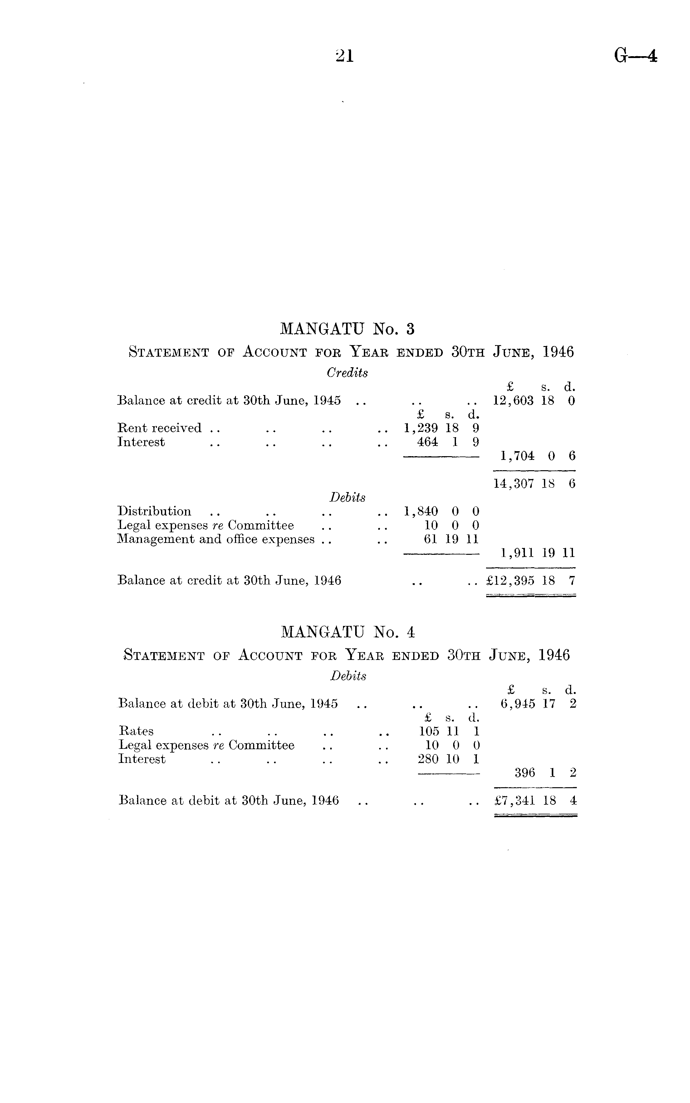 MANGATU No. 3 Statement of Account foe Year ended 30th June, 1946 Credits £ s. d. Balance at credit at 30th June, 1945 .. .. .. 12,603 18 0 £ s. d. Rent received .. .. .. .. 1,239 18 9 Interest .. .. .. .. 464 1 9 1,704 0 6 14,307 18 6 Debits Distribution .. .. .. 1,840 0 0 Legal expenses re Committee .. .. 10 0 0 Management and office expenses .. .. 61 19 11 1,911 19 11 Balance at credit at 30th June, 1946 .. .. £12,395 18 7 MANGATU No. 4 Statement of Account for Year ended 30th June, 1946 Debits £ s. d. Balance at debit at 30th June, 1945 .. .. .. 6,945 17 2 £ s. d. Rates .. .. .. .. 105 11 1 Legal expenses re Committee .. .. 10 0 0 Interest .. .. .. .. 280 10 1 396 1 2 Balance at debit at 30th June, 1946 .. .. .. £7,341 18 4