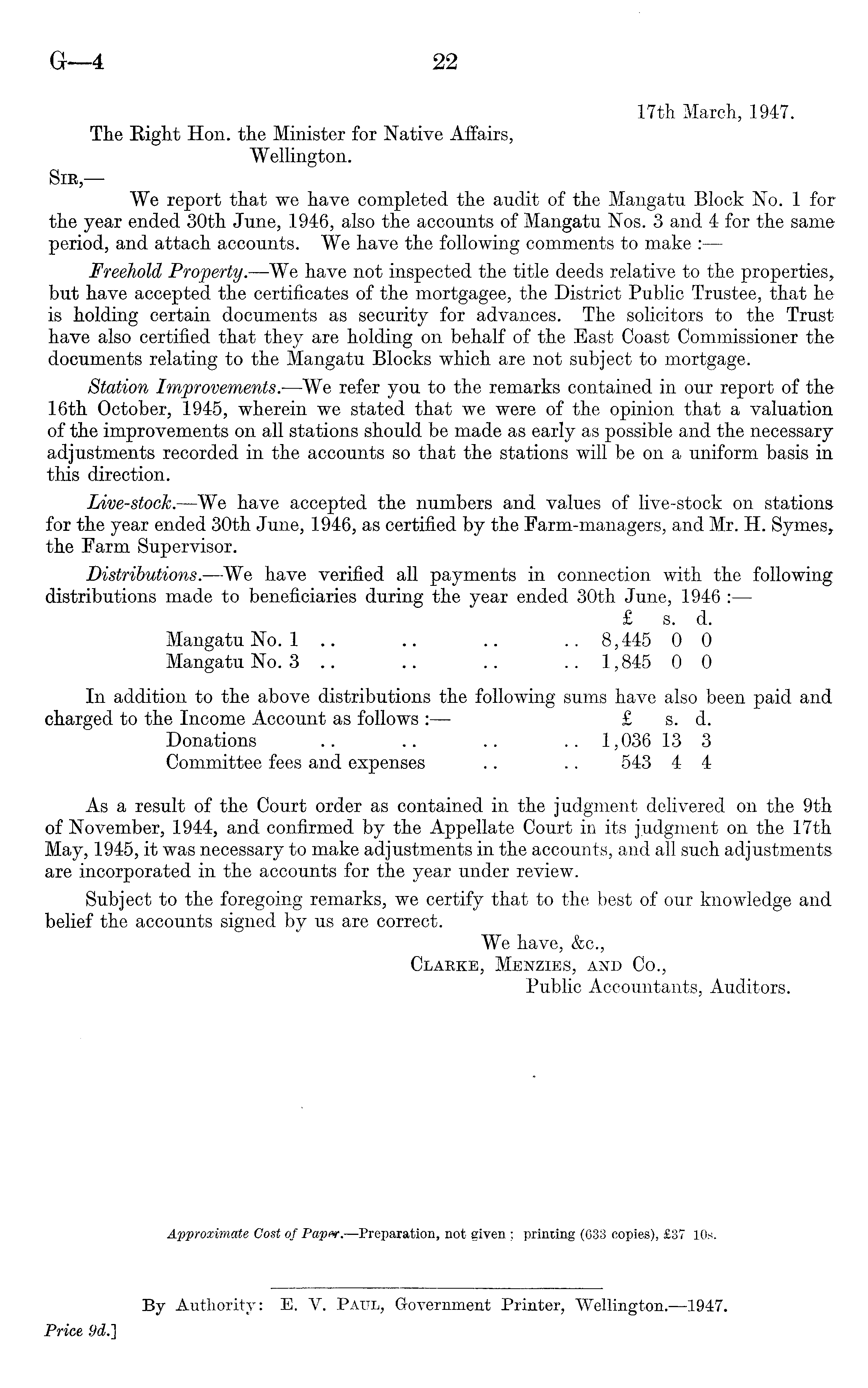 17th March, 1947. The Right Hon. the Minister for Native Affairs, Wellington. Sir, — We report that we have completed the audit of the Mangatu Block No. 1 for the year ended 30th June, 1946, also the accounts of Mangatu Nos. 3 and 4 for the same period, and attach accounts. We have the following comments to make : Freehold Property.—We have not inspected the title deeds relative to the properties, but have accepted the certificates of the mortgagee, the District Public Trustee, that he is holding certain documents as security for advances. The solicitors to the Trust have also certified that they are holding on behalf of the East Coast Commissioner the documents relating to the Mangatu Blocks which are not subject to mortgage. Station Improvements.—We refer you to the remarks contained in our report of the 16th October, 1945, wherein we stated that we were of the opinion that a valuation of the improvements on all stations should be made as early as possible and the necessary adjustments recorded in the accounts so that the stations will be on a uniform basis in this direction. Live-stock. —We have accepted the numbers and values of live-stock on stations for the year ended 30th June, 1946, as certified by the Farm-managers, and Mr. H. Symes, the Farm Supervisor. Distributions.—We have verified all payments in connection with the following distributions made to beneficiaries during the year ended 30th June, 1946 : £ s. d. Mangatu No. 1 .. .. .. .. 8,445 0 0 Mangatu No. 3 .. .. .. .. 1,845 0 0 In addition to the above distributions the following sums have also been paid and charged to the Income Account as follows : £ s. d. Donations .. .. .. .. 1,036 13 3 Committee fees and expenses .. .. 543 4 4 As a result of the Court order as contained in the judgment delivered on the 9th of November, 1944, and confirmed by the Appellate Court in its judgment on the 17th May, 1945, it was necessary to make adjustments in the accounts, and all such adjustments are incorporated in the accounts for the year under review. Subject to the foregoing remarks, we certify that to the best of our knowledge and belief the accounts signed by us are correct. We have, &c., Clarke, Menzies, and Co., Public Accountants, Auditors.