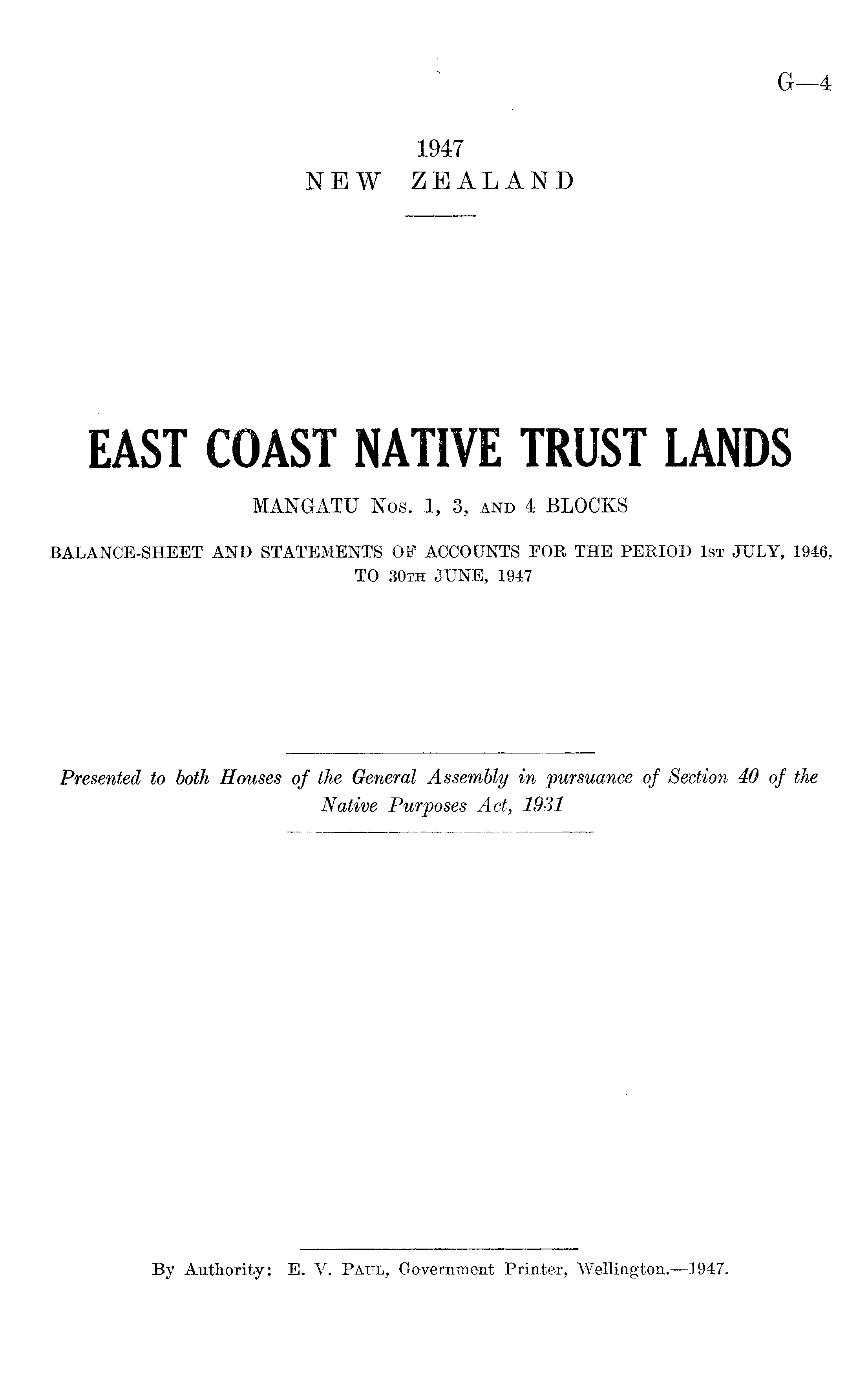 EAST COAST NATIVE TRUST LANDS MANGATU Nos. 1, 3, and 4 BLOCKS BALANCE-SHEET AND STATEMENTS OF ACCOUNTS FOR THE PERIOD IST JULY, 1946 ; TO 30th JUNE, 1947