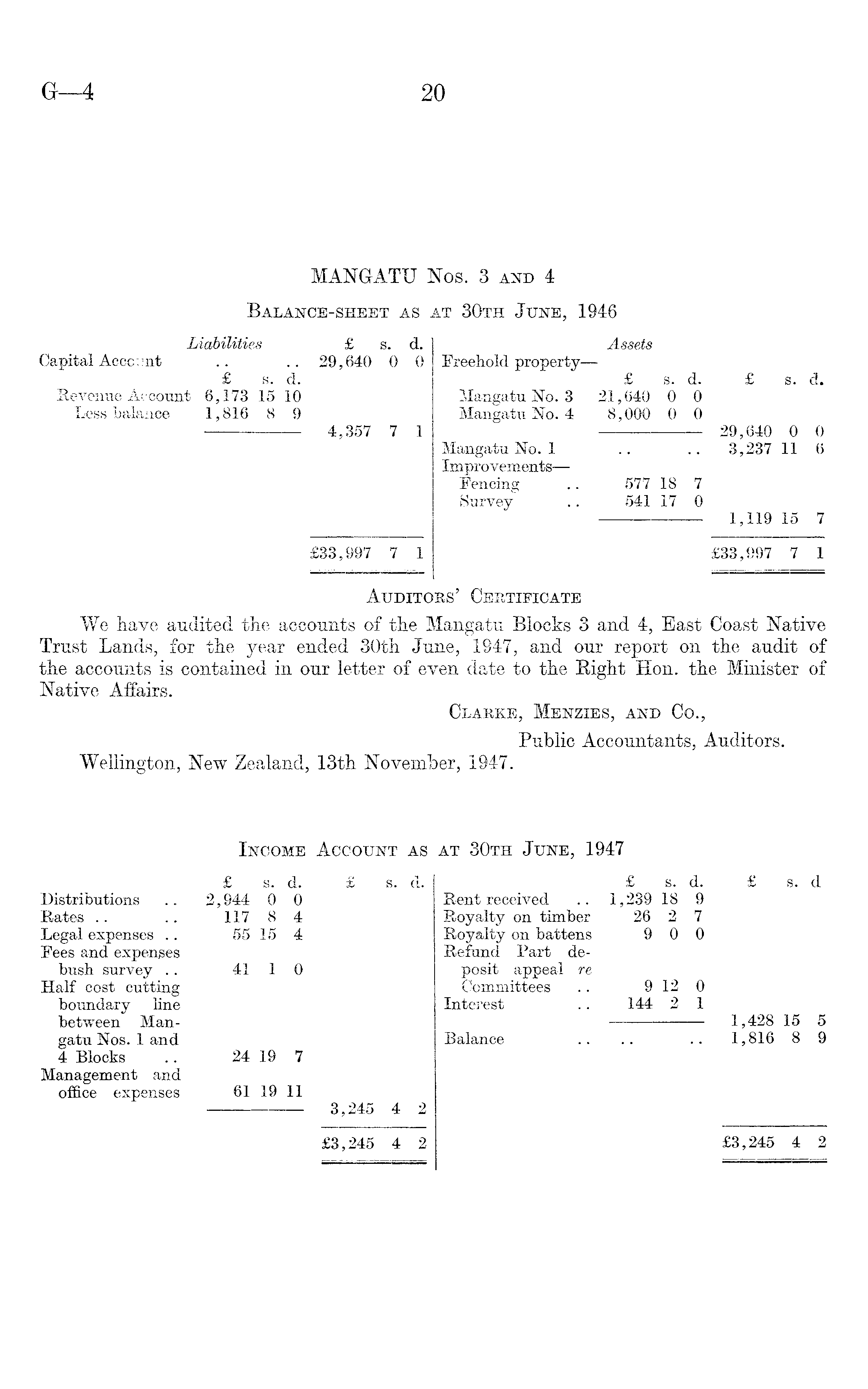 MANGATU Nos. 3 and 4 Balance-sheet as at 30th June, 1946 Liabilities £ s. d. Assets Capital Account .. .. 29,640 0 0 Freehold property—- £ s. d. £ s. d. £ s. d. Revenue Account 6,173 15 10 Mangatu No. 3 21,640 0 0 Less balance 1,816 8 9 Mangatu No. 4 8,000 0 0 4,357 7 1 29,640 0 0 Mangatu No. 1 .. .. 3,237 11 6 Improvements— Fencing .. 577 18 7 Survey .. 541 17 0 1,119 15 7 £33,997 7 1 £33,997 7 1 Auditors' Certificate We have audited the accounts of the Mangatu Blocks 3 and 4, East Coast Native Trust Lands, for the year ended 30th June, 1947, and our report on the audit of the accounts is contained in our letter of even date to the Bight Hon. the Minister of Native Affairs. Clarke, Menzies, and Co., Public Accountants, Auditors. Wellington, New Zealand, 13th November, 1947. Income Account as at 30th June, 1947 £ s. d. £ s. d. £ s. d. £ s. d Distributions .. 2,944 0 0 Rent received .. 1,239 18 9 Rates .. .. 117 8 4 Royalty on timber 26 2 7 Legal expenses .. 55 15 4 Royalty on battens 9 0 0 Fees and expenses Refund Part debush survey .. 41 1 0 posit appeal re Half cost cutting Committees .. 912 0 boundary line Interest .. 144 2 1 between Man- 1,428 15 5 gatu Nos. 1 and Balance .. .. .. 1,816 8 9 4 Blocks .. 24 19 7 Management and office expenses 61 19 11 3,245 4 2 £3,245 4 2 £3,245 4 2