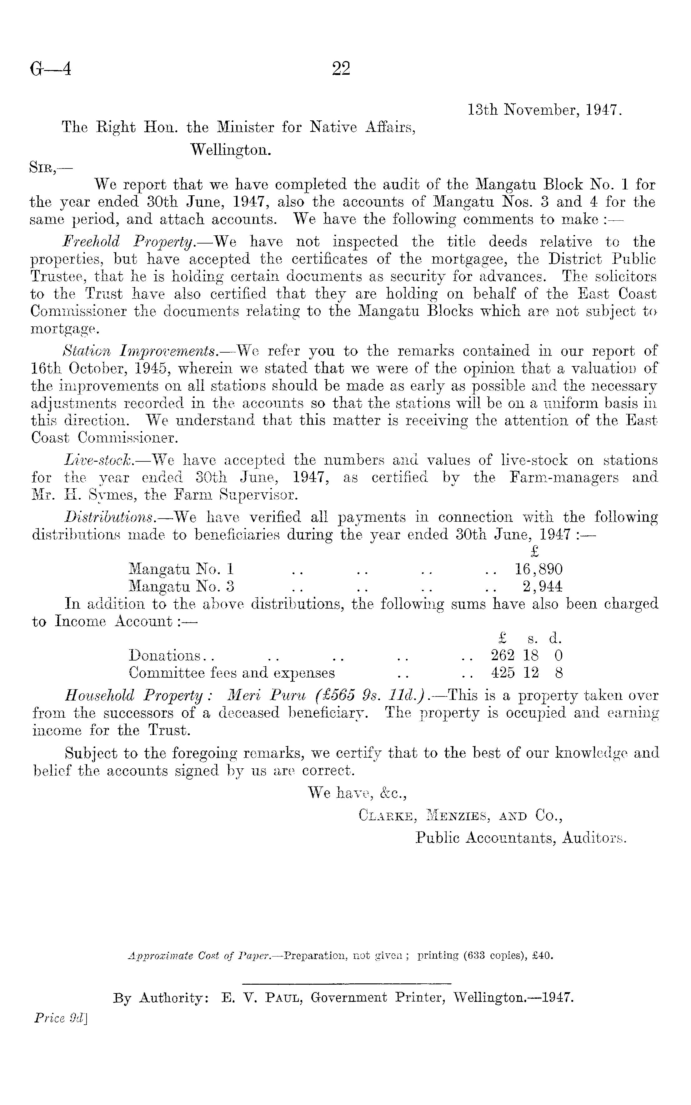 13th November, 1947. The Right Hon. the Minister for Native Affairs, Wellington. Sir, — We report that we have completed the audit of the Mangatu Block No. 1 for the year ended 30th June, 1947, also the accounts of Mangatu Nos. 3 and 4 for the same period, and attach accounts. We have the following comments to make : Freehold Property.—We have not inspected the title deeds relative to the properties, but have accepted the certificates of the mortgagee, the District Public Trustee, that he is holding certain documents as security for advances. The solicitors to the Trust have also certified that they are holding on behalf of the East Coast Commissioner the documents relating to the Mangatu Blocks which are not subject to mortgage. Station Improvements.—We refer you to the remarks contained in our report of 16th October, 1945, wherein we stated that we were of the opinion that a valuation of the improvements on all stations should be made as early as possible and the necessary adjustments recorded in the accounts so that the stations will be on a uniform basis in this direction. We understand that this matter is receiving the attention of the East Coast Commissioner. Live-stock. —We have accepted the numbers and values of live-stock on stations for the year ended 30th June, 1947, as certified by the Farm-managers and Mr. H. Symes, the Farm Supervisor. Distributions. —We have verified all payments in connection with the following distributions made to beneficiaries during the year ended 30th June, 1947 : £ Mangatu No. 1 .. .. .. .. 16,890 Mangatu No. 3 .. .. .. .. 2,944 In addition to the above distributions, the following sums have also been charged to Income Account:— £ s. d. Donations.. .. .. .. .. 262 18 0 Committee fees and expenses .. .. 425 12 8 Household Property : Meri Puru (£565 9s. lid.). —This is a property taken over from the successors of a deceased beneficiary. The property is occupied and earning income for the Trust. Subject to the foregoing remarks, we certify that to the best of our knowledge and belief the accounts signed by us are correct. We have, &c., Clarke, Menzies, and Co., Public Accountants, Auditors.