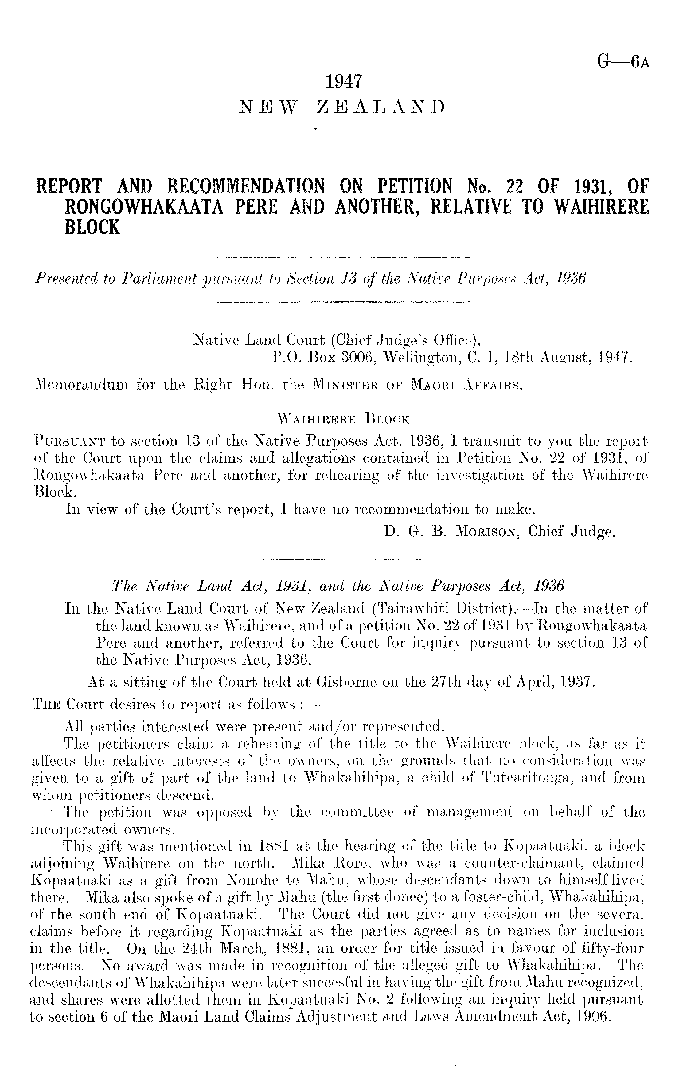 The Native Land Act, 1931, and the Native Purposes Act, 1936 In the Native Land Court of New Zealand (Tairawhiti District). —In the matter of the land known as Waihirere, and of a petition No. 22 of 1931 by Rongowhakaata Pere and another, referred to the Court for inquiry pursuant to section 13 of the Native Purposes Act, 1936. At a sitting of the Court held at Grisborne on the 27th day of April, 1937. The Court desires to report as follows All parties interested were present and/or represented. The petitioners claim a rehearing of the title to the Waihirere block, as far as it affects the relative interests of the owners, on the grounds that no consideration was given to a gift of part of the land to Whakahihipa, a child of Tutearitonga, and from whom petitioners descend. The petition was opposed by the committee of management on behalf of the incorporated owners. This gift was mentioned in 1881 at the hearing of the title to Kopaatuaki, a block adjoining Waihirere on the north. Mika Rore, who was a counter-claimant, claimed Kopaatuaki as a gift from Nonohe te Mahu, whose descendants down to himself lived there. Mika also spoke of a gift by Mahu (the first donee) to a foster-child, Whakahihipa, of the south end of Kopaatuaki. The Court did not give any decision on the several claims before it regarding Kopaatuaki as the parties agreed as to names for inclusion in the title. On the 24th March, 1881, an order for title issued in favour of fifty-four persons. No award was made in recognition of the alleged gift to Whakahihipa. The descendants of Whakahihipa were later succesful in having the gift from Mahu recognized, and shares were allotted them in Kopaatuaki No. 2 following an inquiry held pursuant to section 6 of the Maori Land Claims Adjustment and Laws Amendment Act, 1906.