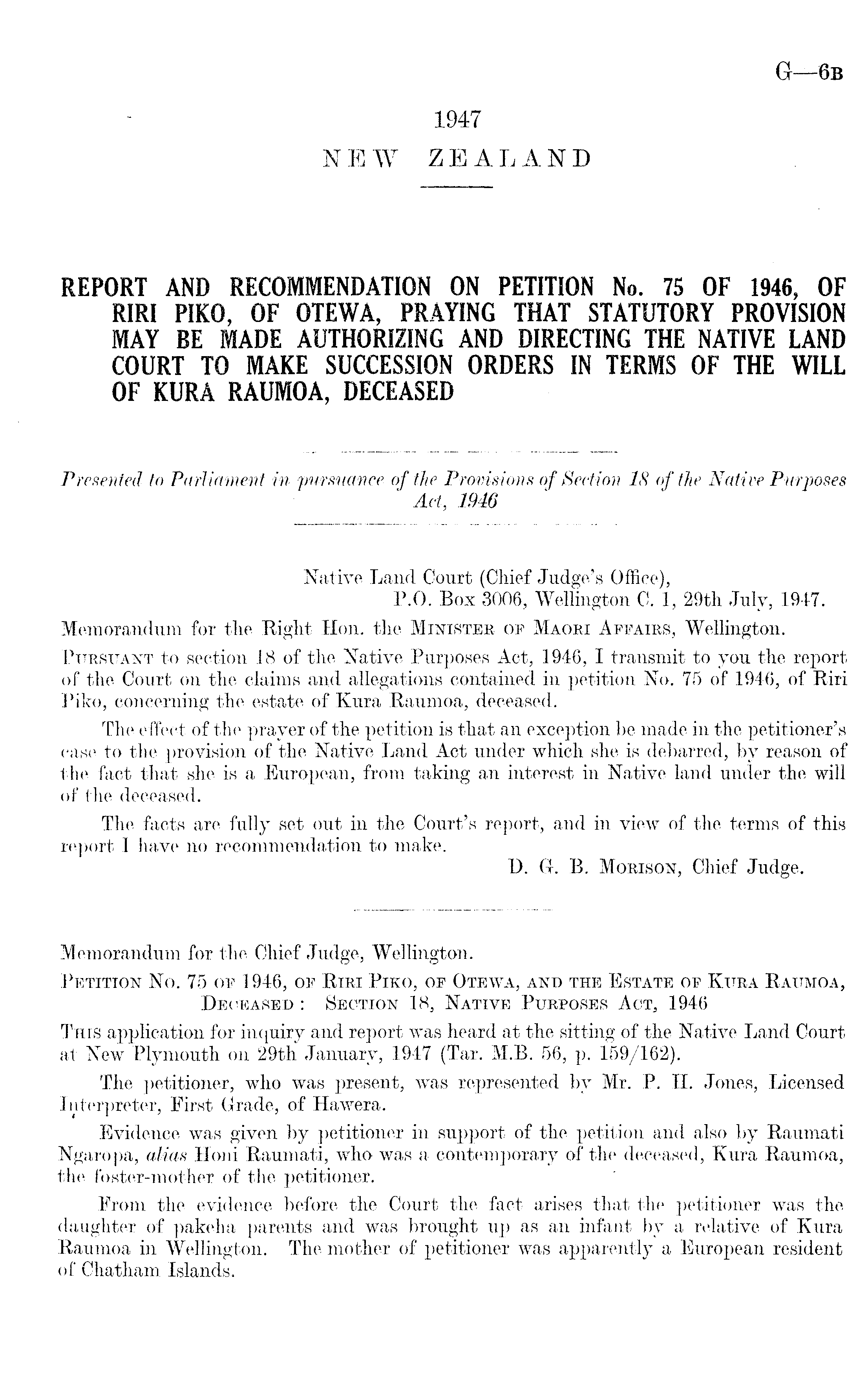 REPORT AND RECOMMENDATION ON PETITION No. 75 OF 1946, OF RIRI PIKO, OF OTEWA, PRAYING THAT STATUTORY PROVISION MAY BE MADE AUTHORIZING AND DIRECTING THE NATIVE LAND COURT TO MAKE SUCCESSION ORDERS IN TERMS OF THE WILL OF KURA RAUMOA, DECEASED