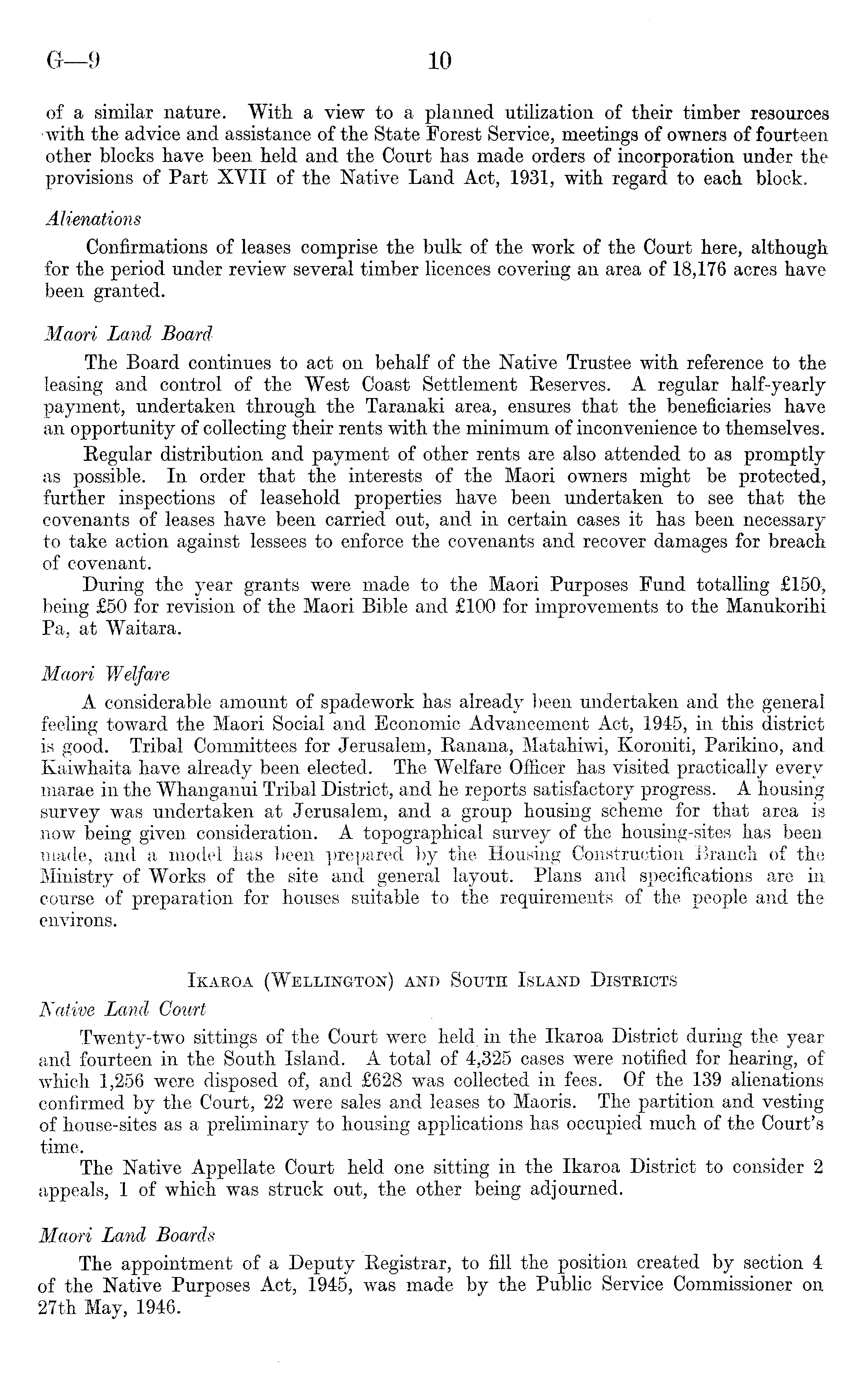 of a similar nature. With, a view to a planned utilization of their timber resources ■with the advice and assistance of the State Forest Service, meetings of owners of fourteen other blocks have been held and the Court has made orders of incorporation under the provisions of Part XVII of the Native Land Act, 1931, with, regard to each block. Alienations Confirmations of leases comprise the bulk of the work of the Court here, although for the period under review several timber licences covering an area of 18,176 acres have been granted. Maori Land Board The Board continues to act on behalf of the Native Trustee with reference to the leasing and control of the West Coast Settlement Reserves. A regular half-yearly payment, undertaken through the Taranaki area, ensures that the beneficiaries have an opportunity of collecting their rents with the minimum of inconvenience to themselves. Regular distribution and payment of other rents are also attended to as promptly as possible. In order that the interests of the Maori owners might be protected, further inspections of leasehold properties have been undertaken to see that the covenants of leases have been carried out, and in certain cases it has been necessary to take action against lessees to enforce the covenants and recover damages for breach of covenant. During the year grants were made to the Maori Purposes Fund totalling £l5O, being £5O for revision of the Maori Bible and £lOO for improvements to the Manukorihi Pa, at Waitara. Maori Welfare A considerable amount of spadework has already been undertaken and the general feeling toward the Maori Social and Economic Advancement Act, 1945, in this district is good. Tribal Committees for Jerusalem, Ranana, Matahiwi, Koroniti, Parikino, and Kaiwhaita have already been elected. The Welfare Officer has visited practically every marae in the Whanganui Tribal District, and he reports satisfactory progress. A housing survey was undertaken at Jerusalem, and a group housing scheme for that area is now being given consideration. A topographical survey of the housing-sites has been made, and a model has been prepared by the Housing Construction Branch of the Ministry of Works of the site and general layout. Plans and specifications are in course of preparation for houses suitable to the requirements of the people and the environs. Ikaroa (Wellington) and South Island Districts Native Land Court Twenty-two sittings of the Court were held, in the Ikaroa District during the year and fourteen in the South Island. A total of 4,325 cases were notified for hearing, of which 1,256 were disposed of, and £628 was collected in fees. Of the 139 alienations confirmed by the Court, 22 were sales and leases to Maoris. The partition and vesting of house-sites as a preliminary to housing applications has occupied much of the Court's time. The Native Appellate Court held one sitting in the Ikaroa District to consider 2 appeals, 1 of which was struck out, the other being adjourned. Maori Land Boards The appointment of a Deputy Registrar, to fill the position created by section 4 of the Native Purposes Act, 1945, was made by the Public Service Commissioner on 27th May, 1946.