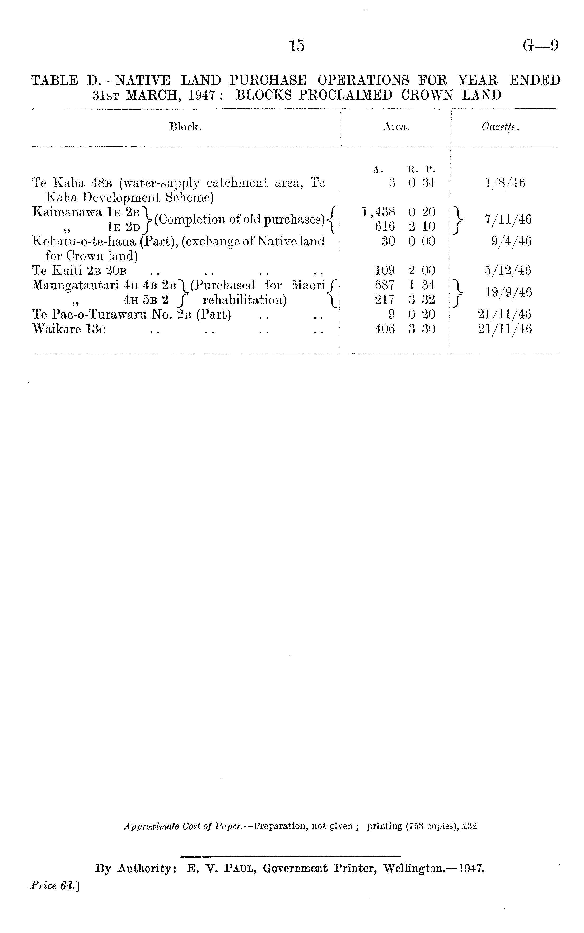 TABLE D.—NATIVE LAND PURCHASE OPERATIONS FOR YEAR ENDED 31st MARCH, 1947: BLOCKS PROCLAIMED CROWN LAND