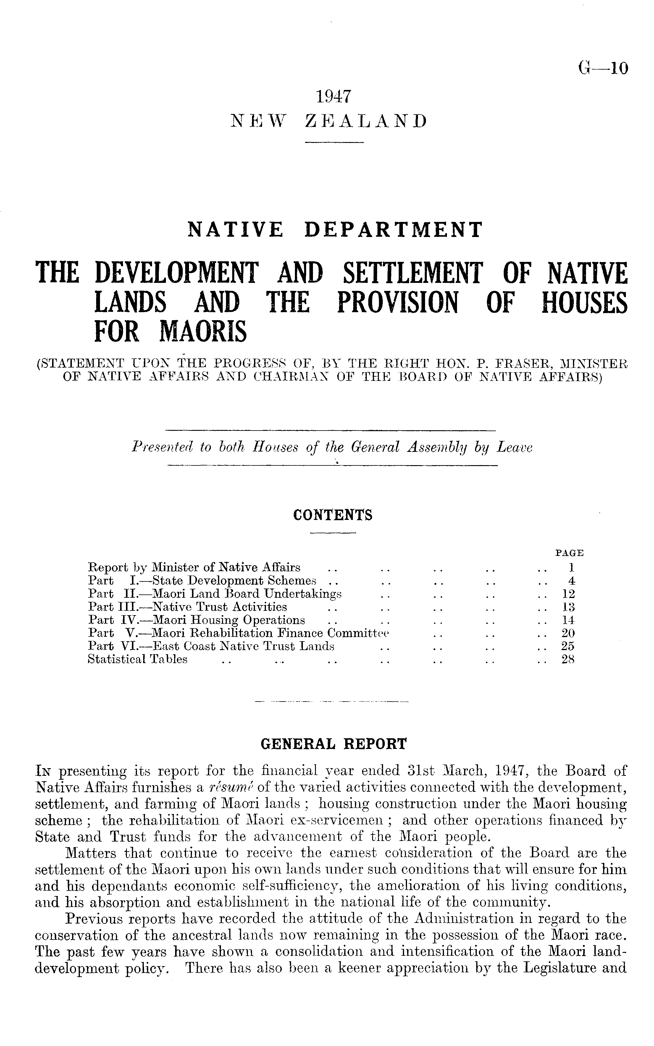 GENERAL REPORT In presenting its report for the financial year ended 31st March, 1947, the Board of Native Affairs furnishes a resume of the varied activities connected with the development, settlement, and farming of Maori lands ; housing construction under the Maori housing .scheme ; the rehabilitation of Maori ex-servicemen ; and other operations financed by State and Trust funds for the advancement of the Maori people. Matters that continue to receive the earnest cohsideration of the Board are the settlement of the Maori upon his own lands under such conditions that will ensure for him and his dependants economic self-sufficiency, the amelioration of his living conditions, and his absorption and establishment in the national life of the community. Previous reports have recorded the attitude of the Administration in regard to the conservation of the ancestral lands now remaining in the possession of the Maori race. The past few years have shown a consolidation and intensification of the Maori landdevelopment policy. There has also been a keener appreciation by the Legislature and