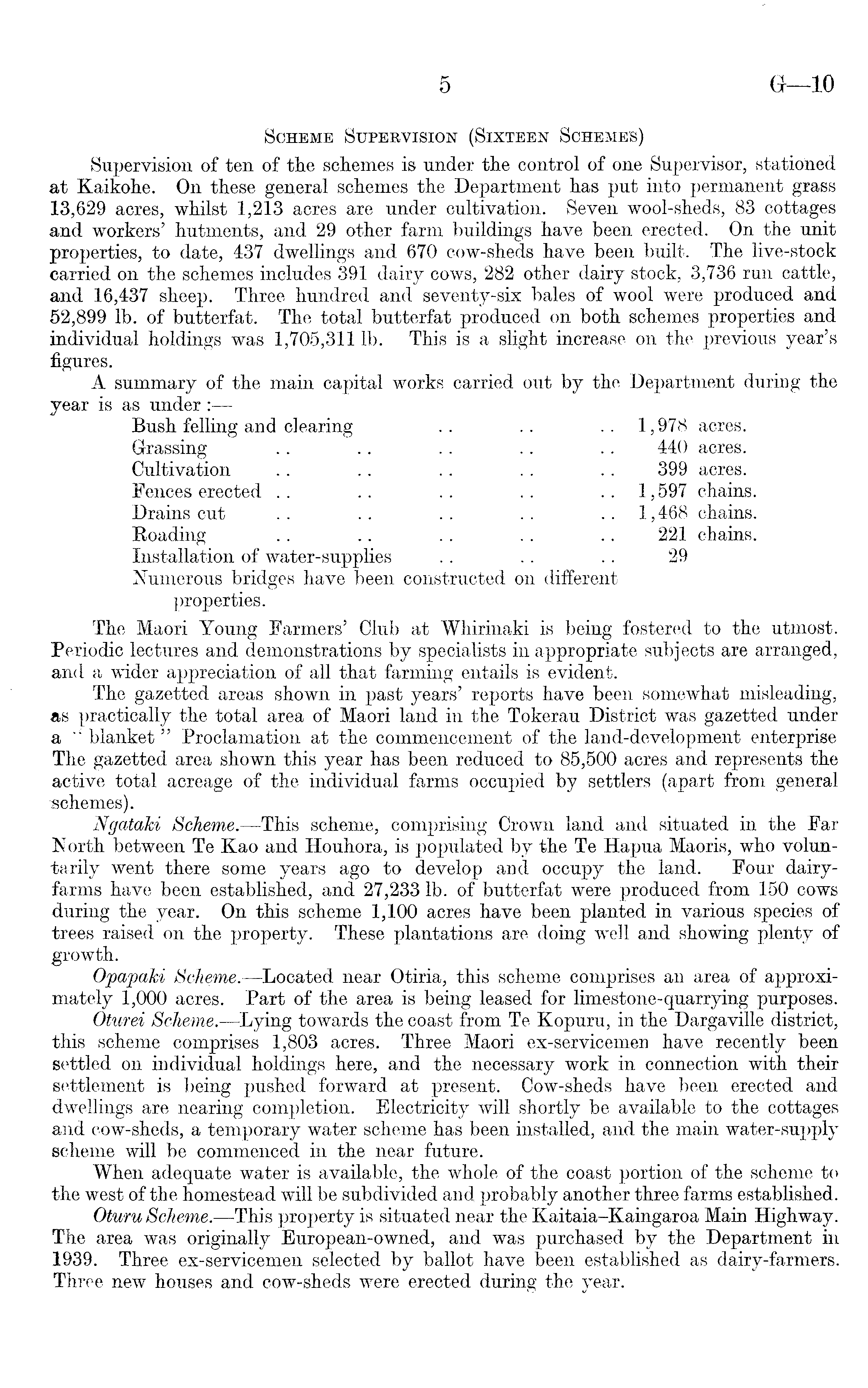Scheme Supervision (Sixteen Schemes) Supervision of ten of the schemes is under the control of one Supervisor, stationed at Kaikohe. On these general schemes the Department has put into permanent grass 13,629 acres, whilst 1,213 acres are under cultivation. Seven wool-sheds, 83 cottages and workers' hutments, and 29 other farm buildings have been erected. On the unit properties, to date, 437 dwellings and 670 cow-sheds have been built. The live-stock carried on the schemes includes 391 dairy cows, 282 other dairy stock, 3,736 run cattle, and 16,437 sheep. Three hundred and seventy-six bales of wool were produced and 52,899 lb. of butterfat. The total butterfat produced on both schemes properties and individual holdings was 1,705,311 lb. This is a slight increase on the previous year's figures. A summary of the main capital works carried out by the Department during the year is as under : Bush felling and clearing .. .. .. 1,978 acres. Grassing .. .. .. .. .. 440 acres. Cultivation .. .. .. .. .. 399 acres. Fences erected .. .. .. .. .. 1,597 chains. Drains cut .. .. .. .. 1,468 chains. Roading .. .. .. .. .. 221 chains. Installation of water-supplies .. .. .. 29 Numerous bridges have been constructed on different properties. The Maori Young Farmers' Club at Whirinaki is being fostered to the utmost. Periodic lectures and demonstrations by specialists in appropriate subjects are arranged, a,nd a wider appreciation of all that farming entails is evident. The gazetted areas shown in past years' reports have been somewhat misleading, as practically the total area of Maori land in the Tokerau District was gazetted under a " blanket" Proclamation at the commencement of the land-development enterprise The gazetted area shown this year has been reduced to 85,500 acres and represents the active total acreage of the individual farms occupied by settlers (apart from general schemes). Ngataki Scheme.—This scheme, comprising Crown land and situated in the Far North between Te Kao and Houhora, is populated by the Te Hapua Maoris, who voluntarily went there some years ago to develop and occupy the land. Four dairyfarms have been established, and 27,233 lb. of butterfat were produced from 150 cows during the year. On this scheme 1,100 acres have been planted in various species of trees raised on the property. These plantations are doing well and showing plenty of growth. Opapaki Scheme. —Located near Otiria, this scheme comprises an area of approximately 1,000 acres. Part of the area is being leased for limestone-quarrying purposes. Oturei Scheme.—Lying towards the coast from Te Kopuru, in the Dargaville district, this scheme comprises 1,803 acres. Three Maori ex-servicemen have recently been settled on individual holdings here, and the necessary work in connection with their settlement is being pushed forward at present. Cow-sheds have been erected and dwellings are nearing completion. Electricity will shortly be available to the cottages and cow-sheds, a temporary water scheme has been installed, and the main water-supply scheme will be commenced in the near future. When adequate water is available, the whole of the coast portion of the scheme to the west of the homestead will be subdivided and probably another three farms established. Oturu Scheme.—This property is situated near the Kaitaia-Kaingaroa Main Highway. The area was originally European-owned, and was purchased by the Department in 1939. Three ex-servicemen selected by ballot have been established as dairy-farmers. Three new houses and cow-sheds were erected during the year.