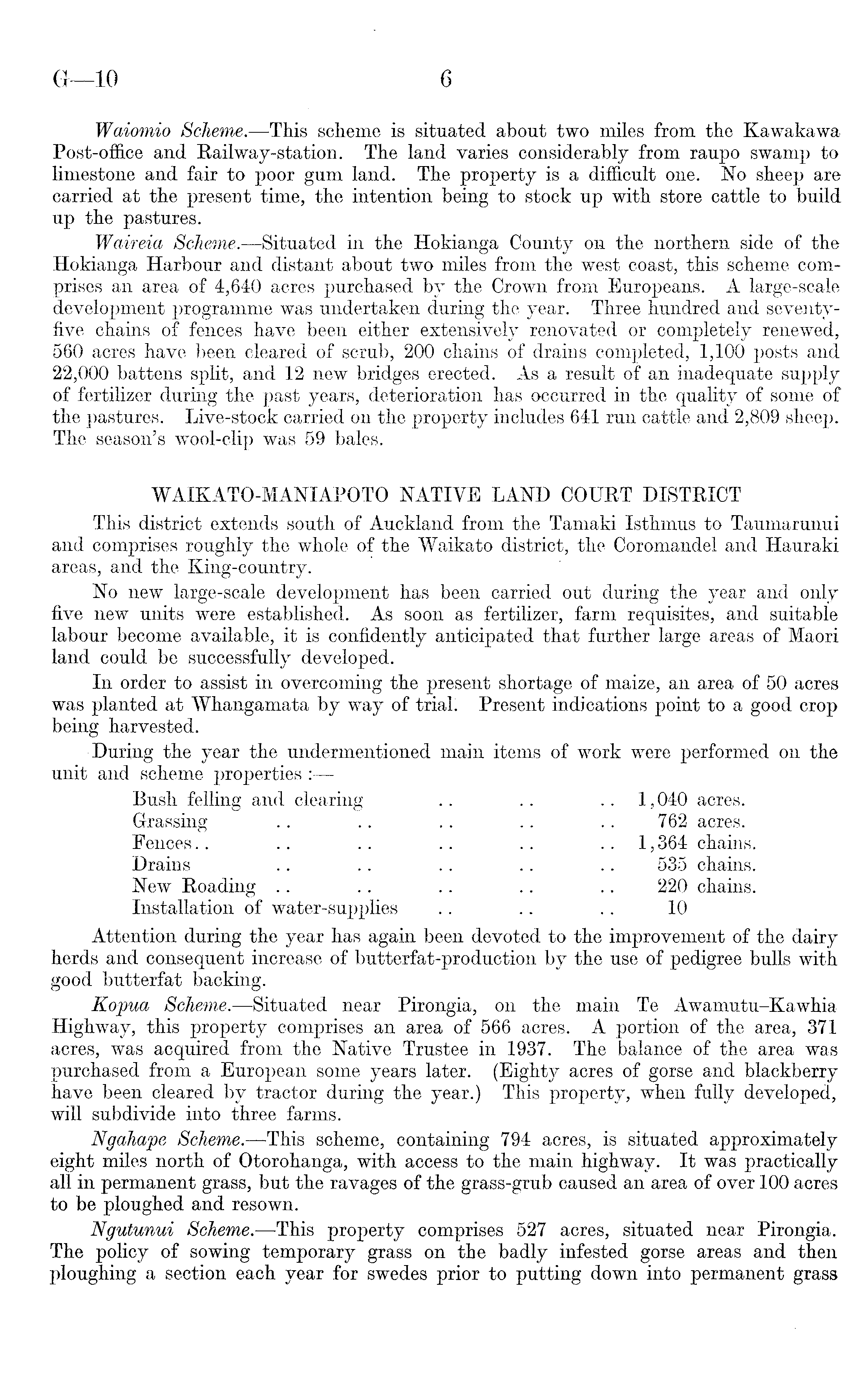 Waiomio Scheme.—This scheme is situated about two miles from the Kawakawa Post-office and Bailway-station. The land varies considerably from raupo swamp to limestone and fair to poor gum land. The property is a difficult one. No sheep are carried at the present time, the intention being to stock up with store cattle to build up the pastures. Waireia Scheme. —Situated in the Hokianga County on the northern side of the Hokianga Harbour and distant about two miles from the west coast, this scheme comprises an area of 4,640 acres purchased by the Crown from Europeans. A large-scale development programme was undertaken during the year. Three hundred and seventyfive chains of fences have been either extensively renovated or completely renewed, 560 acres have been cleared of scrub, 200 chains of drains completed, 1,100 posts and 22,000 battens split, and 12 new bridges erected. As a result of an inadequate supply of fertilizer during the past years, deterioration has occurred' in the quality of some of the pastures. Live-stock carried on the property includes 641 run cattle and 2,809 sheep. The season's wool-clip was 59 bales. WAIKATO-MANIAPOTO NATIVE LAND COURT DISTRICT This district extends south of Auckland from the Tamaki Isthmus to Taumarunui and comprises roughly the whole of the Waikato district, the Coromandel and Hauraki areas, and the King-country. No new large-scale development has been carried out during the year and only five new units were established. As soon as fertilizer, farm requisites, and suitable labour become available, it is confidently anticipated that further large areas of Maori land could be successfully developed. In order to assist in overcoming the present shortage of maize, an area of 50 acres was planted at Whangamata by way of trial". Present indications point to a good crop being harvested. During the year the undermentioned main items of work were performed on the unit and scheme properties : Bush felling and clearing .. .. 1,040 acres. Grassing .. .. .. .. .. 762 acres. Fences.. .. .. .. .. 1,364 chains. Drains .. .. .. .. .. 535 chains. New Boading .. .. .. .. .. 220 chains. Installation of water-supplies .. .. .. 10 Attention during the year has again been devoted to the improvement of the dairy herds and consequent increase of butterfat-production by the use of pedigree bulls with good butterfat backing. Kopua Scheme. —Situated near Pirongia, on the main Te Awamutu-Kawhia Highway, this property comprises an area of 566 acres. A portion of the area, 371 acres, was acquired from the Native Trustee in 1937. The balance of the area was purchased from a European some years later. (Eighty acres of gorse and blackberry have been cleared by tractor during the year.) This property, when fully developed, will subdivide into three farms. Ngahape Scheme. —This scheme, containing 794 acres, is situated approximately eight miles north of Otorohanga, with access to the main highway. It was practically all in permanent grass, but the ravages of the grass-grub caused an area of over 100 acres to be ploughed and resown. Ngutunui Scheme.—This property comprises 527 acres, situated near Pirongia. The policy of sowing temporary grass on the badly infested gorse areas and then ploughing a section each year for swedes prior to putting down into permanent grass