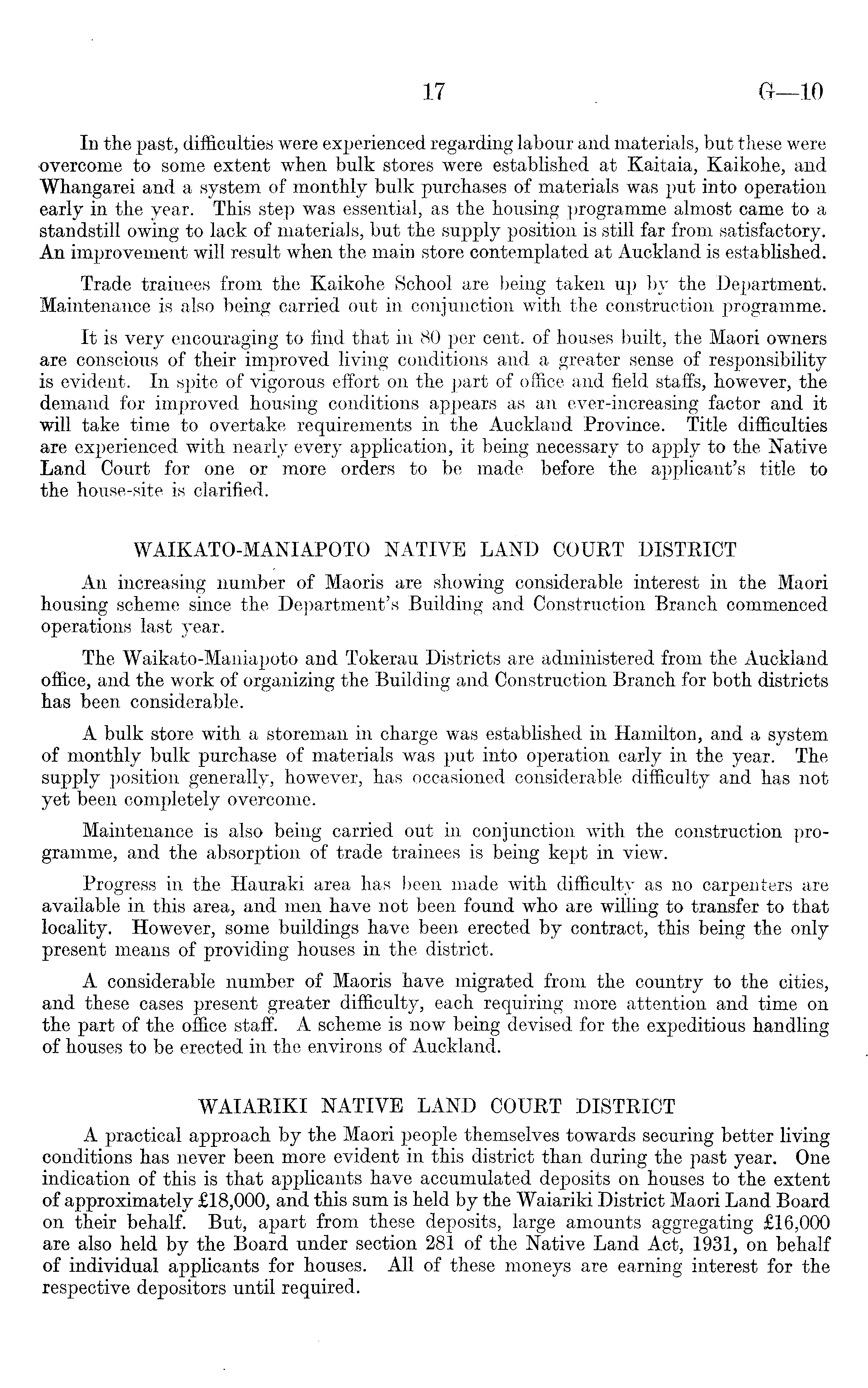 In the past, difficulties were experienced regarding labour and materials, but these were ■overcome to some extent when bulk stores were established at Kaitaia, Kaikohe, and Whangarei and a system of monthly bulk purchases of materials was put into operation early in the year. This step was essential, as the housing programme almost came to a standstill owing to lack of materials, but the supply position is still far from satisfactory. An improvement will result when the main store contemplated at Auckland is established. Trade trainees from the Kaikohe School are being taken up by the Department. Maintenance is also being carried out in conjunction with the construction programme. It is very encouraging to find that in 80 per cent, of houses built, the Maori owners are conscious of their improved living conditions and a greater sense of responsibility is evident. In spite of vigorous effort on the part of office and field staffs, however, the demand for improved housing conditions appears as an ever-increasing factor and it will take time to overtake requirements in the Auckland Province. Title difficulties are experienced with nearly every application, it being necessary to apply to the Native Land Court for one or more orders to be made before the applicant's title to the house-site is clarified. WAIKATO-MANIAPOTO NATIVE LAND COURT DISTRICT An increasing number of Maoris are showing considerable interest in the Maori housing scheme since the Department's Building and Construction Branch commenced operations last year. The Waikato-Maniapoto and Tokerau Districts are administered from the Auckland office, and the work of organizing the Building and Construction Branch for both districts has been considerable. A bulk store with a storeman in charge was established in Hamilton, and a system of monthly bulk purchase of materials was put into operation early in the year. The supply position generally, however, has occasioned considerable difficulty and has not yet been completely overcome. Maintenance is also being carried out in conjunction with the construction programme, and the absorption of trade trainees is being kept in view. Progress in the Hauraki area has been made with difficulty as no carpenters are available in this area, and men have not been found who are willing to transfer to that locality. However, some buildings have been erected by contract, this being the only present means of providing houses in the district. A considerable number of Maoris have migrated from the country to the cities, and these cases present greater difficulty, each requiring more attention and time on the part of the office staff. A scheme is now being devised for the expeditious handling of houses to be erected in the environs of Auckland. WAIARIKI NATIVE LAND COURT DISTRICT A practical approach by the Maori people themselves towards securing better living conditions has never been more evident in this district than during the past year. One indication of this is that applicants have accumulated deposits on houses to the extent of approximately £lB,OOO, and this sum is held by the Waiariki District Maori Land Board on their behalf. But, apart from these deposits, large amounts aggregating £16,000 are also held by the Board under section 281 of the Native Land Act, 1931, on behalf of individual applicants for houses. All of these moneys are earning interest for the respective depositors until required.