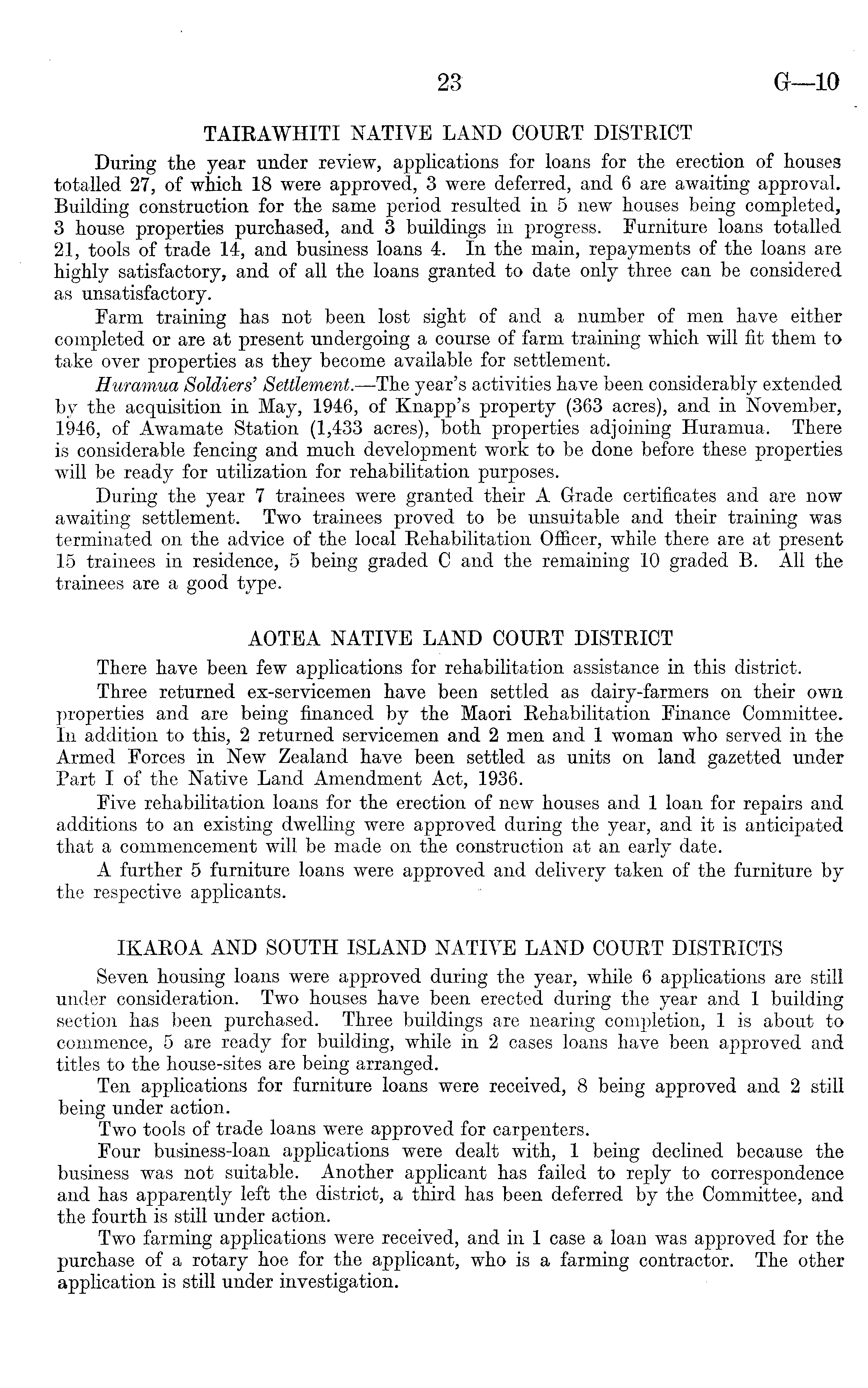TAIRAWHITI NATIVE LAND COURT DISTRICT During the year under review, applications for loans for the erection of houses totalled 27, of which 18 were approved, 3 were deferred, and 6 are awaiting approval. Building construction for the same period resulted in 5 new houses being completed, 3 house properties purchased, and 3 buildings in progress. Furniture loans totalled 21, tools of trade 14, and business loans 4. In the main, repayments of the loans are highly satisfactory, and of all the loans granted to date only three can be considered as unsatisfactory. Farm training has not been lost sight of and a number of men have either completed or are at present undergoing a course of farm training which will fit them to take over properties as they become available for settlement. Huramua Soldiers' Settlement. —The year's activities have been considerably extended by the acquisition in May, 1946, of Knapp's property (363 acres), and in November, 1946, of Awamate Station (1,433 acres), both properties adjoining Huramua. There is considerable fencing and much development work to be done before these properties will be ready for utilization for rehabilitation purposes. During the year 7 trainees were granted their A Grade certificates and are now awaiting settlement. Two trainees proved to be unsuitable and their training was terminated on the advice of the local Rehabilitation Officer, while there are at present 15 trainees in residence, 5 being graded C and the remaining 10 graded B. All the trainees are a good type. AOTEA NATIVE LAND COURT DISTRICT There have been few applications for rehabilitation assistance in this district. Three returned ex-servicemen have been settled as dairy-farmers on their own properties and are being financed by the Maori Rehabilitation Finance Committee. In addition to this, 2 returned servicemen and 2 men and 1 woman who served in the Armed Forces in New Zealand have been settled as units on land gazetted under Part I of the Native Land Amendment Act, 1936. Five rehabilitation loans for the erection of new houses and 1 loan for repairs and additions to an existing dwelling were approved during the year, and it is anticipated that a commencement will be made on the construction at an early date. A further 5 furniture loans were approved and delivery taken of the furniture by the respective applicants. IKAROA AND SOUTH ISLAND NATIVE LAND COURT DISTRICTS Seven housing loans were approved during the year, while 6 applications are still under consideration. Two houses have been erected during the year and 1 building section has been purchased. Three buildings are nearing completion, 1 is about to commence, 5 are ready for building, while in 2 cases loans have been approved and titles to the house-sites are being arranged. Ten applications for furniture loans were received, 8 being approved and 2 still being under action. Two tools of trade loans were approved for carpenters. Four business-loan applications were dealt with, 1 being declined because the business was not suitable. Another applicant has failed to reply to correspondence and has apparently left the district, a third has been deferred by the Committee, and the fourth is still under action. Two farming applications were received, and in 1 case a loan was approved for the purchase of a rotary hoe for the applicant, who is a farming contractor. The other application is still under investigation.