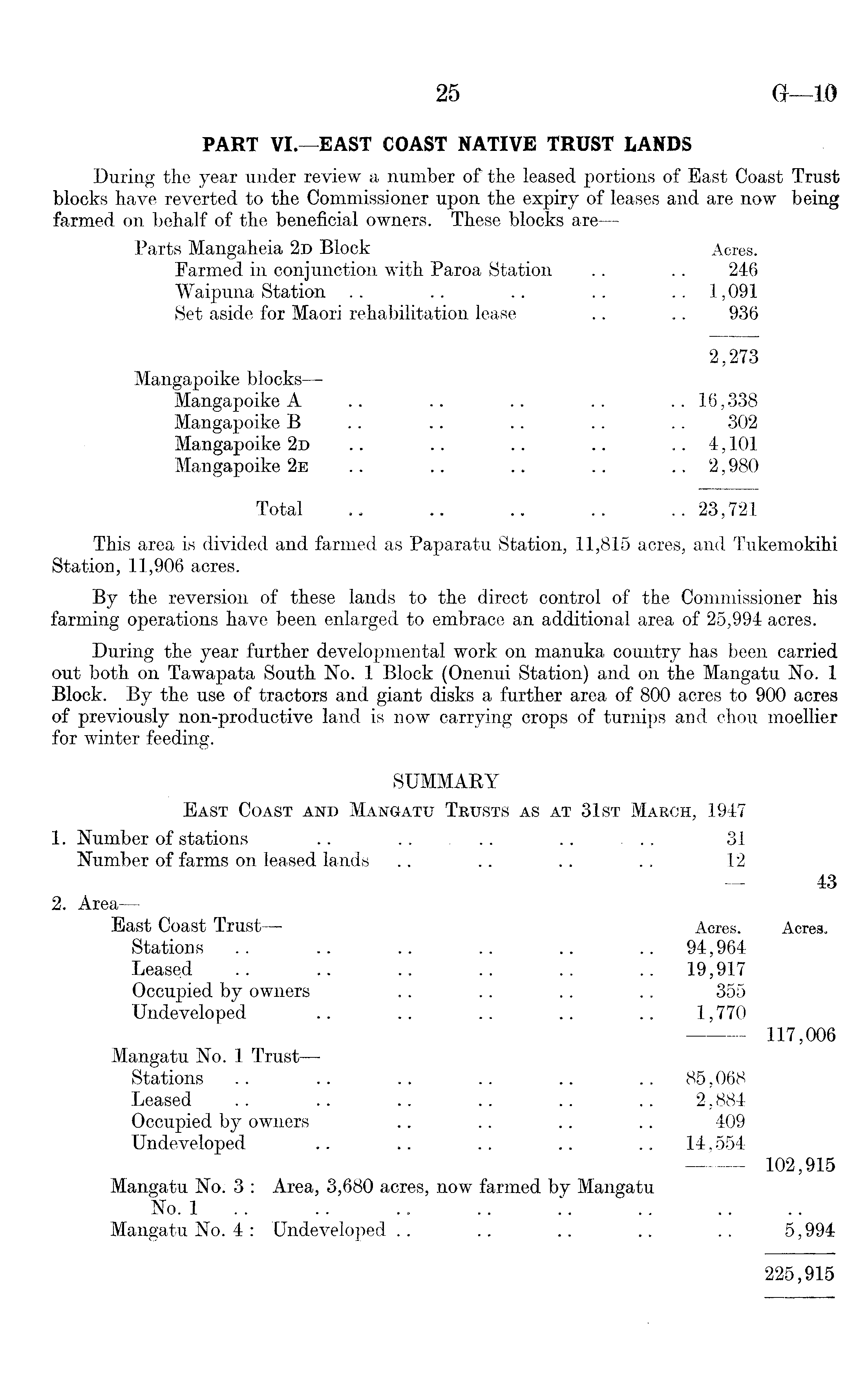 PART VI.—EAST COAST NATIVE TRUST LANDS During the year under review a number of the leased portions of East Coast Trust blocks have reverted to the Commissioner upon the expiry of leases and are now being farmed on behalf of the beneficial owners. These blocks are — Parts Mangaheia 2d Block Acres. Farmed in conjunction with Paroa Station .. .. 246 Waipuna Station .. .. .. .. .. 1,091 Set aside for Maori rehabilitation lease .. .. 936 2,273 Mangapoike blocks — Mangapoike A .. .. .. .. .. 16,338 Mangapoike B .. .. .. .. .. 302 Mangapoike 2d .. .. .. .. .. 4,101 Mangapoike 2e .. .. .. .. .. 2,980 Total .. .. .. .. .. 23,721 This area is divided and farmed as Paparatu Station, 11,815 acres, and Tukemokihi Station, 11,906 acres. By the reversion of these lands to the direct control of the Commissioner his farming operations have been enlarged to embrace an additional area of 25,994 acres. During the year further developmental work on manuka country has been carried out both on Tawapata South No. 1 Block (Onenui Station) and on the Mangatu No. 1 Block. By the use of tractors and giant disks a further area of 800 acres to 900 acres of previously non-productive land is now carrying crops of turnips and chou moellier for winter feeding. SUMMARY East Coast and Mangatu Trusts as at 31st March, 1947 1. Number of stations .. .. .. .. .. 31 Number of farms on leased lands .. .. .. .. 12 43 2. Area — East Coast Trust — Acres. Acres. Stations .. .. .. .. .. .. 94,964 Leased .. .. .. .. .. .. 19,917 Occupied by owners .. .. .. .. 355 Undeveloped .. .. .. .. .. 1,770 — 117,006 Mangatu No. 1 Trust — Stations .. .. .. .. .. .. 85,068 Leased .. .. .. .. .. .. 2,884 Occupied by owners .. .. .. .. 409 Undeveloped .. .. .. .. .. 14,554 102,915 Mangatu No. 3 : Area, 3,680 acres, now farmed by Mangatu No. 1 .. .. .. .. .. Mangatu No. 4 : Undeveloped .. .. .. .. .. 5,994 225,915