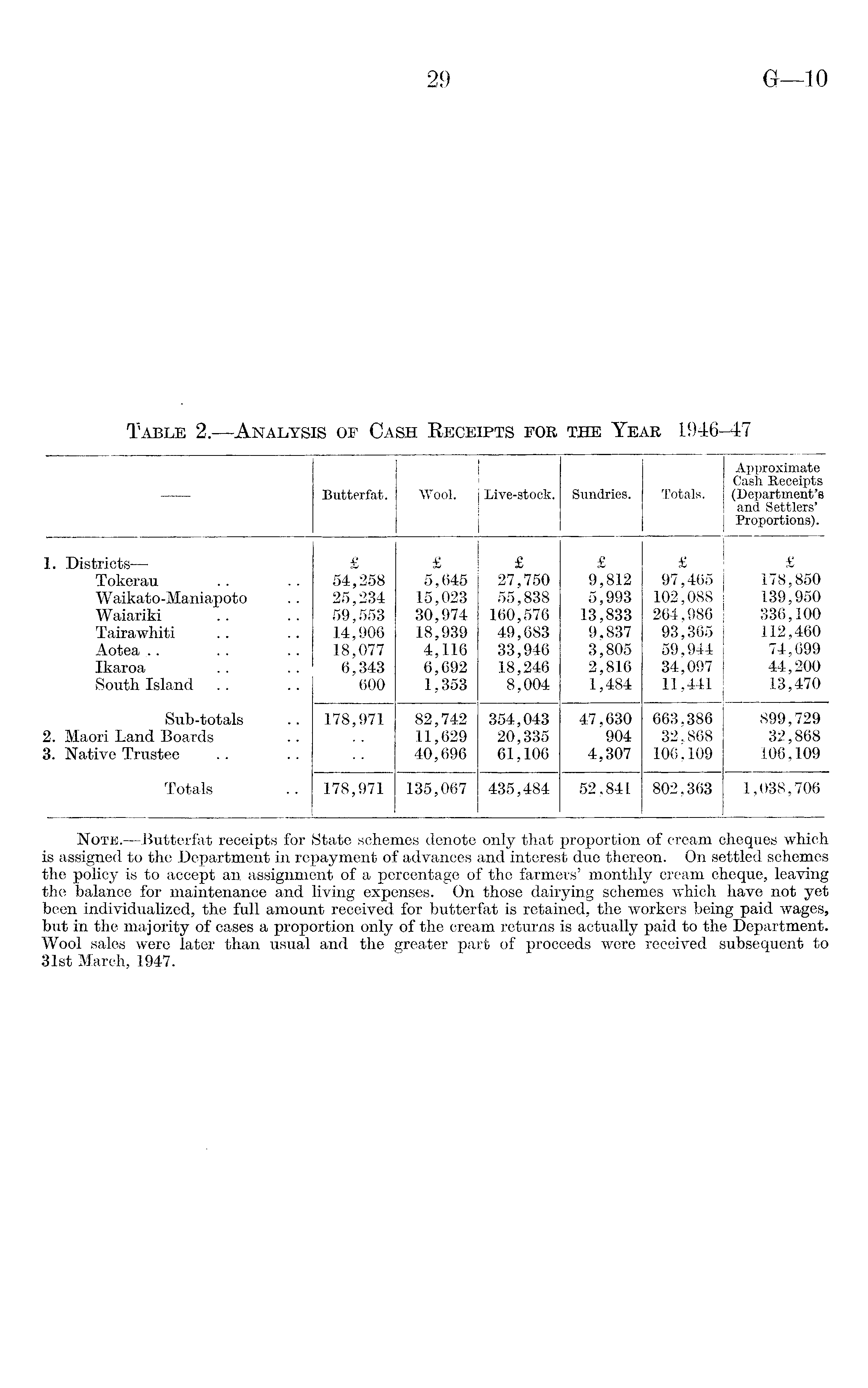 Note. —Butterfat receipts for State schemes denote only that proportion of cream cheques which is assigned to the Department in repayment of advances and interest due thereon. On settled schemes the policy is to accept an assignment of a percentage of the farmers' monthly cream cheque, leaving the balance for maintenance and living expenses. On those dairying schemes which have not yet been individualized, the full amount received for butterfat is retained, the workers being paid wages, but in the majority of cases a proportion only of the cream returns is actually paid to the Department. Wool sales were later than usual and the greater part of proceeds were received subsequent to 31st March, 1947.