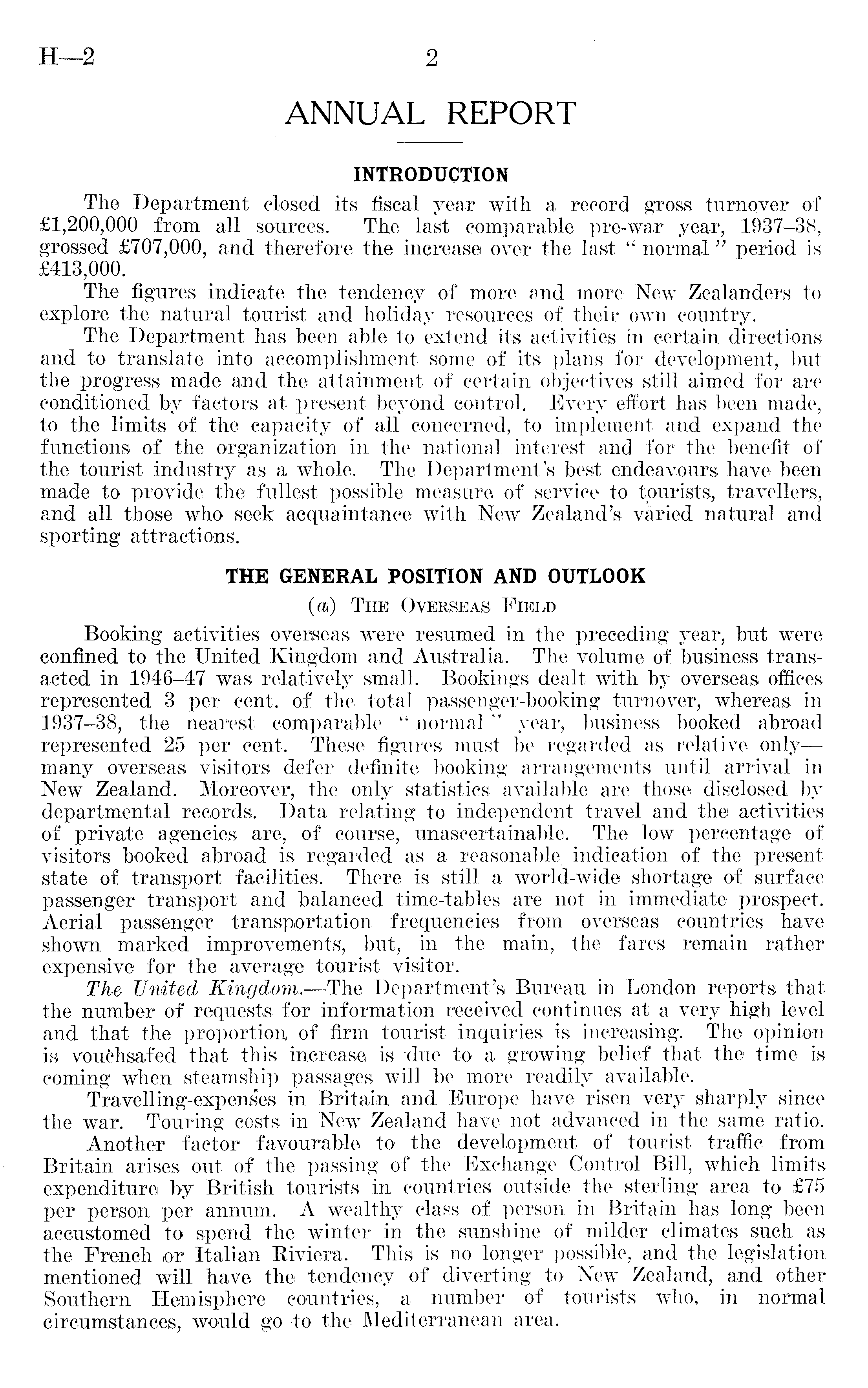 ANNUAL REPORT INTRODUCTION The Department closed its fiscal year with a record gross turnover of £1,200,000 from all sources. The last comparable pre-war year, 1937-38, grossed £707,000, and therefore the increase over the last " normal" period is £413,000. The figures indicate the tendency of more and more New Zealanders to explore the natural tourist and holiday resources of their own country. The Department has been able to extend its activities in certain directions and to translate into accomplishment some of its plans for development, but the progress made and the attainment of certain objectives still aimed for are conditioned by factors at present beyond control. Every effort has been made, to the limits of the capacity of all concerned, to implement and expand the functions of.the organization in the national interest and for the benefit of the tourist industry as a whole. The Department's best endeavours have been made to provide the fullest possible measure of service to tourists, travellers, and all those who seek acquaintance with New Zealand's varied natural and sporting attractions. THE GENERAL POSITION AND OUTLOOK (ai) The Overseas Field ■ Booking activities overseas were resumed in the preceding year, but were confined to the United Kingdom and Australia. The volume of business transacted in 1946-47 was relatively small. Bookings dealt with by overseas offices represented 3 per cent, of the total passenger-booking turnover, whereas in 1937-38, the nearest comparable " normal" year, business booked abroad represented 25 per cent. These figures mast be regarded as relative only—many overseas visitors defer definite booking arrangements- until arrival in New Zealand. Moreover, the only statistics available are those disclosed by departmental records. Data relating to independent travel and the activities oi private agencies are, of course, unascertainable. The low percentage of visitors booked abroad is regarded as a reasonable indication of the present state of transport facilities. There is still a'world-wide shortage of surface passenger transport and balanced time-tables are not in immediate prospect. Aerial passenger transportation frequencies from overseas countries have shown marked improvements, but, in the main, the fares remain rather 'expensive for the average tourist visitor. The United Kingdom.—The Department's Bureau in London reports that the number of requests for information received continues at a very high level and that the proportion of firm tourist inquiries is increasing. The opinion is vouchsafed that this increase is due to a growing belief that the time is coming when steamship passages will be more readily available. Travelling-expenses in Britain and Europe have risen very sharply since the war. Touring costs in New Zealand have not advanced in the same ratio. Another factor favourable to the development of tourist traffic from Britain arises out of the passing of the Exchange Control Bill, which limits expenditure by British tourists in countries outside the sterling area to £75 per person per annum. A wealthy class of person in Britain has long been accustomed to spend the winter in the sunshine of milder climates such as the French or Italian Riviera. This is no longer possible, and the legislation mentioned will have the tendency of diverting to New Zealand, and other Southern Hemisphere countries, a number of tourists who, in normal circumstances, would go to the Mediterranean area.