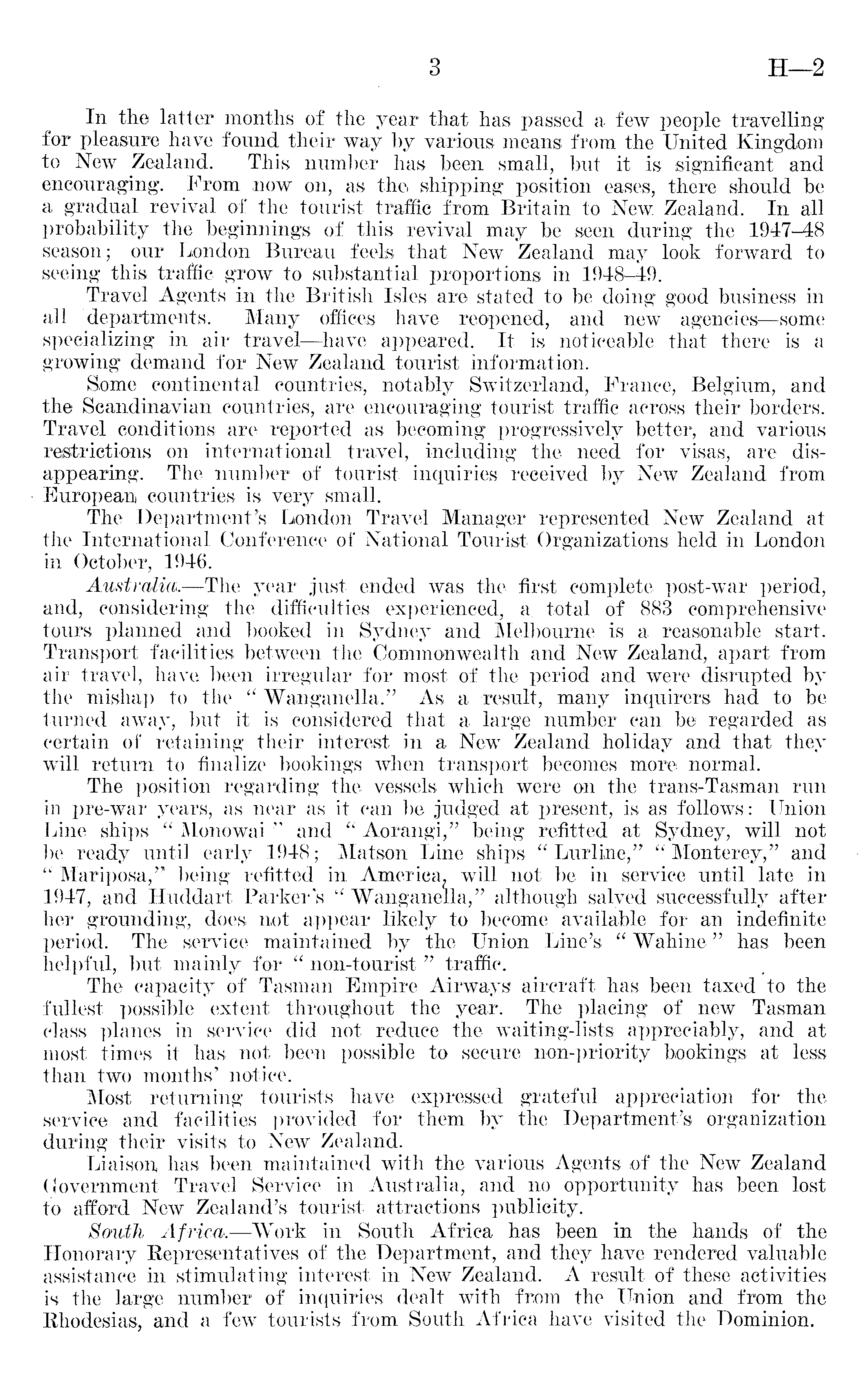 In the latter months of the year that has passed a few people travelling for pleasure have found their way by various means from the United Kingdom to New Zealand. This number has been small, but it is significant and encouraging. From now on, as the, shipping position eases, there should be a gradual revival of the tourist traffic from Britain to New Zealand. In all probability the beginnings of this revival may be seen during the 1947-48 season; our London Bureau feels that New Zealand may look forward to seeing this traffic grow to substantial proportions in 1948-49. Travel Agents in the British Isles are stated to be doing good business in all departments. Many offices have reopened, and new agencies—some specializing in air travel—have appeared. It is noticeable that there is a growing demand for New Zealand tourist information. Some continental v countries, notably Switzerland, France, Belgium, and the Scandinavian countries, are encouraging tourist traffic across their bdrders. Travel conditions are reported as becoming progressively better, and various restrictions on international travel, including the need for 'visas, are disappearing. The tiumber of tourist inquiries received by New Zealand from European countries is very small. The. Department's London Travel I .Manager represented New Zealand at the International Conference of National Tourist Organizations held in London in October, 1946. Australia).—The year just ended was the first complete post-war period, and, considering the difficulties experienced, a, total of 883 comprehensive tours planned and booked in Sydney and Melbourne is a reasonable start. Transport facilities between the Commonwealth and New Zealand, apart from air travel, have been irregular for most of the period and were disrupted by ,the mishap to the " Wanganella." As a result, many inquirers had to be turned away, but it is considered that, a large number can be regarded as certain of retaining their interest in a New Zealand holiday and that they will return to finalize bookings when transport becomes more normal. The- position regarding the vessels which were on the trans-Tasman run in pre-war years, as near as it can be judged at present, is as follows: Union Line ships " Monowai " and " being refitted at Sydney, will not be ready until early 1948; Mat-son Line ships " Lurline," " Monterey," and " Mariposa," being refitted in America, will not be in service until late in 1947, and Huddart Parker's " Wanganella," although salved successfully after her grounding, does not appear likely to become available for an indefinite period. The service maintained by the Union Line's " Wahine" has been helpful, but mainly for " non-tourist " traffic. The' capacity of Tasman Empire Airways' aircraft has been taxed to the fullest possible extent throughout the year. The. placing of new Tasman class planes in service did not reduce the waiting-lists appreciably, and at most times it has not been possible to secure non-priority bookings at less than two months' notice. Most < returning tourists have expressed grateful appreciation for the service and facilities provided for them by the Department's organization during their visits to New Zealand. Liaison, has been maintained with the various Agents of the New Zealand Government Travel' Service in Australia, and no opportunity has been lost to afford New/ Zealand's tourist attractions publicity. South Africa.- —Work in South Africa has been in the hands of the Honorary Representatives of the Department, and they have rendered valuable assistance in stimulating interest in New Zealand. A result of these activities is the large number of inquiries dealt with from the Union and from the Rhodesias, and a few tourists from South Africa have visited the Dominion.