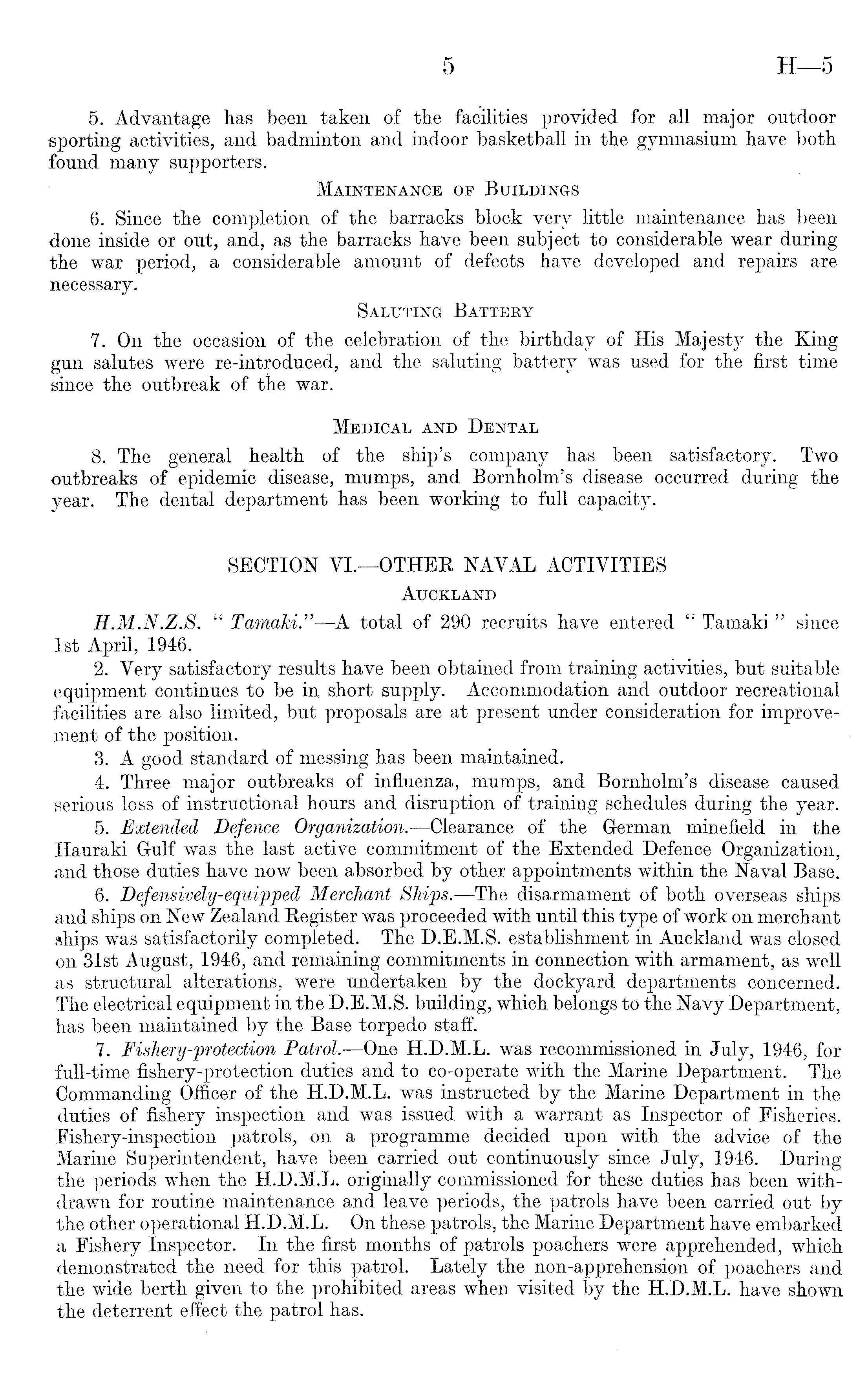 5. Advantage lias been taken of the facilities provided for all major outdoor sporting activities, and badminton and indoor basketball in the gymnasium have both found many supporters. Maintenance of Buildings 6. Since the completion of the barracks block very little maintenance has been done inside or out, and, as the barracks have been subject to considerable wear during the war period, a considerable amount of defects have developed and repairs are necessary. Saluting Battery 7. On the occasion of the celebration of the birthday of His Majesty the King gun salutes were re-introduced, and the saluting battery was used for the first time since the outbreak of the war. Medical and Dental 8. The general health of the ship's company has been satisfactory. Two outbreaks of epidemic disease, mumps, and Bornholm's disease occurred during the year. The dental department has been working to full capacity. SECTION VI.—OTHER NAVAL ACTIVITIES Auckland H.M.N.Z.S. " Tamaki."—A total of 290 recruits have entered " Tamaki" since Ist April, 1946. 2. Very satisfactory results have been obtained from training activities, but suitable equipment continues to be in short supply. Accommodation and outdoor recreational facilities are also limited, but proposals are at present under consideration for improvement of the position. 3. A good standard of messing has been maintained. 4. Three major outbreaks of influenza, mumps, and Bornholm's disease caused serious loss of instructional hours and disruption of training schedules during the year. 5. Extended Defence Organization. —Clearance of the German minefield in the Hauraki Gulf was the last active commitment of the Extended Defence Organization, and those duties have now been absorbed by other appointments within the Naval Base. 6. Defensively-equipped Merchant Ships. —The disarmament of both overseas ships and ships on New Zealand Register was proceeded with until this type of work on merchant ships was satisfactorily completed. The D.E.M.S. establishment in Auckland was closed on 31st August, 1946, and remaining commitments in connection with armament, as well as structural alterations, were undertaken by the dockyard departments concerned. The electrical equipment in the D.E.M.S. building, which belongs to the Navy Department, has been maintained by the Base torpedo staff. 7. Fishery-protection Patrol. —One H.D.M.L. was recommissioned in July, 1946, for full-time fishery-protection duties and to co-operate with the Marine Department. The Commanding Officer of the H.D.M.L. was instructed by the Marine Department in the duties of fishery inspection and was issued with a warrant as Inspector of Fisheries. Fishery-inspection patrols, on a programme decided upon with the advice of the Marine Superintendent, have been carried out continuously since July, 1946. During the periods when the H.D.M.L. originally commissioned for these duties has been withdrawn for routine maintenance and leave periods, the patrols have been carried out by the other operational H.D.M.L. On these patrols, the Marine Department have embarked a Fishery Inspector. In the first months of patrols poachers were apprehended, which demonstrated the need for this patrol. Lately the non-apprehension of poachers and the wide berth given to the prohibited areas when visited by the H.D.M.L. have shown the deterrent effect the patrol has.