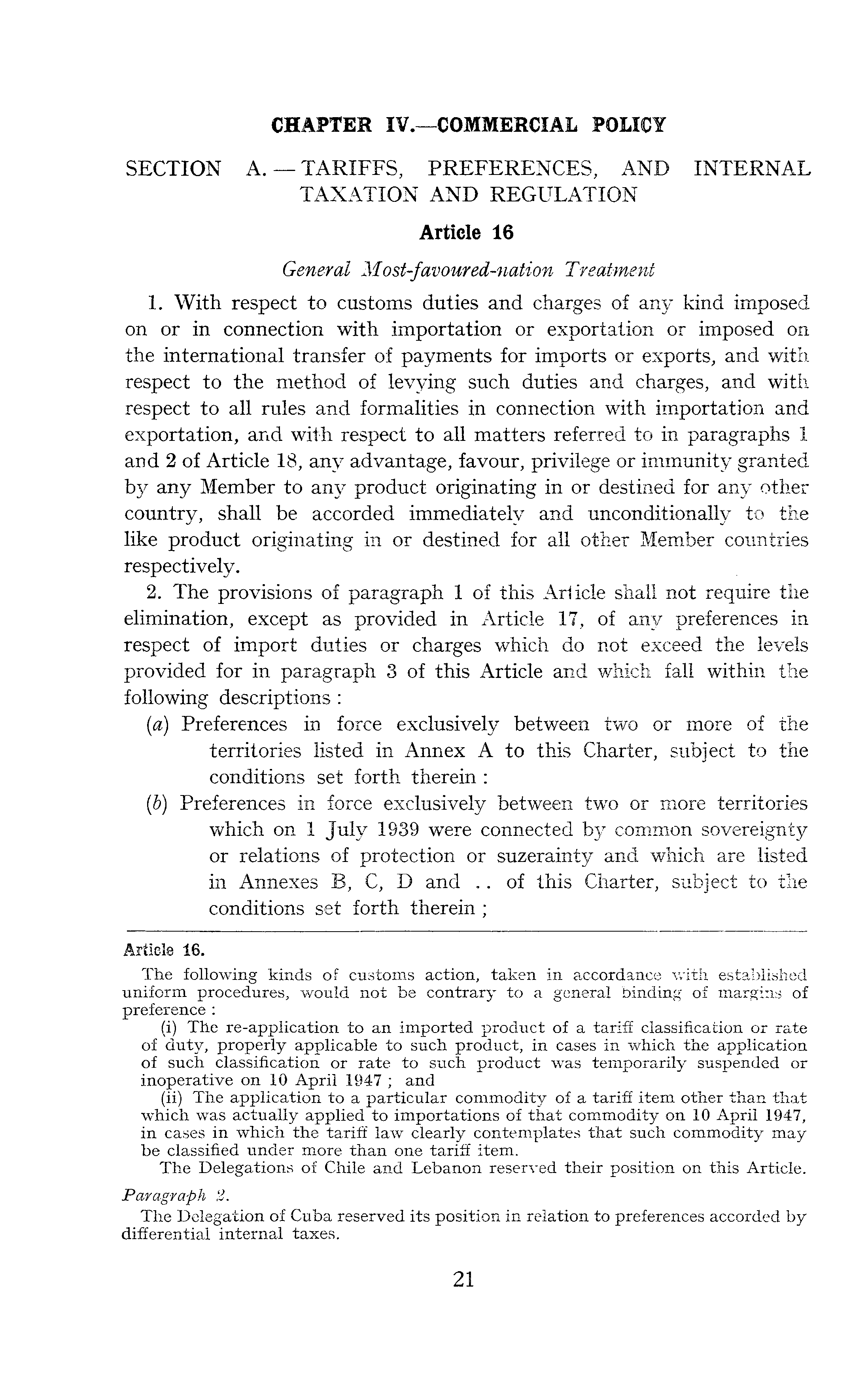 CHAPTER IV.—COMMERCIAL POLICY SECTION A. —TARIFFS, PREFERENCES, AND INTERNAL TAXATION AND REGULATION Article 16 General Most-favoured-nation Treatment 1. With respect to customs duties and charges of any kind imposed on or in connection with importation or exportation or imposed on the international transfer of payments for imports or exports, and with respect to the method of levying such duties and charges, and with respect to all rules and formalities in connection with importation and exportation, and with respect to all matters referred to in paragraphs 1 and 2 of Article 18, any advantage, favour, privilege or immunity granted by any Member to any product originating in or destined for any other country, shall be accorded immediately and unconditionally to the like product originating in or destined for all other Member countries respectively. 2. The provisions of paragraph 1 of this Article shall not require the elimination, except as provided in Article 17, of any preferences in respect of import duties or charges which do not exceed the levels provided for in paragraph 3 of this Article and which fall within the following descriptions : (a) Preferences in force exclusively between two or more of the territories listed in Annex A to this Charter, subject to the conditions set forth therein : (b) Preferences in force exclusively between two or more territories which on 1 July 1939 were connected by common sovereignty or relations of protection or suzerainty and which are listed in Annexes B, C, D and .. of this Charter, subject to the conditions set forth therein ;