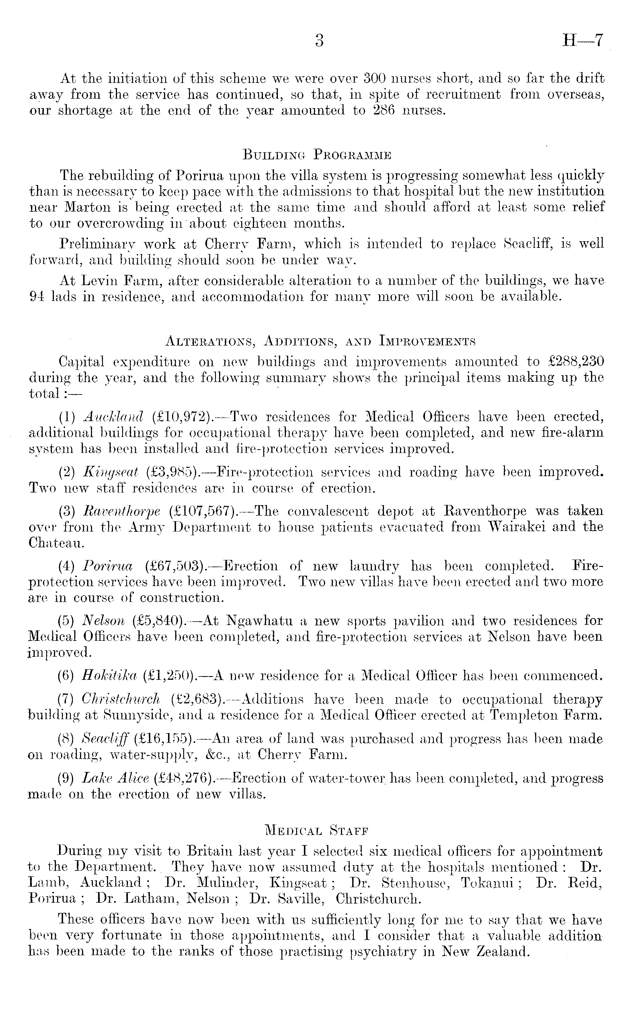 At the initiation of this scheme we were over 300 nurses short, and so far the drift away from the service has continued, so that, in spite of recruitment from overseas, our shortage at the end of the year amounted to 286 nurses. Building Programme The rebuilding of Porirua upon the villa system is progressing somewhat less quickly than is necessary to keep pace with the admissions to that hospital but the new institution near Marton is being erected at the same time and should afford at least some relief to our overcrowding in about eighteen months. Preliminary work at Cherry Farm, which is intended to replace Seacliff, is well forward, and building should soon be under way. At Levin Farm, after considerable alteration to a number of the buildings, we have 94 lads in residence, and accommodation for many more will soon be available. Alterations, Additions, and Improvements Capital expenditure on new buildings and improvements amounted to £288,230 during the year, and the following summary shows the principal items making up the total:— (1) Auckland (£10,972). —Two residences for Medical Officers have been erected, additional buildings for occupational therapy have been completed, and new fire-alarm system has been installed and fire-protection services improved. (2) King seat (£3,985). —Fire-protection services and roading have been improved. Two new staff residences are in course of erection. (3) Raventhorpe (£107,567). —The convalescent depot at Raventhorpe was taken over from the Army Department to house patients evacuated from Wairakei and the Chateau. (4) Porirua (£67,503). —Erection of new laundry has been completed. Fireprotection services have been improved. Two new villas have been erected and two more are in course of construction. (5) Nelson (£5,840). —At Ngawhatu a new sports pavilion and two residences for Medical Officers have been completed, and fire-protection services at Nelson have been improved. (6) Hokitika (£1,250). —A new residence for a Medical Officer has been commenced. (7) Christchurch (£2,683). —Additions have been made to occupational therapy building at Sunnyside, and a residence for a Medical Officer erected at Templeton Farm. (8) Seacliff (£16,155). —An area of land was purchased and progress has been made on roading, water-supply, &c., at Cherry Farm. (9) Lake Alice (£48,276). —Erection of water-tower, has been completed, and progress made on the erection of new villas. Medical Staff During my visit to Britain last year I selected six medical officers for appointment to the Department. They have now assumed duty at the hospitals mentioned : Dr. Lamb, Auckland; Dr. Mulinder, Kingseat; Dr. Stenhouse, Tokanui; Dr. Reid, Porirua ; Dr. Latham, Nelson ; Dr. Saville, Christchurch. These officers have now been with us sufficiently long for me to say that we have been very fortunate in those appointments, and I consider that a valuable addition, has been made to the ranks of those practising psychiatry in New Zealand.