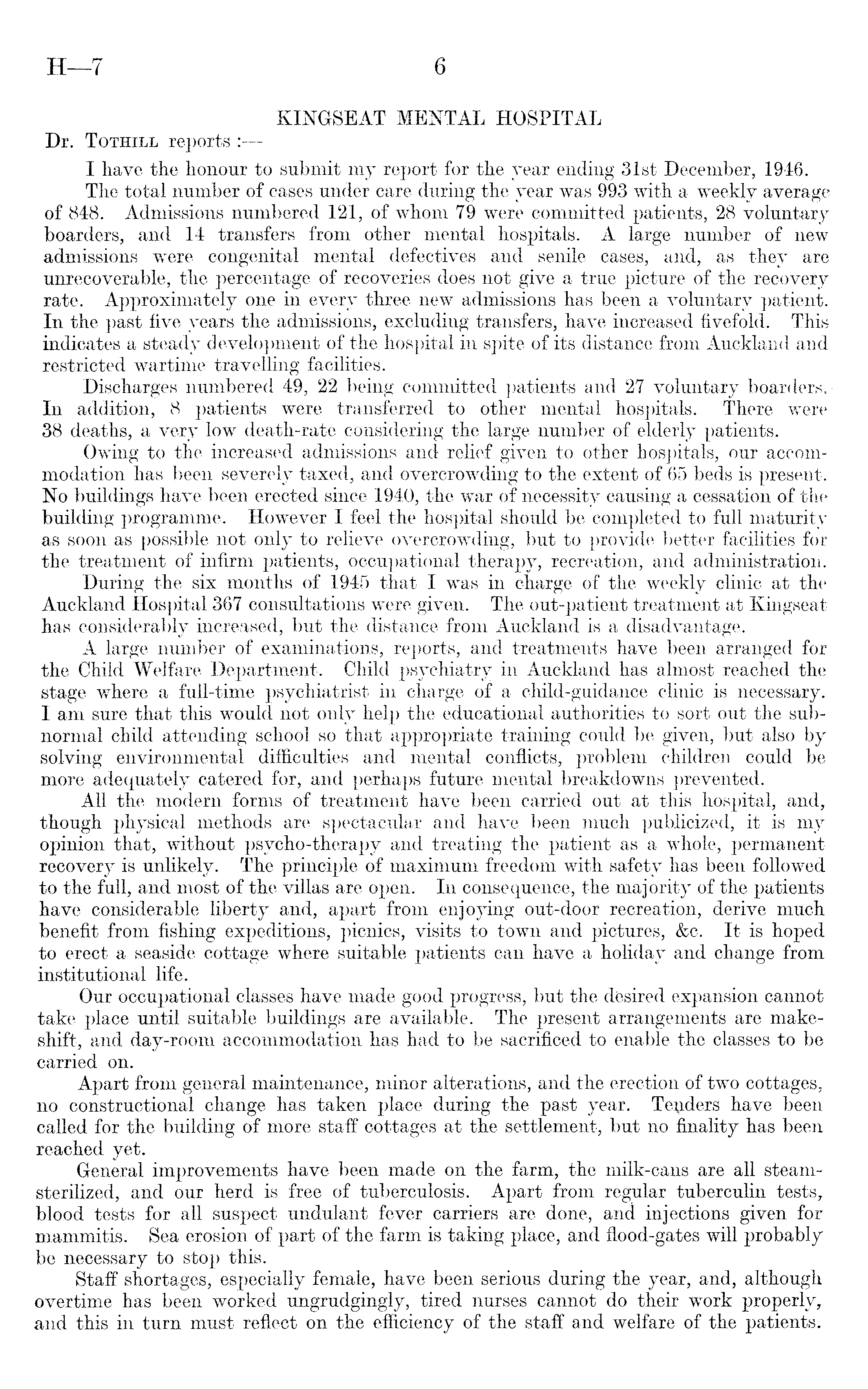 KINGSEAT MENTAL HOSPITAL Dr. Tothill reports : I have the honour to submit my report for the year ending 31st December, 1946. The total number of cases under care during the year was 993 with a weekly average of 848. Admissions numbered 121, of whom 79 were committed patients, 28 voluntary boarders, and 14 transfers from other mental hospitals. A large number of new admissions were congenital mental defectives and senile cases, and, as they are unrecoverable, the percentage of recoveries does not give a true picture of the recovery rate. Approximately one in every three new admissions has been a voluntary patient. In the past five years the admissions, excluding transfers, have increased fivefold. This indicates a steady development of the hospital in spite of its distance from Auckland and restricted wartime travelling facilities. Discharges numbered 49, 22 being committed patients and 27 voluntary boarders. In addition, 8 patients were transferred to other mental hospitals. There were 38 deaths, a very low death-rate considering the large number of elderly patients. Owing to the increased admissions and relief given to other hospitals, our accommodation has been severely taxed, and overcrowding to the extent of 65 beds is present. No buildings have been erected since 1940, the war of necessity causing a cessation of the building programme. However I feel the hospital should be completed to full maturity as soon as possible not only to relieve overcrowding, but to provide better facilities for the treatment of infirm patients, occupational therapy, recreation, and administration. During the six months of 1945 that I was in charge of the weekly clinic at the Auckland Hospital 367 consultations were given. The out-patient treatment at Kingseat has considerably increased, but the distance from Auckland is a disadvantage. A large number of examinations, reports, and treatments have been arranged for the Child Welfare Department. Child psychiatry in Auckland has almost reached the stage where a full-time psychiatrist in charge of a child-guidance clinic is necessary. I am sure that this would not only help the educational authorities to sort out the subnormal child attending school so that appropriate training could be given, but also by solving environmental difficulties and mental conflicts, problem children could be more adequately catered for, and perhaps future mental breakdowns prevented. All the modern forms of treatment have been carried out at this hospital, and, though physical methods are spectacular and have been much publicized, it is my opinion that, without psycho-therapy and treating the patient as a whole, permanent recovery is unlikely. The principle of maximum freedom with safety has been followed to the full, and most of the villas are open. In consequence, the majority of the patients have considerable liberty and, apart from enjoying out-door recreation, derive much benefit from fishing expeditions, picnics, visits to town and pictures, &c. It is hoped to erect a seaside cottage where suitable patients-can have a holiday and change from institutional life. Our occupational classes have made good progress, but the desired expansion cannot take place until suitable buildings are available. The present arrangements are makeshift, and day-room accommodation has had to be sacrificed to enable the classes to be carried on. Apart from general maintenance, minor alterations, and the erection of two cottages, no constructional change has taken place during the past year. Tenders have been called for the building of more staff cottages at the settlement, but no finality has been reached yet. General improvements have been made on the farm, the milk-cans are all steamsterilized, and our herd is free of tuberculosis. Apart from regular tuberculin tests, blood tests for all suspect undulant fever carriers are done, and injections given for mammitis. Sea erosion of part of the farm is taking place, and flood-gates will probably be necessary to stop this. Staff shortages, especially female, have been serious during the year, and, although overtime has been worked ungrudgingly, tired nurses cannot do their work properly, and this in turn must reflect on the efficiency of the staff and welfare of the patients.