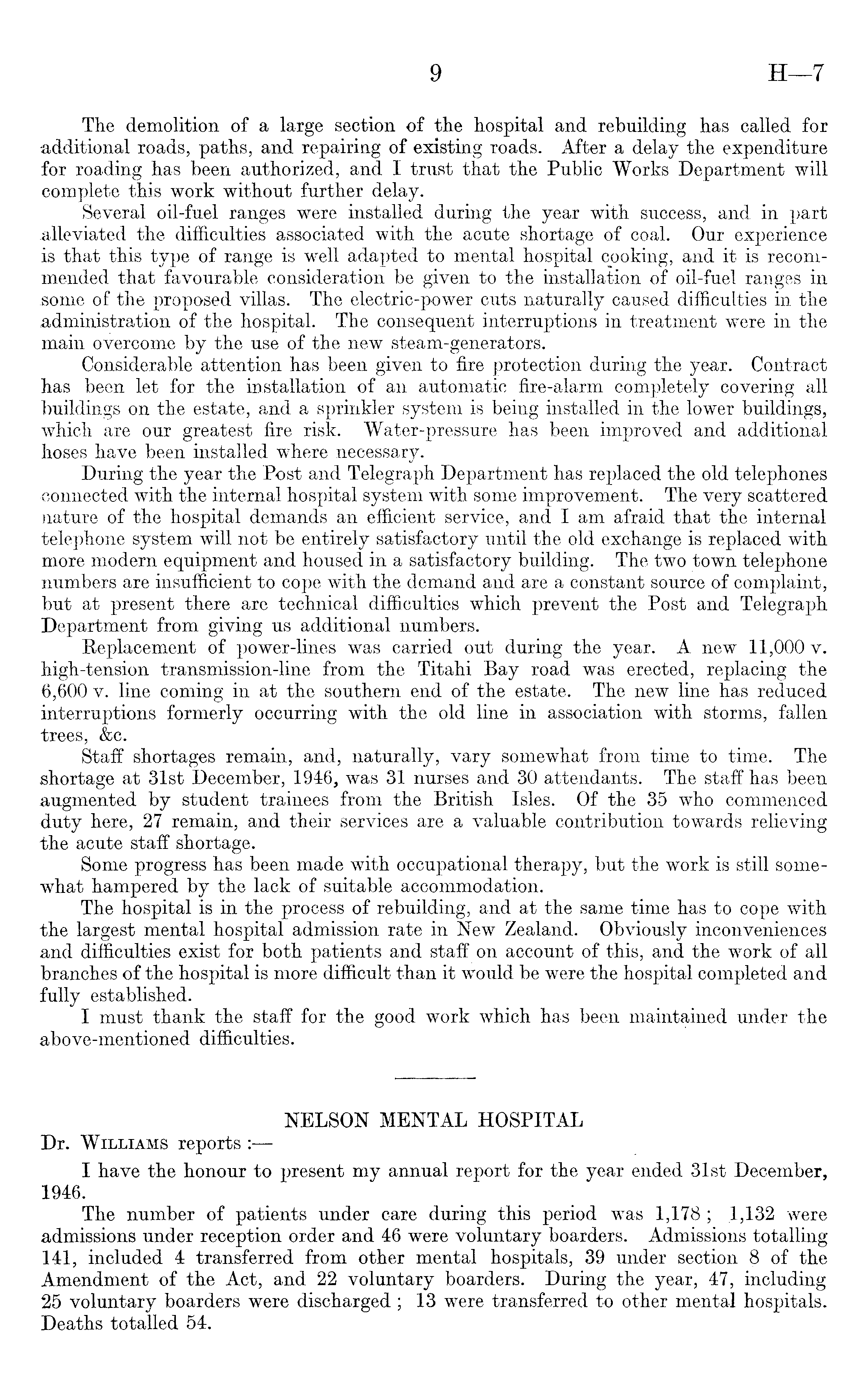 The demolition of a large section of the hospital and rebuilding has called for additional roads, paths, and repairing of existing roads. After a delay the expenditure for roading has been authorized, and I trust that the Public Works Department will complete this work without further delay. Several oil-fuel ranges were installed during the year with success, and in part alleviated the difficulties associated with the acute shortage of coal. Our experience is that this type of range is well adapted to mental hospital cooking, and it is recommended that favourable consideration be given to the installation of oil-fuel ranges in some of the proposed villas. The electric-power cuts naturally caused difficulties in the administration of the hospital. The consequent interruptions in treatment were in the main overcome by the use of the new steam-generators. Considerable attention has been given to fire protection during the year. Contract has been let for the installation of an automatic fire-alarm completely covering all buildings on the estate, and a sprinkler system is being installed in the lower buildings, which are our greatest fire risk. Water-pressure has been improved and additional hoses have been installed where necessary. During the year the Post and Telegraph Department has replaced the old telephones connected with the internal hospital system with some improvement. The very scattered nature of the hospital demands an efficient service, and I am afraid that the internal telephone system will not be entirely satisfactory until the old exchange is replaced with more modern equipment and housed in a satisfactory building. The two town telephone numbers are insufficient to cope with the demand and are a constant source of complaint, but at present there are technical difficulties which prevent the Post and Telegraph Department from giving us additional numbers. Replacement of power-lines was carried out during the year. A new 11,000 v. high-tension transmission-line from the Titahi Bay road was erected, replacing the 6,600 v. line coming in at the southern end .of the estate. The new line has reduced interruptions formerly occurring with the old line in association with storms, fallen trees, &c. Staff shortages remain, and, naturally, vary somewhat from time to time. The shortage at 31st December, 1946, was 31 nurses and 30 attendants. The staff has been augmented by student trainees from the British Isles. Of the 35 who commenced duty here, 27 remain, and their services are a valuable contribution towards relieving the acute staff shortage. Some progress has been made with occupational therapy, but the work is still somewhat hampered by the lack of suitable accommodation. The hospital is in the process of rebuilding, and at the same time has to cope with the largest mental hospital admission rate in New Zealand. Obviously inconveniences and difficulties exist for both patients and staff on account of this, and the work of all branches of the hospital is more difficult than it would be were the hospital completed and fully established. I must thank the staff for the good work which has been maintained under the above-mentioned difficulties. NELSON MENTAL HOSPITAL Dr. Williams reports : I have the honour to present my annual report for the year ended 31st December, 1946. The number of patients under care during this period was 1,178 ; 1,132 were admissions under reception order and 46 were voluntary boarders. Admissions totalling 141, included 4 transferred from other mental hospitals, 39 under section 8 of the Amendment of the Act, and 22 voluntary boarders. During the year, 47, including 25 voluntary boarders were discharged; 13 were transferred to other mental hospitals. Deaths totalled 54.