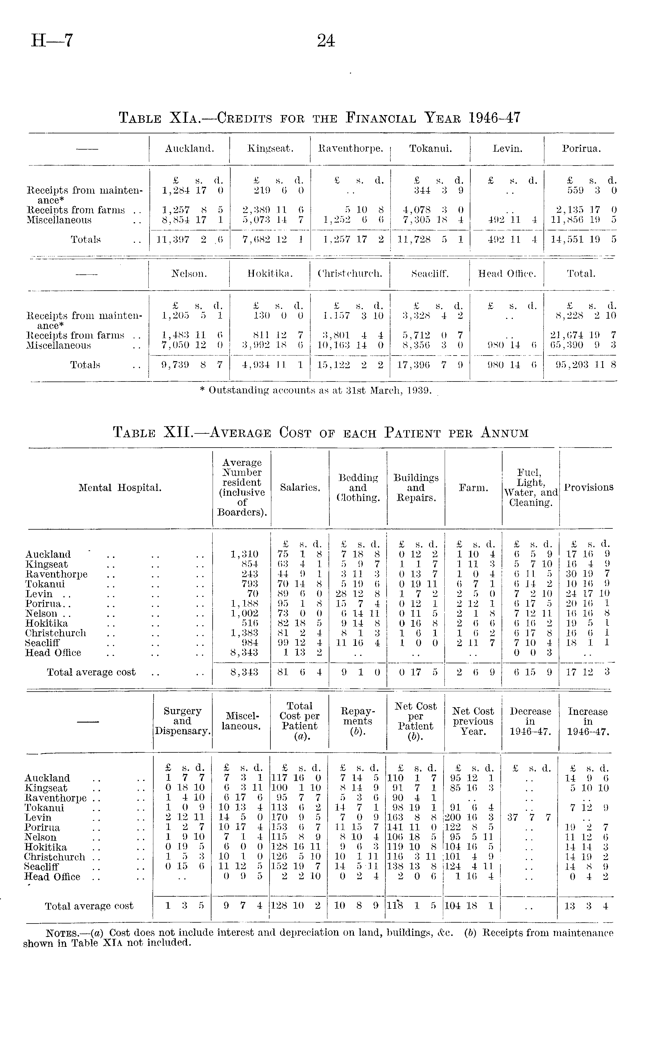 Mental Hospital. Average Number resident (inclusive of Boarders). Salaries. Bedding and Clothing. Buildings and Repairs. Farm. Fuel, Light, Water, and Cleaning. . Provisions Auckland " Kingseat Raventhorpe Tokanui Levin Porirua.. Nelson Hokitika .. .. Christchurch .. .. - SeaclifF Head Office Total average cost 1,310 854 243 793 70 1,188 1,002 516 1,383 984 8,343 £ s. d. 75 1 -8. 63 4 1 44 9 1 70 14 8 89 6 0 95 1 8 73 0 0 82 18 5 81 2 4 99 12 4 1 13 2 £ s. d. 7 18 8, 5 9 7 3 11 3T"' 5 19 6 28 12 8 15 7 4 6 14 11 9 14 8 8 13 11 16 4 £ s. d. 0 12 2 117 0 13 7 .0 19 11 17 2 0 12 1 0 11 5 0 16 8 16 1 10 0 £ s. d. 1 10 <4 1 11 3 10 4 6 7 1 2 5 0 il2 1 2 18 2 6 6 1 6 .2 2 11 7 £ s. d. 6 5 9 5 7 10 6 11 5 6 14 2 7 2 Iff 6 17 5 7 12 11 6 16 2 6 17 8 7 10 4 0 0 3 £ s. d. 17 16 9 16 4 9 30 19 7 10 16 9 24 17 10 20 16 1 16 16 8 19 5 1 16 6 1 18 1 1 8,343 81 6 4 9 10. 0 17 5 2 6~ 9 6 15 9 17 12 3 Surgery and Dispensary. Miscellaneous. Total Cost per Patient (a). Repayments (&). Net Cost per Patient (&)• Net Cost previous Year. Decrease in 1946-47. ( Increase in 1946-47. Auckland Kingseat Raventhorpe Tokanui Levin Porirua Nelson Hokitika Christchurch .. •Seacliff Head Office .. . Total average cost £ s. d. 17 7 0 18 10 1 4 10 10 9 2 12 11 12 7 1 9 10 0 19 5 15 3 0 15 6 £ s. d. 7 3 1 6 3 ,11 6 17 6 10 13 4 14 5 0 10 17 4 7 14 6 0 0 10 1 0 11 12 5 0 9 5 £ s. d. 117 16 0 100 1 10 95 7 7 113 6 2 170 9 5 153 6 7 115 8 9 128 16 11 126 5 10 152 19 7 2 2 10 £ s. d. 7 14 5 8 14 9 5 3 6 14 7 1 7 0 9 11 15 7 8 10 4 9 6 3 10 1 11 14 5 11 0 2 4 £ s. d. 110 1 7 91 7 1 90 4 1 98 19 1 163 8 8 141 11 0 106 18 5 119 10 8 116 3 11 138 13 8 2 0 6 £ 95 12 1 85 16 3 91 6 4 200 16 3 122 8 5 95 5 11 104 16 5 101 4 9 124 4 11 1 16 4 £ s.' d. 37 '7 7 £'' s. d. 14 9 6 5 10 10 7 i.2 9 19 2 7 11 12 6 : 14 14 3 14 19 2 14 8 9 0 4 2 13 5 9 7 4 128 10 2 10 8 9 1 5 104 18 1 13 3 4 Notes. —(a) Cost does not include interest and depreciation on land, buildings, <fec. (6) Receipts from maintenance shown in Table XIA not included.