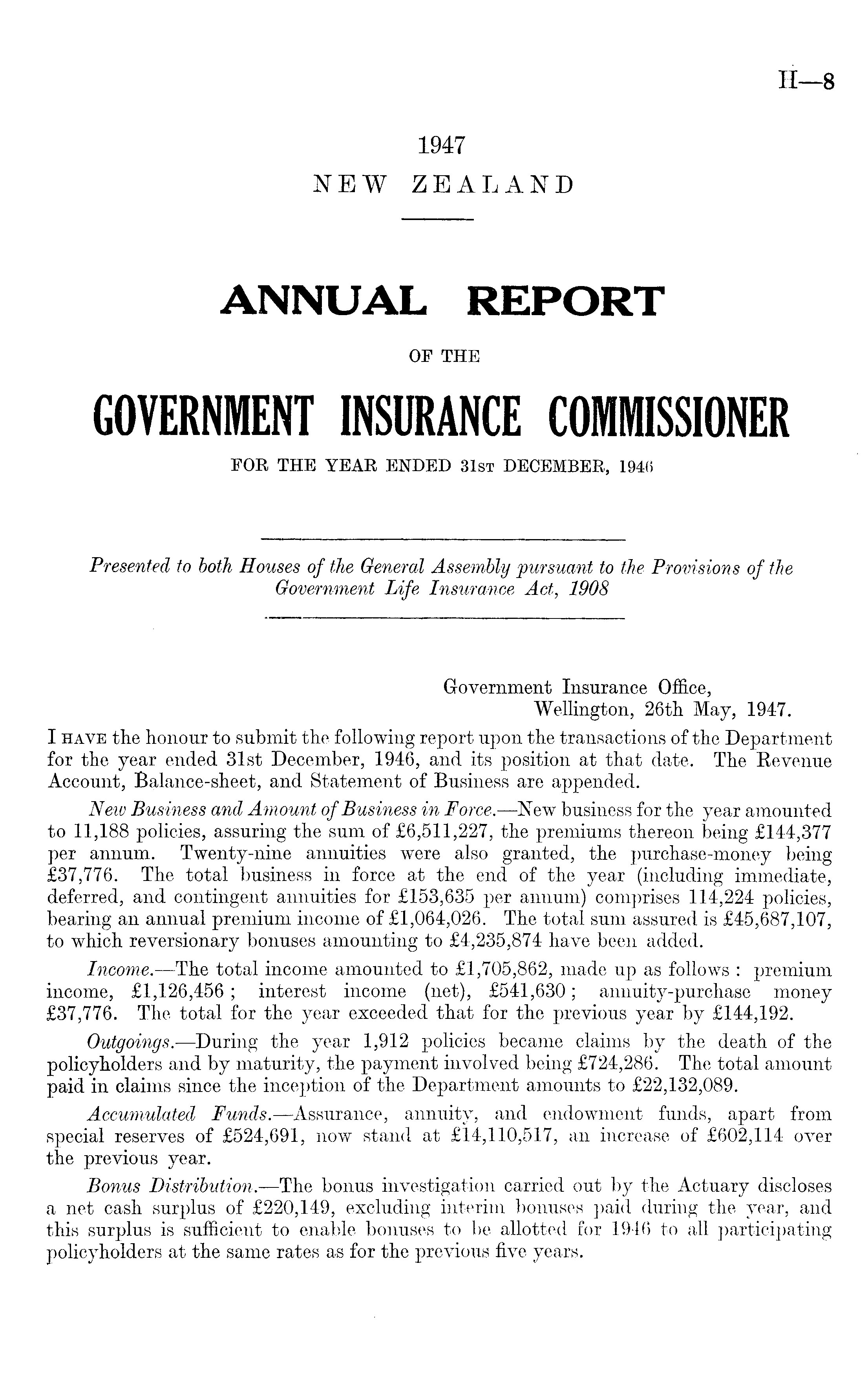Government Insurance Office, Wellington, 26th May, 1947. I have tlie honour to submit the following report upon the transactions of the Department for the year ended 31st December, 1946, and its position at that date. The Revenue Account, Balance-sheet, and Statement of Business are appended. New Business and Amount of Business in Force. —New business for the year amounted to 11,188 policies, assuring the sum of £6,511,227, the premiums thereon being £144,377 per annum. Twenty-nine annuities were also granted, the purchase-money being £37,776. The total business in force at the end of the year (including immediate, deferred, and contingent annuities for £153,635 per annum) comprises 114,224 policies, bearing an annual premium income of £1,064,026. The total sum assured is £45,687,107, to which reversionary bonuses amounting to £4,235,874 have been added. Income. —The total income amounted to £1,705,862, made up as follows : premium income, £1,126,456; interest income (net), £541,630; annuity-purchase money £37,776. The total for the year exceeded that for the previous year by £144,192. Outgoings.—During the year 1,912 policies became claims by the death of the policyholders and by maturity, the payment involved being £724,286. The total amount paid in claims since the inception of the Department amounts to £22,132,089. Accumulated Funds. —Assurance, annuity, and endowment funds, apart from special reserves of £524,691, now stand at £14,110,517, an increase of £602,114 over the previous year. Bonus Distribution. —The bonus investigation carried out by the Actuary discloses a net cash surplus of £220,149, excluding interim bonuses paid during the year, and this surplus is sufficient to enable bonuses to be allotted for 1946 to all participating policyholders at the same rates as for the previous five years.
