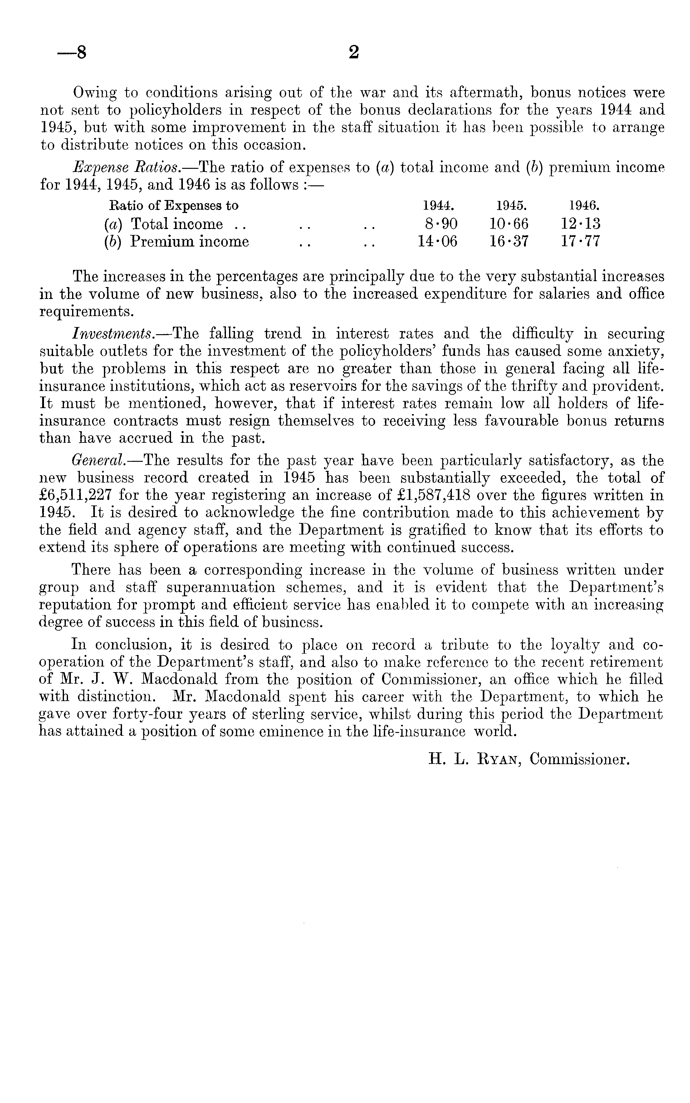 Owing to conditions arising out of the war and its aftermath, bonus notices were not sent to policyholders in respect of the bonus declarations for the years 1944 and 1945, but with some improvement in the staff situation it has been possible to arrange to distribute notices on this occasion. Expense Ratios. —The ratio of expenses to (a) total income and (b) premium income for 1944,1945, and 1946 is as follows : Ratio of Expenses to 1944. 1945. 1946. (a) Total income .. .. .. B*9o 10*66 12-13 (b) Premium income .. .. 14*06 16*37 17*77 The increases in the percentages are principally due to the very substantial increases in the volume of new business, also to the increased expenditure for salaries and office requirements. Investments. —The falling trend in interest rates and the difficulty in securing suitable outlets for the investment of the policyholders' funds has caused some anxiety, but the problems in this respect are no greater than those in general facing all lifeinsurance institutions, which act as reservoirs for the savings of the thrifty and provident. It must be mentioned, however, that if interest rates remain low all holders of lifeinsurance contracts must resign themselves to receiving less favourable bonus returns than have accrued in the past. General. —The results for the past year have been particularly satisfactory, as the new business record created in 1945 has been substantially exceeded, the total of £6,511,227 for the year registering an increase of £1,587,418 over the figures written in 1945. It is desired to acknowledge the fine contribution made to this achievement by the field and agency staff, and the Department is gratified to know that its efforts to extend its sphere of operations are meeting with continued success. There has been a corresponding increase in the volume of business written under group and staff superannuation schemes, and it is evident that the Department's reputation for prompt and efficient service has enabled it to compete with an increasing degree of success in this field of business. In conclusion, it is desired to place on record a tribute to the loyalty and cooperation of the Department's staff, and also to make reference to the recent retirement of Mr. J. W. Macdonald from the position of Commissioner, an office which he filled with distinction. Mr. Macdonald spent his career with the Department, to which he gave over forty-four years of sterling service, whilst during this period the Department has attained a position of some eminence in the life-insurance world. H. L. Ryan, Commissioner.