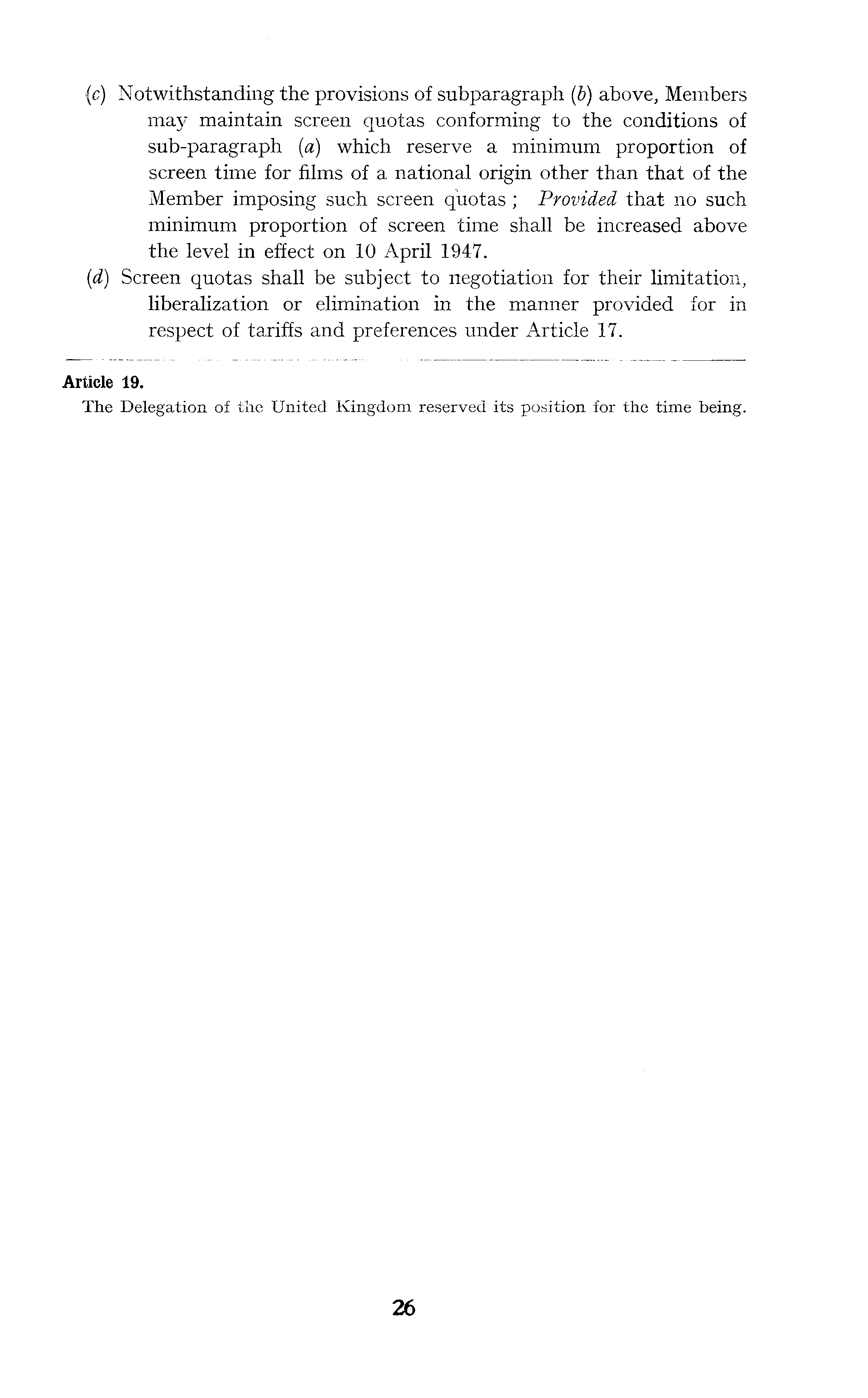 (c) Notwithstanding the provisions of subparagraph (b) above, Members may maintain screen quotas conforming to the conditions of sub-paragraph (a) which reserve a minimum proportion of screen time for films of a national origin other than that of the Member imposing such screen quotas; Provided that no such minimum proportion of screen time shall be increased above the level in effect on 10 April 1947. (d) Screen quotas shall be subject to negotiation for their limitation, liberalization or elimination in the manner provided for in respect of tariffs and preferences under Article 17.