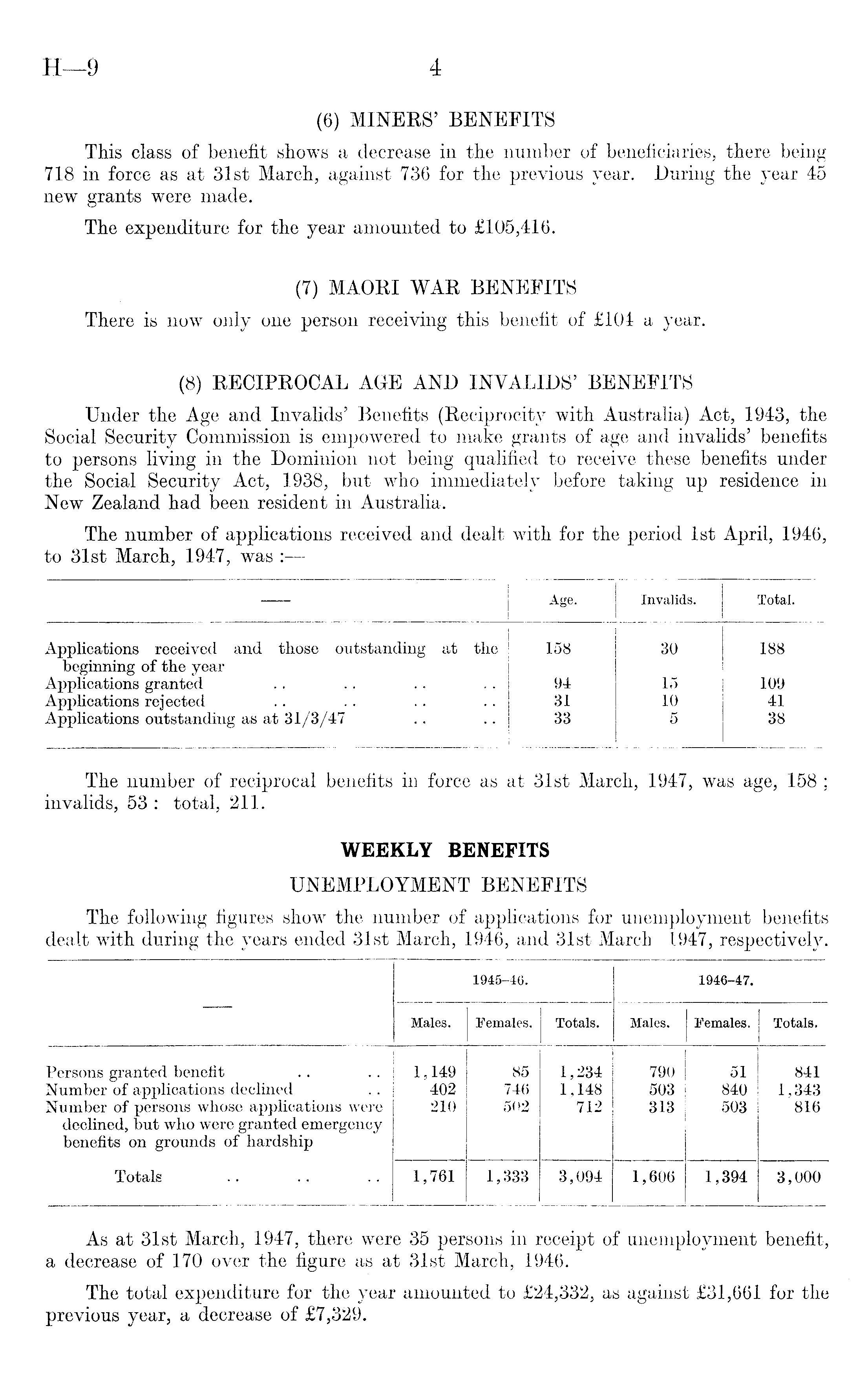 (6) MINERS' BENEFITS This class of benefit shows a decrease in the number of beneficiaries, there being 718 in force as at 31st March, against 736 for the previous year. During the year 45 new grants were made. The expenditure for the year amounted to £105,416. (7) MAORI WAR BENEFITS There is now only one person receiving this benefit of £lO4 a year. (8) RECIPROCAL AGE AND INVALIDS' BENEFITS Under the Age and Invalids' Benefits (Reciprocity with Australia) Act, 1943, the Social Security Commission is empowered to make grants of age and invalids' benefits to persons living in the Dominion not being qualified to receive these benefits under the Social Security Act, 1938, but who immediately before taking up residence in New Zealand had been resident in Australia. The number of applications received and dealt with for the period Ist April, 1946, to 31st March, 1947, was :