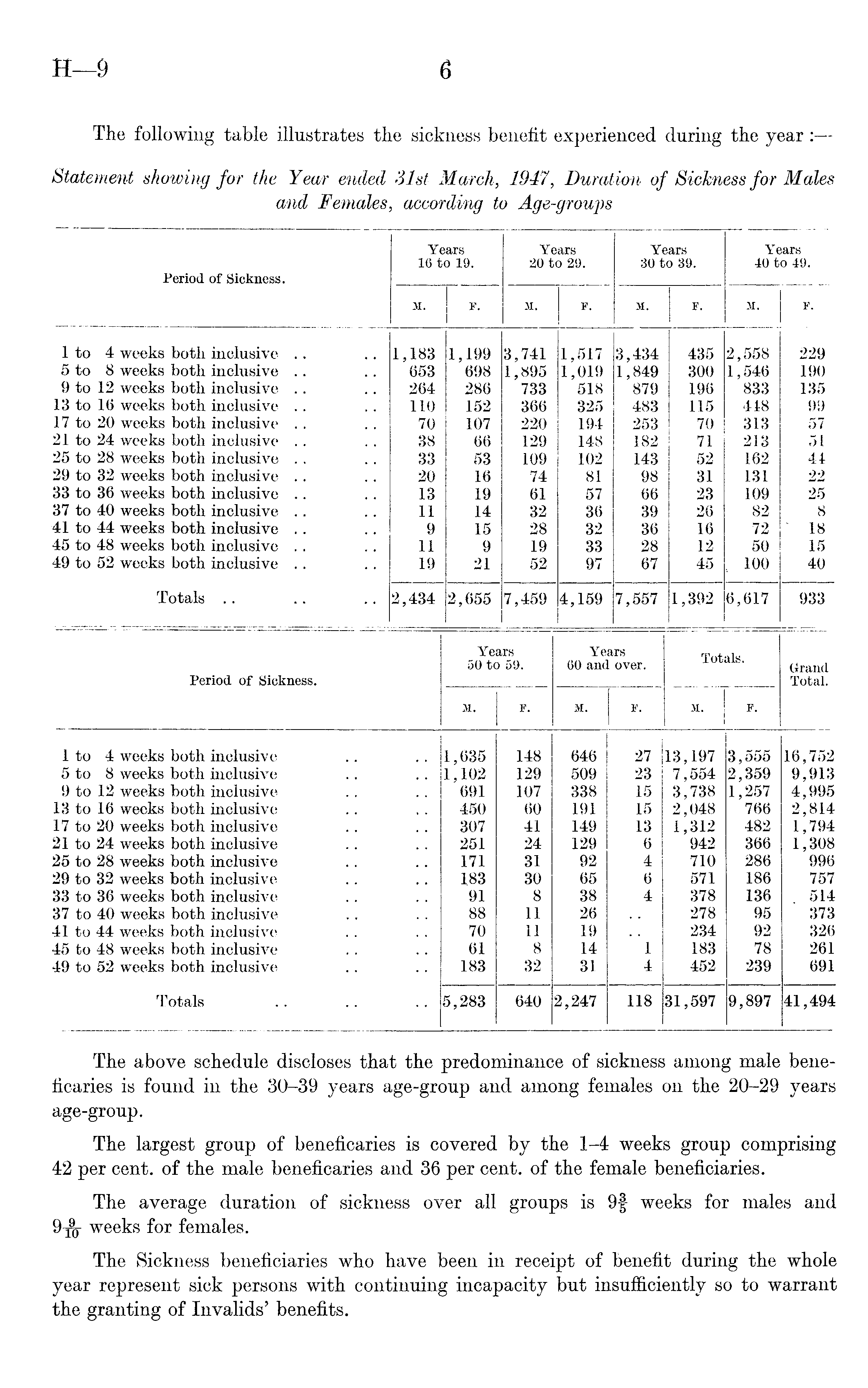 Statement showing for the Year ended 31st March, 1947, Duration of Sickness for Males and Females, according to Age-groups