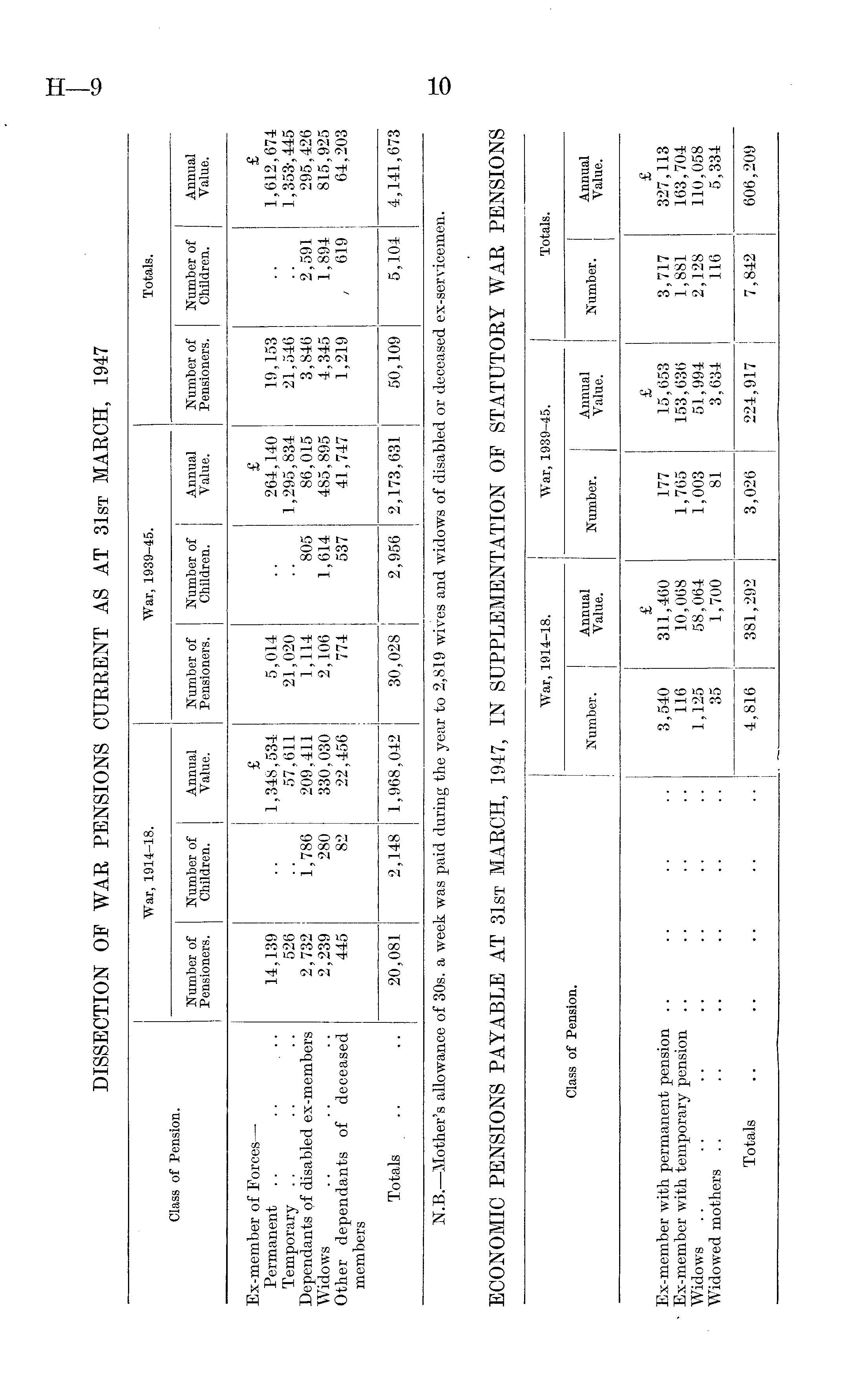 Class of Pension. War, 1914-18. War, 1939-45. Totals. Number of Pensioners. Number of Children. Annual Value. Number of Pensioners. Number of Children. Annual Value. Number of Pensioners. Number of Children. Annual Value. Ex-member of Forces —- Permanent .. .. Temporary .. Dependants of disabled ex-members Widows Other dependants of deceased members 14,139 526 2,732 2,239 445 1,186 280 82 £ 1,348,534 57,611 209,411 330,030 22,456 " 5,014 21,020 1,114 2,106 774 ' 805 1,614 537 £ 264,140 1,295,834 86,015 485,895 41,747 19,153 21,546 3,846 4,345 1,219 2 j 591 1,894 , 619 £ 1,-612,674 1,353-, 445 295,426 815,925 64,203 Totals 20,081 2,148 1,968,042 30,028 2,956 2,T73,631 50,109 5,104 4,141,673 N.B. —Mother's allowance of 30s. a week was paid during the year to 2,819 wives and widows of disabled or deceased ex-servicemen.