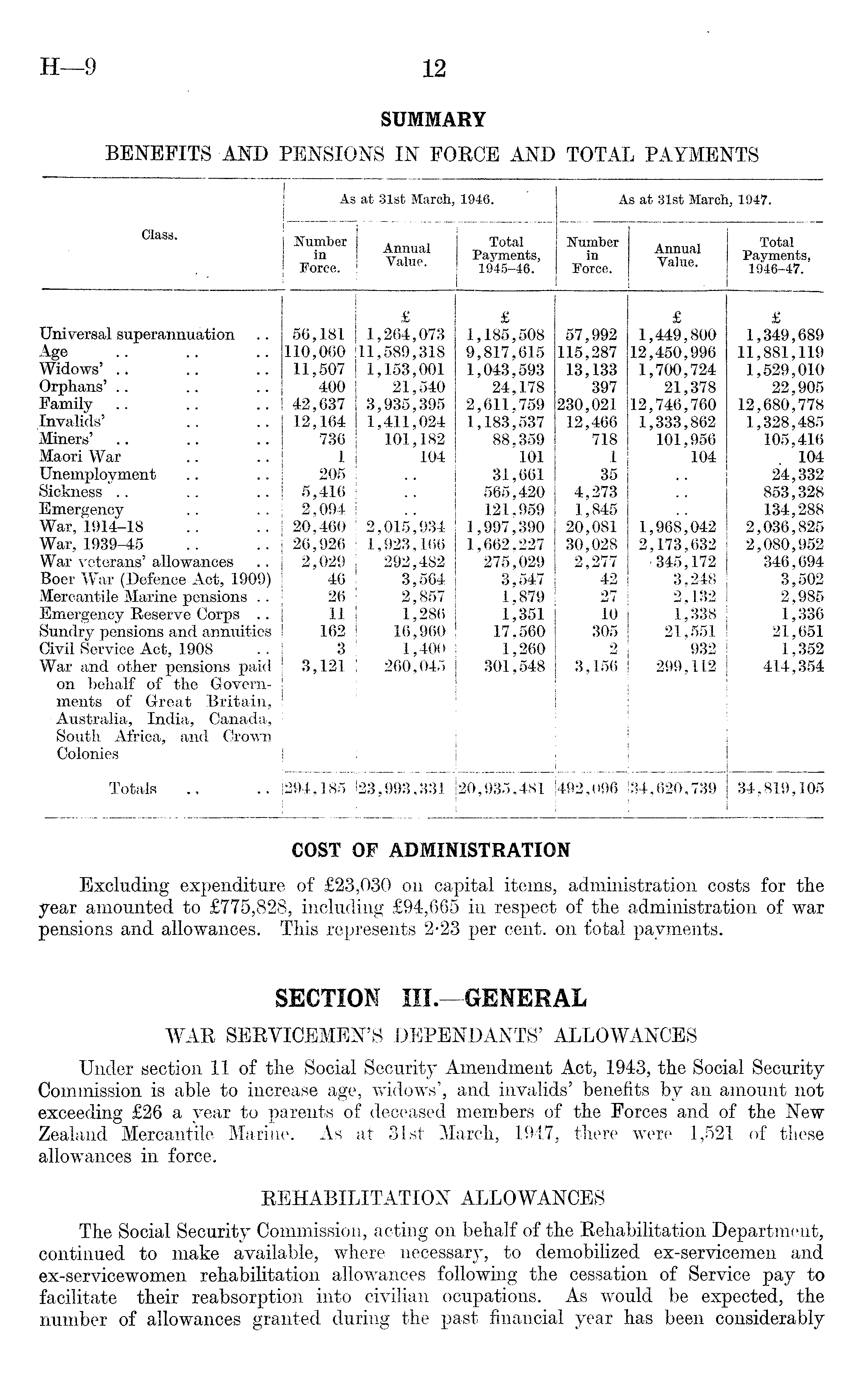 COST OF ADMINISTRATION Excluding expenditure of £23,030 on capital items, administration costs for the year amounted to £775,828, including £94,665 in respect of the administration of war pensions and allowances. This represents 2-23 per cent, on total payments. SECTION 111. GENERAL WAR SERVICEMEN'S DEPENDANTS' ALLOWANCES Under section 11 of the Social Security Amendment Act, 1943, the Social Security Commission is able to increase age, widows', and invalids' benefits by an amount not exceeding £26 a year to parents of deceased members of the Forces and of the New Zealand Mercantile Marine. As at 31st March, 1947, there were 1,521 of these allowances in force. REHABILITATION ALLOWANCES The Social Security Commission, acting on behalf of the Rehabilitation Department, continued to make available, where necessary, to demobilized ex-servicemen and ex-servicewomen rehabilitation allowances following the cessation of Service pay to facilitate their reabsorption into civilian ocupations. As would be expected, the number of allowances granted during the past financial year has been considerably