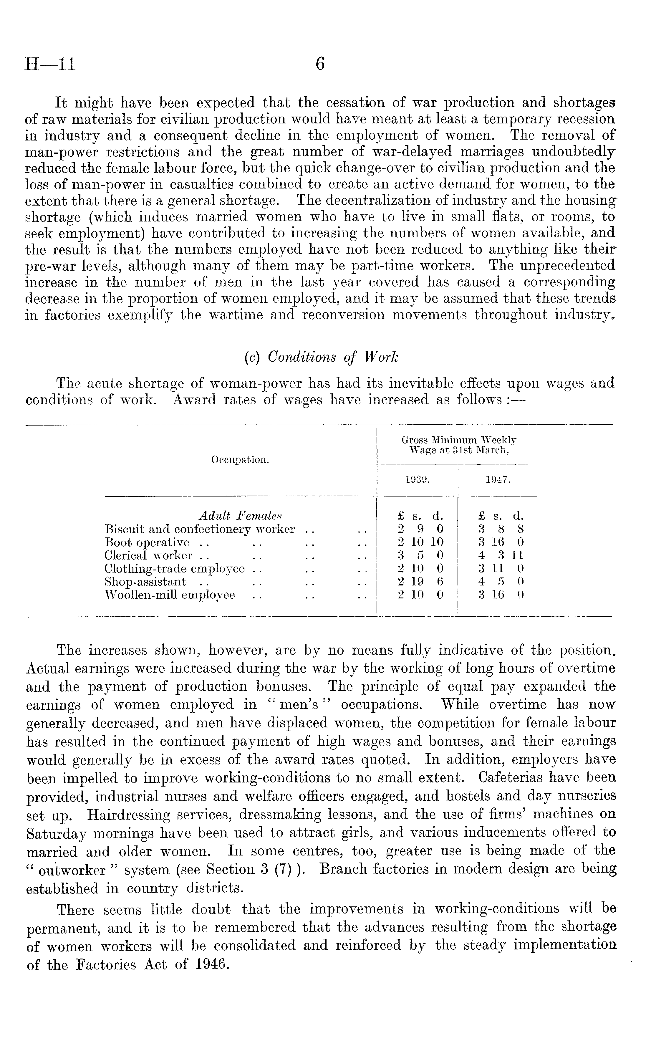 Gross Minimum Weekly Wage at 31st March, Occupation. 1939. 1947. Adult Females £ S. d. £ s. d. Biscuit and confectionery worker 2 9 0 3 8 8 Boot operative 2 10 10 3 16 0 Clerical worker 3 5 0 4 3 11 Clothing-trade employee 2 10 0 3 11 0 Shop-assistant 2 19 6 4 5 0 Woollen-mill employee 2 10 0 3 16 0
