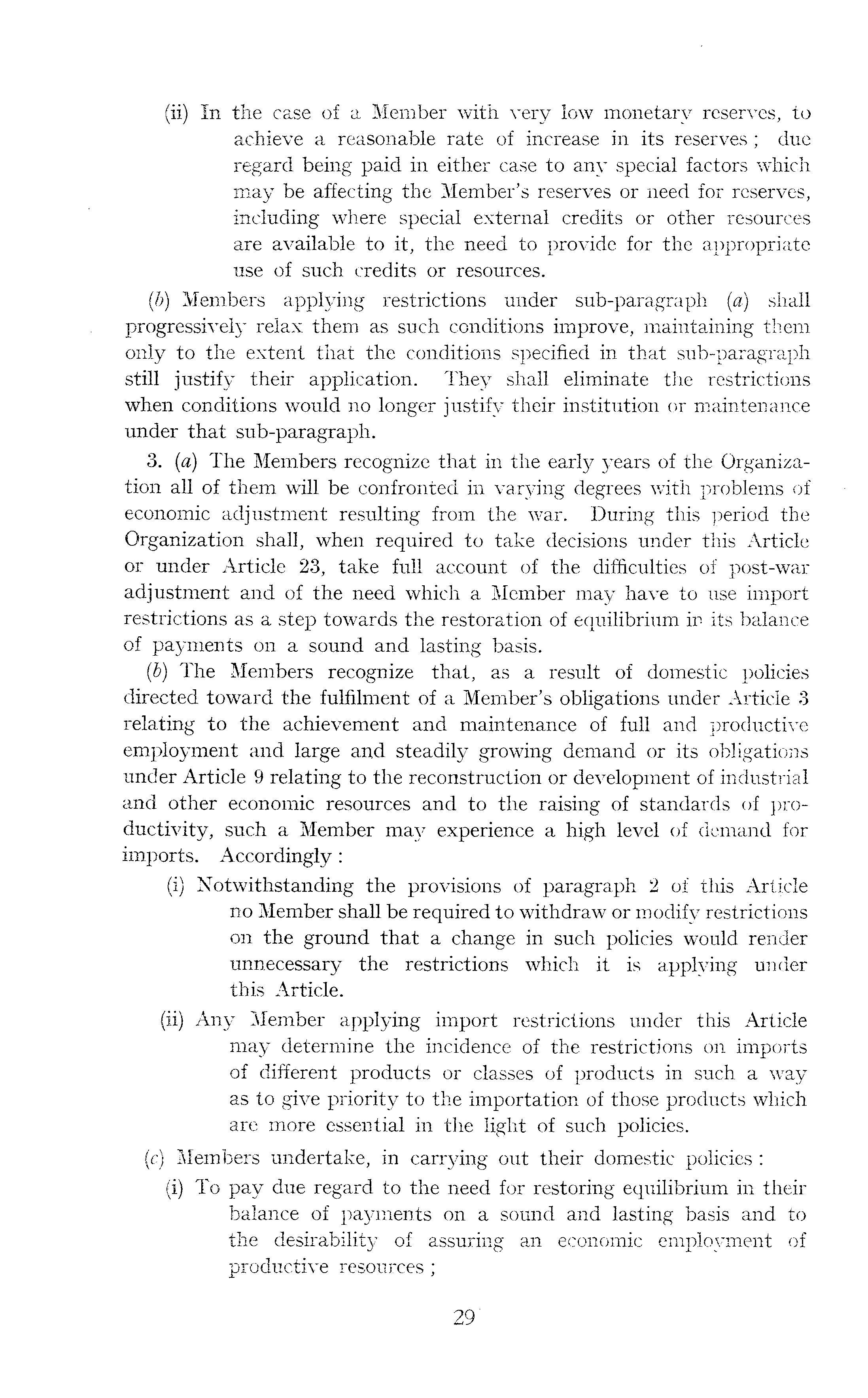 (ii) In the case of a Member with very low monetary reserves, to achieve a reasonable rate of increase in its reserves; due regard being paid in either case to any special factors which may be affecting the Member's reserves or need for reserves, including where special external credits or other resources are available to it, the need to provide for the appropriate use of such credits or resources. (b) Members applying restrictions under sub-paragraph (a) shall progressively relax them as such conditions improve, maintaining them only to the extent that the conditions specified in that sub-paragraph still justify their application. They shall eliminate the restrictions when conditions would no longer justify their institution or maintenance under that sub-paragraph. 3. (a) The Members recognize that in the early years of the Organization all of them will be confronted in varying degrees with problems of economic adjustment resulting from the war. During this period the Organization shall, when required to take decisions under this Article or under Article 23, take full account of the difficulties of post-war adjustment and of the need which a Member may have to use import restrictions as a step towards the restoration of equilibrium ir> its balance of payments on a sound and lasting basis. (b) The Members recognize that, as a result of domestic policies directed toward the fulfilment of a Member's obligations under Article 3 relating to the achievement and maintenance of full and productive employment and large and steadily growing demand or its obligations under Article 9 relating to the reconstruction or development of industrial and other economic resources and to the raising of standards of productivity, such a Member may experience a high level of demand for imports. Accordingly: (i) Notwithstanding the provisions of paragraph 2 of this Article no Member shall be required to withdraw or modify restrictions on the ground that a change in such policies would render unnecessary the restrictions which it is applying under this Article. (ii) Any Member applying import restrictions under this Article may determine the incidence of the restrictions on imports of different products or classes of products in such a way as to give priority to the importation of those products which are more essential in the light of such policies. (c) Members undertake, in carrying out their domestic policies : (i) To pay due regard to the need for restoring equilibrium in their balance of payments on a sound and lasting basis and to the desirability of assuring an economic employment of productive resources;
