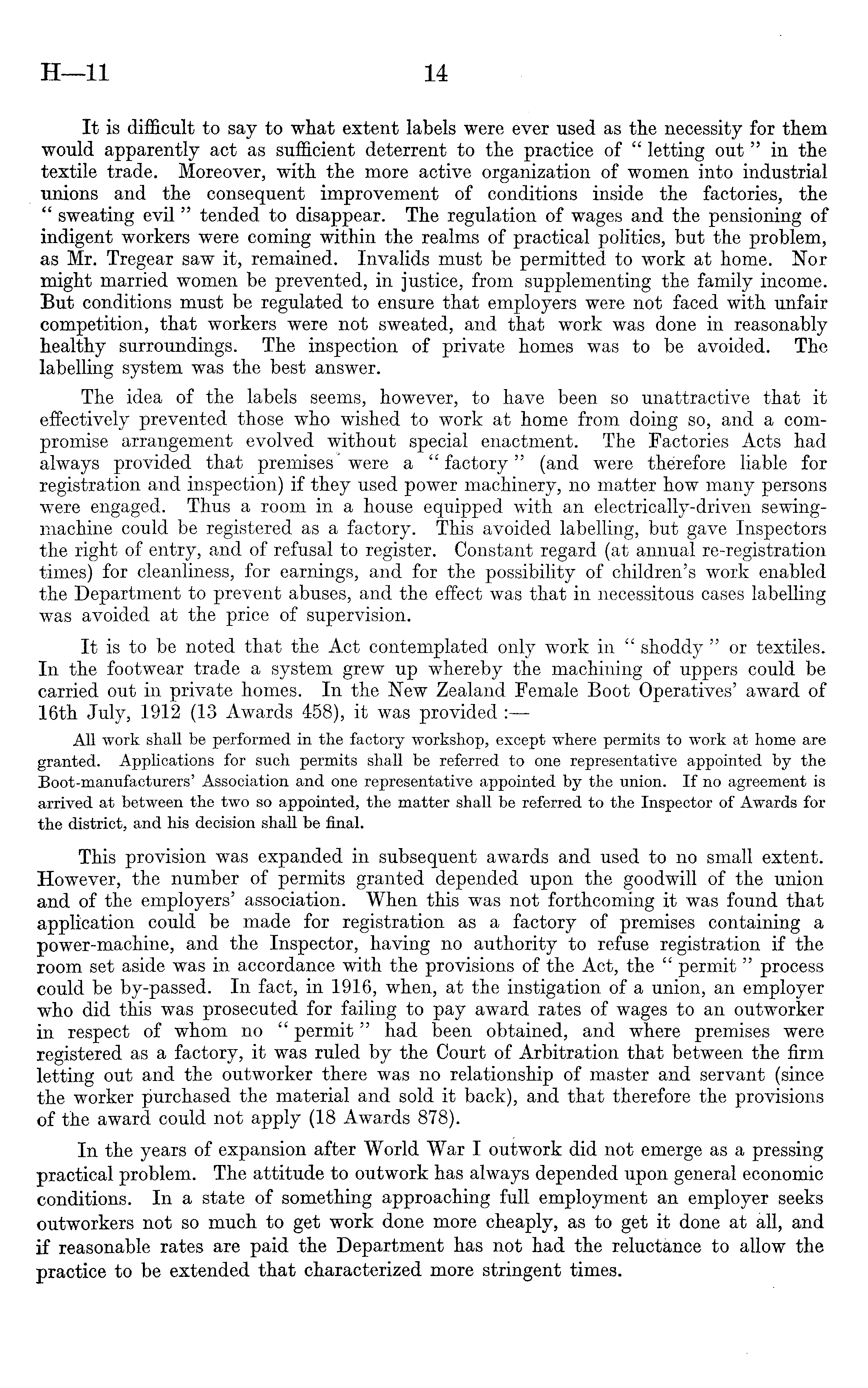 It is difficult to say to what extent labels were ever used as the necessity for them would apparently act as sufficient deterrent to the practice of " letting out" in the textile trade. Moreover, with the more active organization of women into industrial unions and the consequent improvement of conditions inside the factories, the " sweating evil" tended to disappear. The regulation of wages and the pensioning of indigent workers were coming within the realms of practical politics, but the problem, as Mr. Tregear saw it, remained. Invalids must be permitted to work at home. Nor might married women be prevented, in justice, from supplementing the family income. But conditions must be regulated to ensure that employers were not faced with unfair competition, that workers were not sweated, and that work was done in reasonably healthy surroundings. The inspection of private homes was to be avoided. The labelling system was the best answer. The idea of the labels seems, however, to have been so unattractive that it effectively prevented those who wished to work at home from doing so, and a compromise arrangement evolved without special enactment. The Factories Acts had always provided that premises" were a " factory" (and were therefore liable for registration and inspection) if they used power machinery, no matter how many persons were engaged. Thus a room in a house equipped with an electrically-driven sewingmachine could be registered as a factory. This avoided labelling, but gave Inspectors the right of entry, and of refusal to register. Constant regard (at annual re-registration times) for cleanliness, for earnings, and for the possibility of children's work enabled the Department to prevent abuses, and the effect was that in necessitous cases labelling was avoided at the price of supervision. It is to be noted that the Act contemplated only work in " shoddy " or textiles. In the footwear trade a system grew up whereby the machining of uppers could be carried out in private homes. In the New Zealand Female Boot Operatives' award of 16th July, 1912 (13 Awards 458), it was provided : All work shall be performed in the factory workshop, except where permits to work at home are granted. Applications for such permits shall be referred to one representative appointed by the Boot-manufacturers' Association and one representative appointed by the union. If no agreement is arrived at between the two so appointed, the matter shall be referred to the Inspector of Awards for the district, and his decision shall be final. This provision was expanded in subsequent awards and used to no small extent. However, the number of permits granted depended upon the goodwill of the union and of the employers' association. When this was not forthcoming it was found that application could be made for registration as a factory of premises containing a power-machine, and the Inspector, having no authority to refuse registration if the room set aside was in accordance with the provisions of the Act, the " permit " process could be by-passed. In fact, in 1916, when, at the instigation of a union, an employer who did this was prosecuted for failing to pay award rates of wages to an outworker in respect of whom no " permit" had been obtained, and where premises were registered as a factory, it was ruled by the Court of Arbitration that between the firm letting out and the outworker there was no relationship of master and servant (since the worker purchased the material and sold it back), and that therefore the provisions of the award could not apply (18 Awards 878). In the years of expansion after World War I outwork did not emerge as a pressing practical problem. The attitude to outwork has always depended upon general economic conditions. In a state of something approaching full employment an employer seeks outworkers not so much to get work done more cheaply, as to get it done at all, and if reasonable rates are paid the Department has not had the reluctance to allow the practice to be extended that characterized more stringent times.