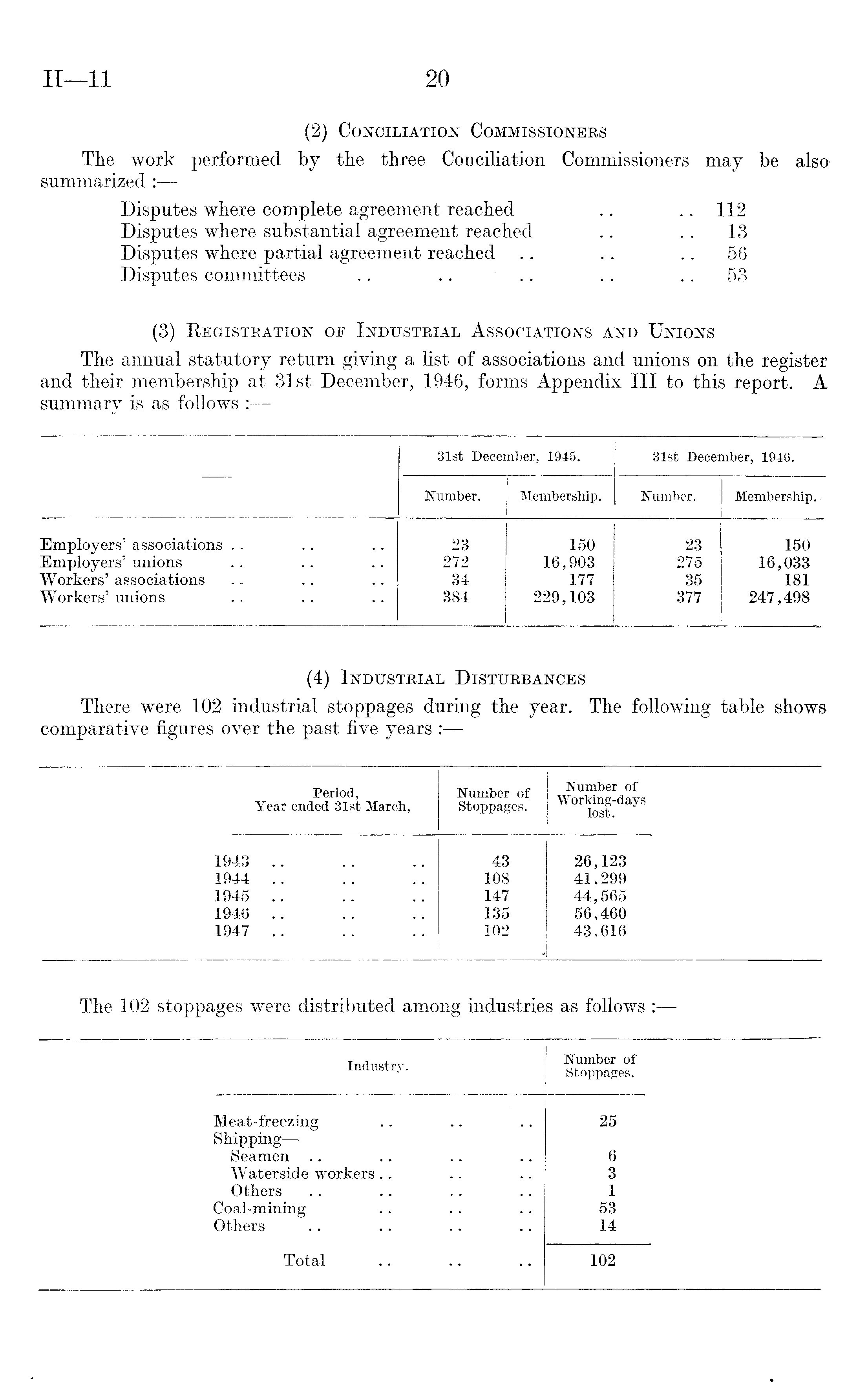 Period, Number of Number of Year ended 31st March, Stoppages. W orking-days lost. 1943 43 26,123 1944 108 41,299 1945 147 44,565 1946 135 56,460 1947 102 43,616