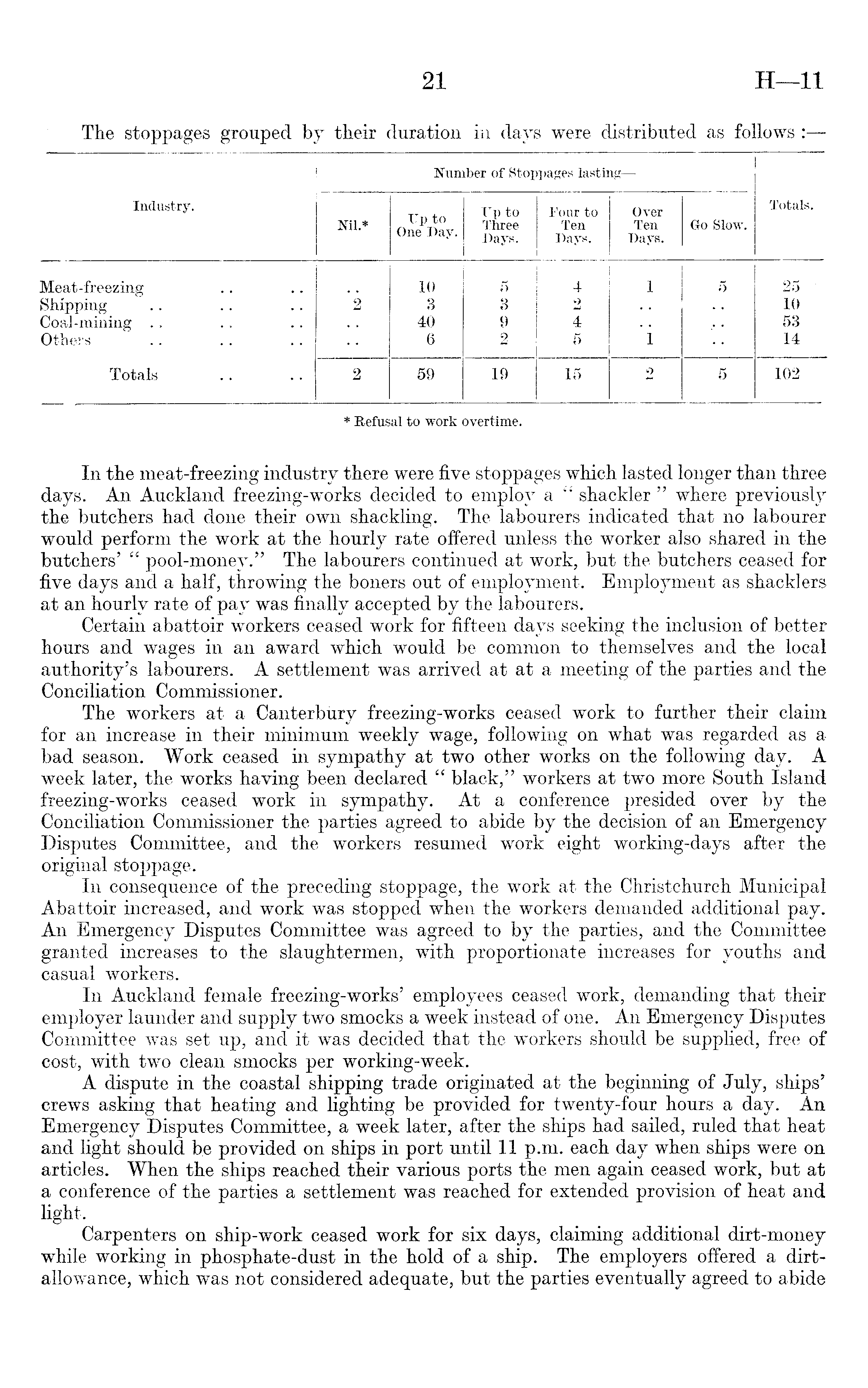 In the meat-freezing industry there were five stoppages which lasted longer than three days. An Auckland freezing-works decided to employ a " shackler " where previously the butchers had done their own shackling. The labourers indicated that no labourer would perform the work at the hourly rate offered unless the worker also shared in the butchers' " pool-money." The labourers continued at work, but the butchers ceased for five days and a half, throwing the boners out of employment. Employment as shacklers at an hourly rate of pay was finally accepted by the labourers. Certain abattoir workers ceased work for fifteen days seeking the inclusion of better hours and wages in an award which would be common to themselves and the local authority's labourers. A settlement was arrived at at a meeting of the parties and the Conciliation Commissioner. The workers at a Canterbury freezing-works ceased work to further their claim for an increase in their minimum weekly wage, following on what was regarded as a bad season. Work ceased in sympathy at two other works on the following day. A week later, the works having been declared " black," workers at two more South Island freezing-works ceased work in sympathy. At a conference presided over by the Conciliation Commissioner the parties agreed to abide by the decision of an Emergency Disputes Committee, and the workers resumed work eight working-days after the original stoppage. In consequence of the preceding stoppage, the work at the Christchurch Municipal Abattoir increased, and work was stopped when the workers demanded additional pay. An Emergency Disputes Committee was agreed to by the parties, and the Committee granted increases to the slaughtermen, with proportionate increases for youths and casual workers. In Auckland female freezing-works' employees ceased work, demanding that their employer launder and supply two smocks a week instead of one. An Emergency Disputes Committee was set up, and it was decided that the workers should be supplied, free of cost, with two clean smocks per working-week. A dispute in the coastal shipping trade originated at the beginning of July, ships' crews asking that heating and lighting be provided for twenty-four hours a day. An Emergency Disputes Committee, a week later, after the ships had sailed, ruled that heat and light should be provided on ships in port until 11 p.m. each day when ships were on articles. When the ships reached their various ports the men again ceased work, but at a conference of the parties a settlement was reached for extended provision of heat and light. Carpenters on ship-work ceased work for six days, claiming additional dirt-money while working in phosphate-dust in the hold of a ship. The employers offered a dirtallowance, which was not considered adequate, but the parties eventually agreed to abide